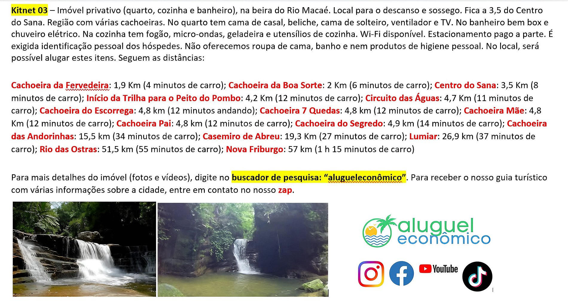 Private property (bedroom, kitchen and bathroom), on the banks of the Macaé River. Place for rest and tranquility. It is 3.5 from the Center of Sana. Region with several waterfalls. The bedroom has a double bed, bunk bed, single bed, fan and TV. In the bathroom there is a box and electric shower. The kitchen has a stove, microwave, refrigerator and kitchen utensils. WiFi available. Parking paid separately. Personal identification is required . We do not offer linen or personal hygiene products.