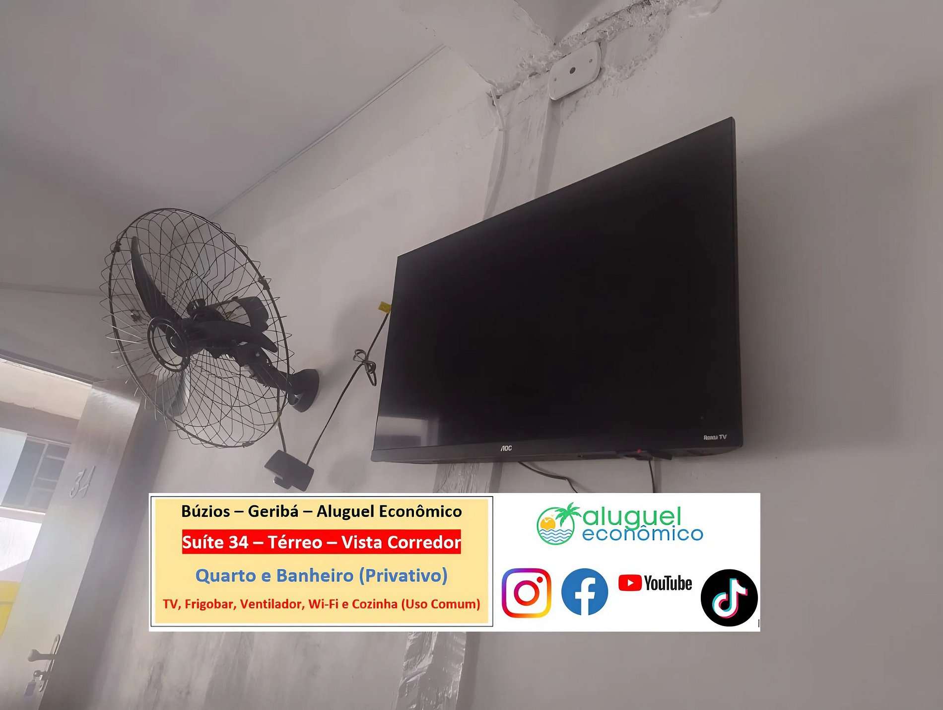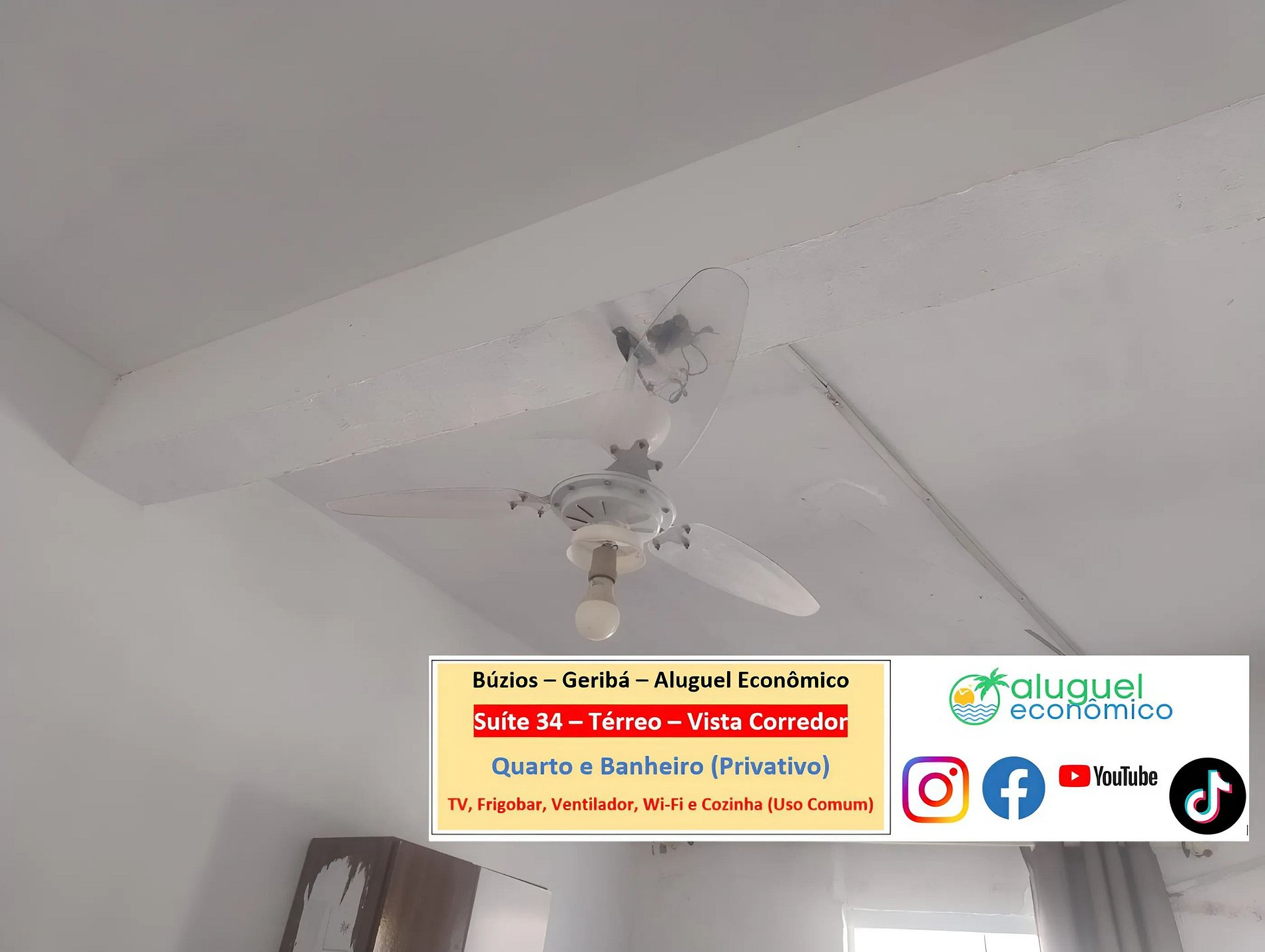 Private property (bedroom and bathroom) on the ground floor. It is 600 meters from Geribá Beach. Window with internal view (parking). In the bedroom, there is a double bed and two single sofa beds, fan, TV, minibar. In the bathroom, there is a box with an electric shower. There is a kitchen, for common use, with stove, microwave oven, blender, sandwich maker, Airfryer, coffee maker and kitchen utensils. Free Wi-Fi. Parking paid separately. Personal identification is required for guests.