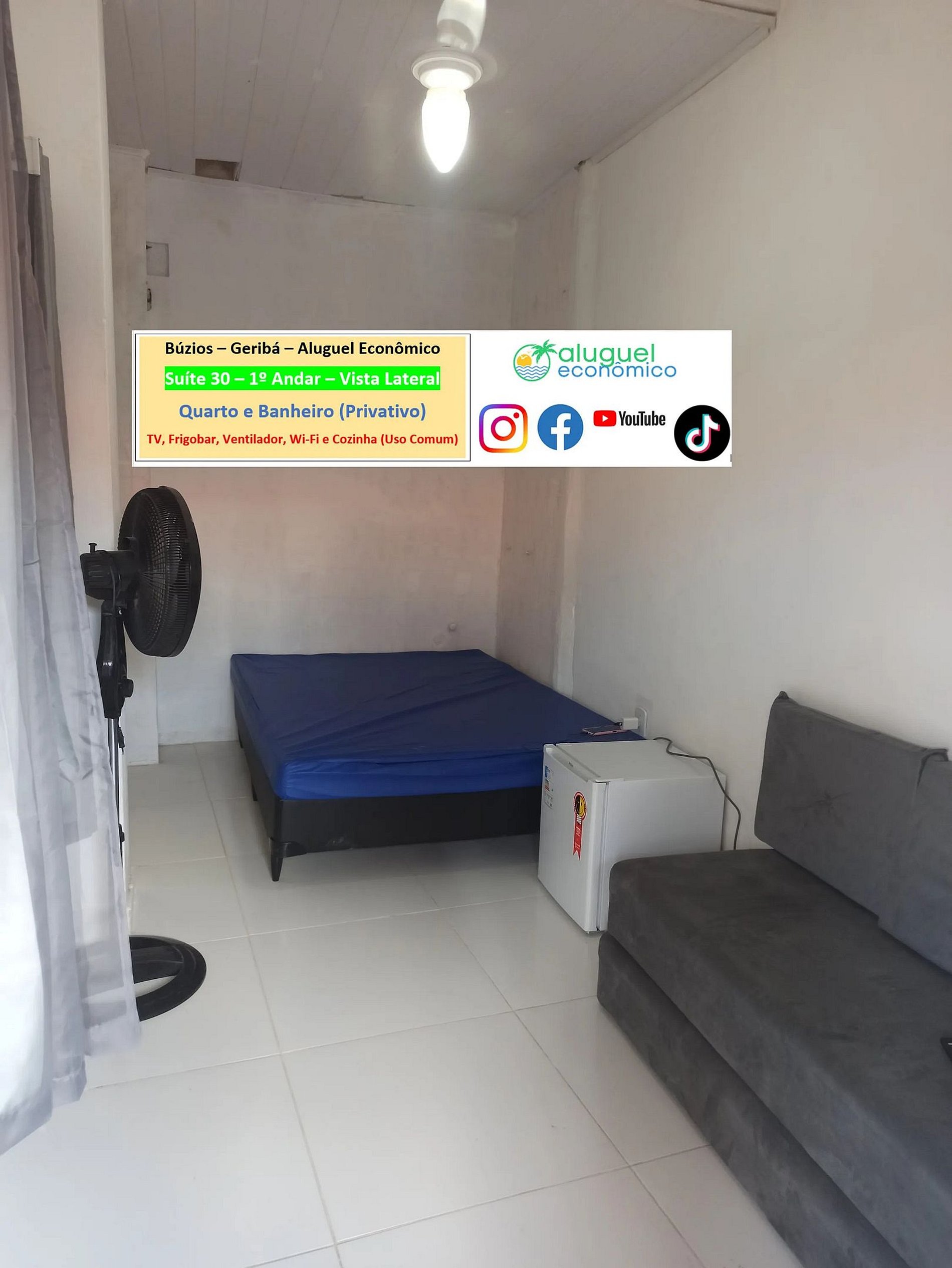 Private property (bedroom and bathroom) on the 1st floor with stairs required. It is 600 meters from Geribá Beach. Window overlooking the side. In the room, there is a double bed, single sofa bed, fan, TV, minibar. In the bathroom, there is a box with an electric shower. There is a kitchen, for common use, with stove, microwave oven, blender, sandwich maker, Airfryer, coffee maker and kitchen utensils. Free Wi-Fi. Parking paid separately. Personal identification is required for guests.