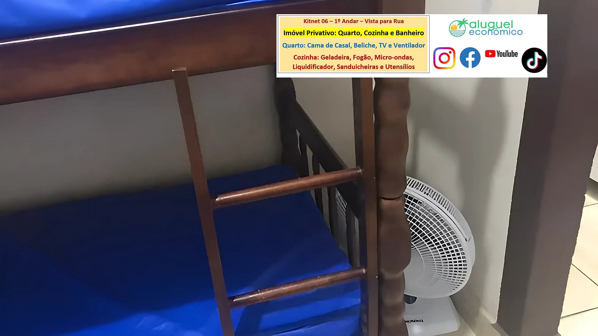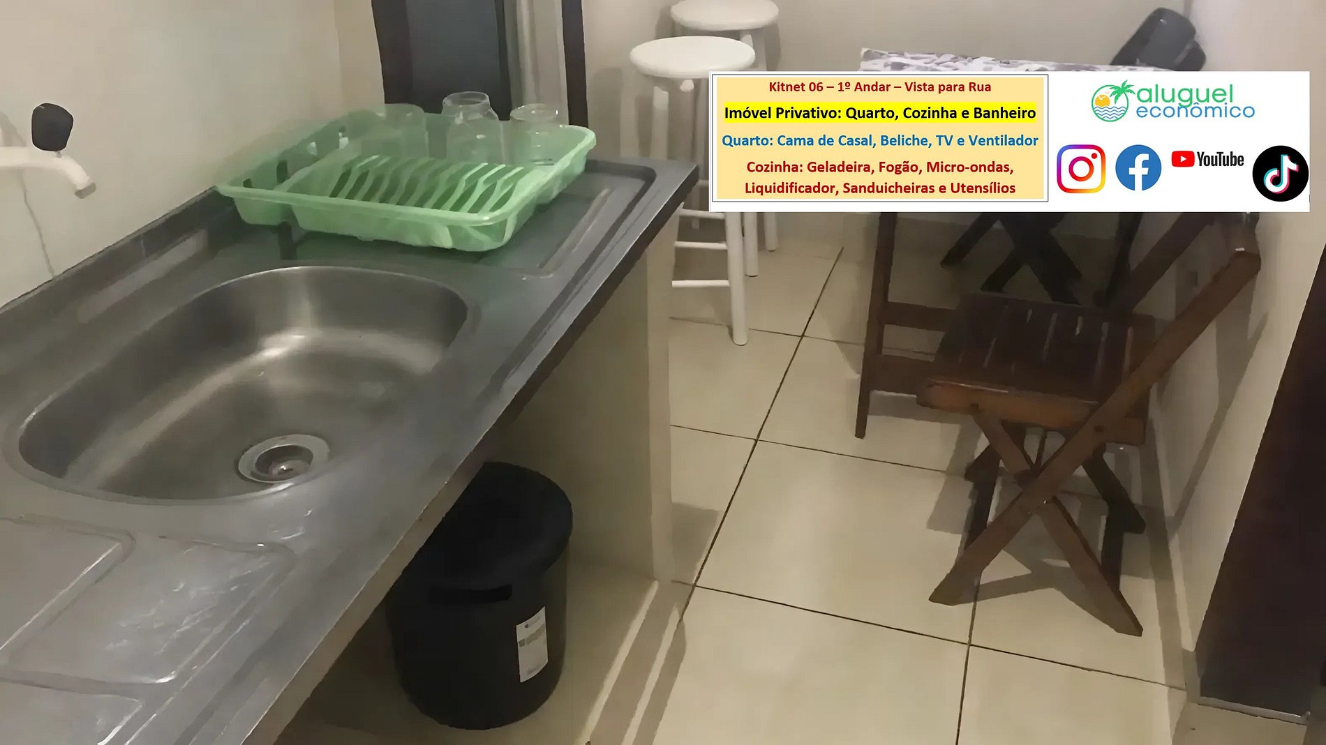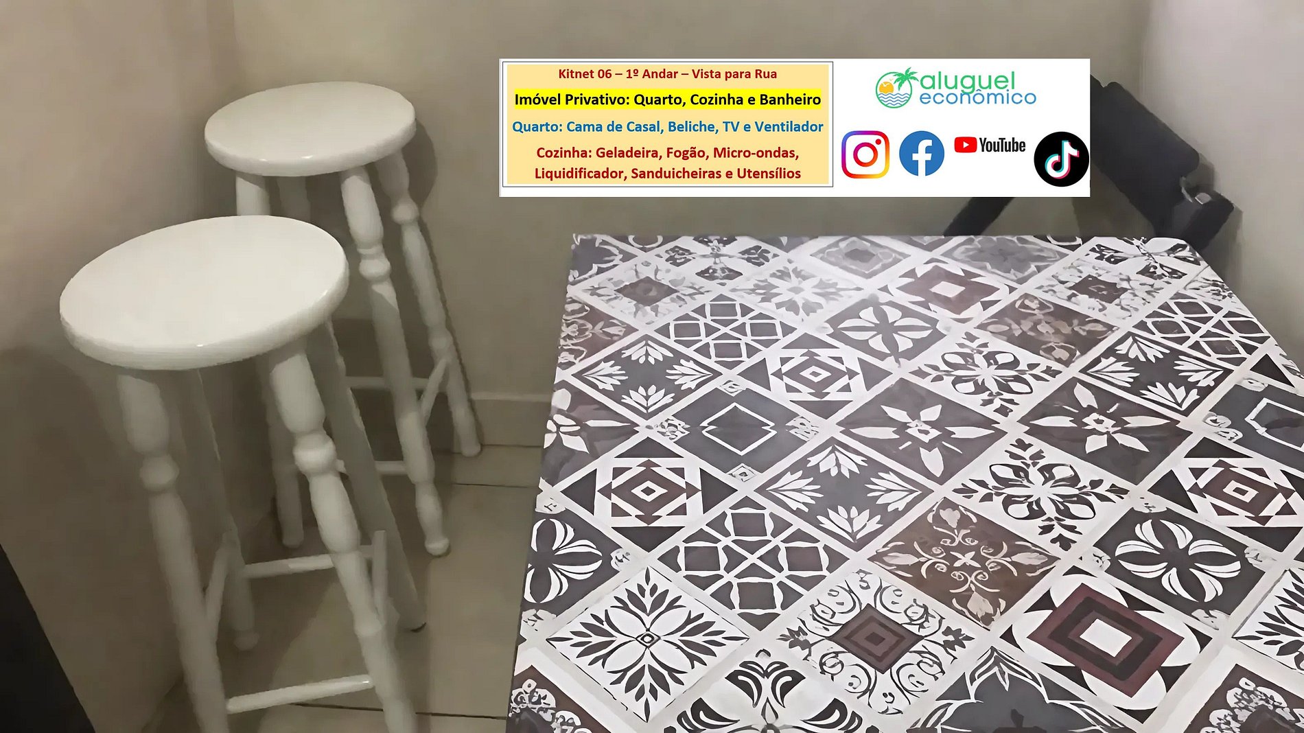 Private kitnet with bedroom, kitchen and bathroom. In the bedroom there is a double bed, bunk bed, TV and fan. Kitchen with refrigerator, stove, microwave, sandwich maker, blender, kitchen utensils. Bathroom with shower and electric shower. There is Wi-Fi. The building is behind the police station, making it a safe place to leave your vehicle on the street for free. The property is on the first floor, having to climb stairs. Window overlooking the street. Layette not included.