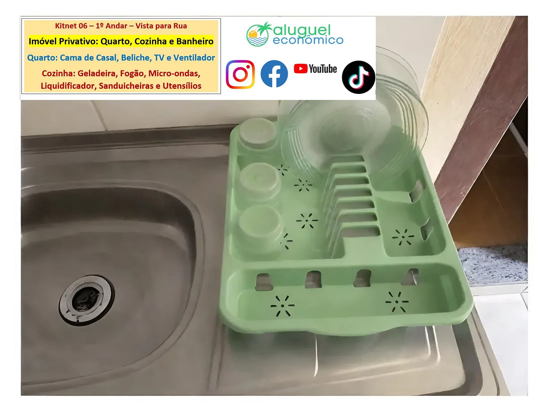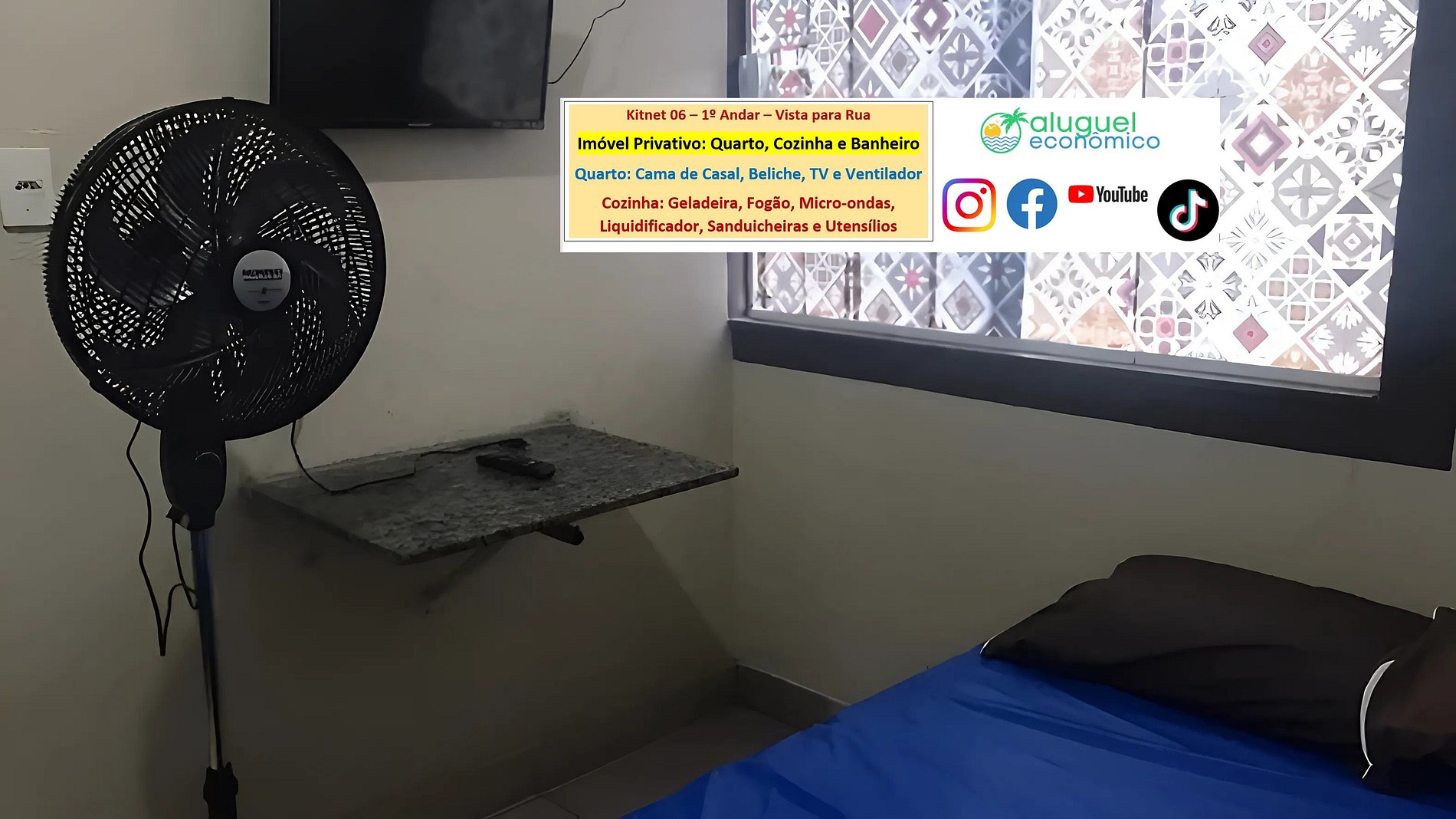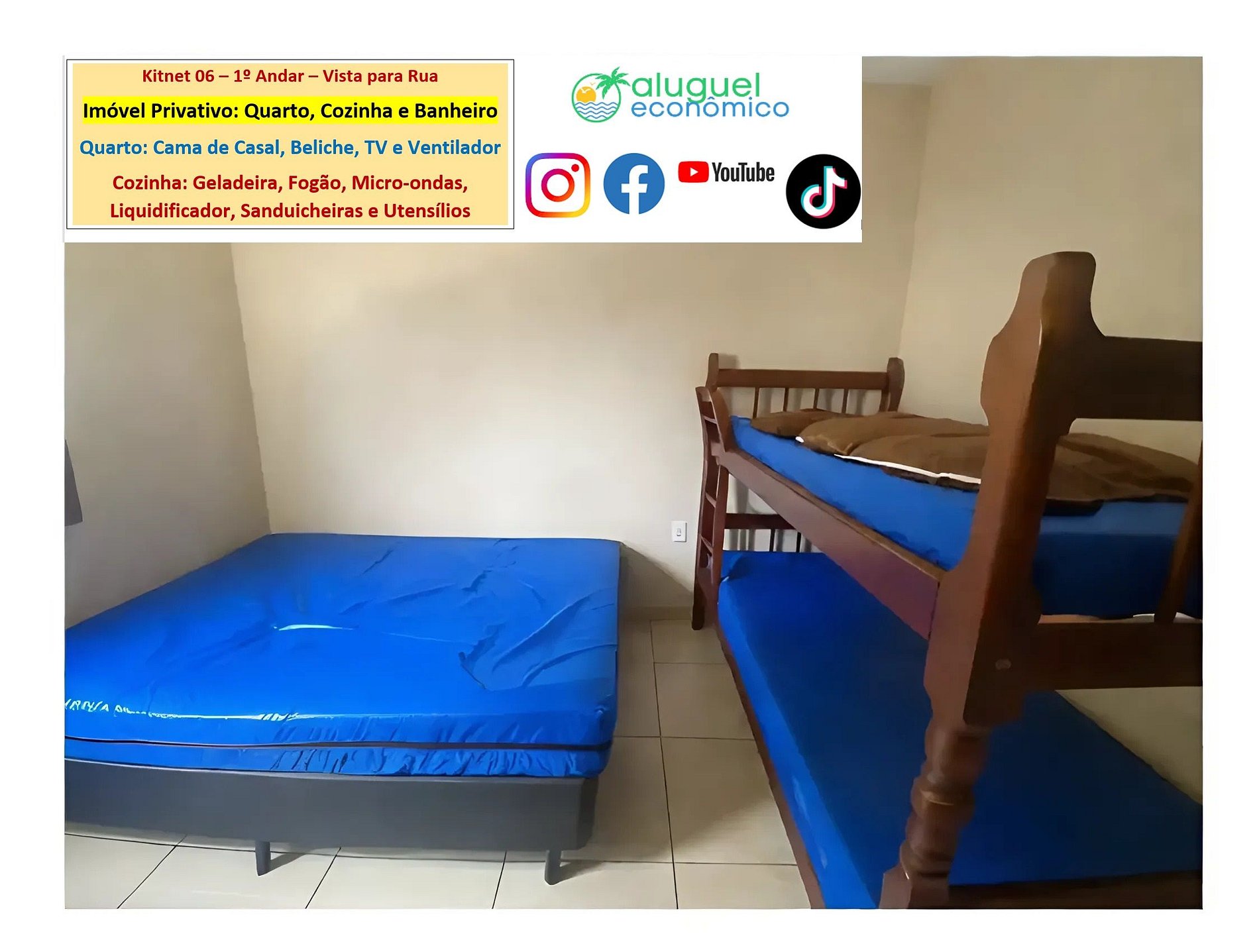 Private kitnet with bedroom, kitchen and bathroom. In the bedroom there is a double bed, bunk bed, TV and fan. Kitchen with refrigerator, stove, microwave, sandwich maker, blender, kitchen utensils. Bathroom with shower and electric shower. There is Wi-Fi. The building is behind the police station, making it a safe place to leave your vehicle on the street for free. The property is on the first floor, having to climb stairs. Window overlooking the street. Layette not included.