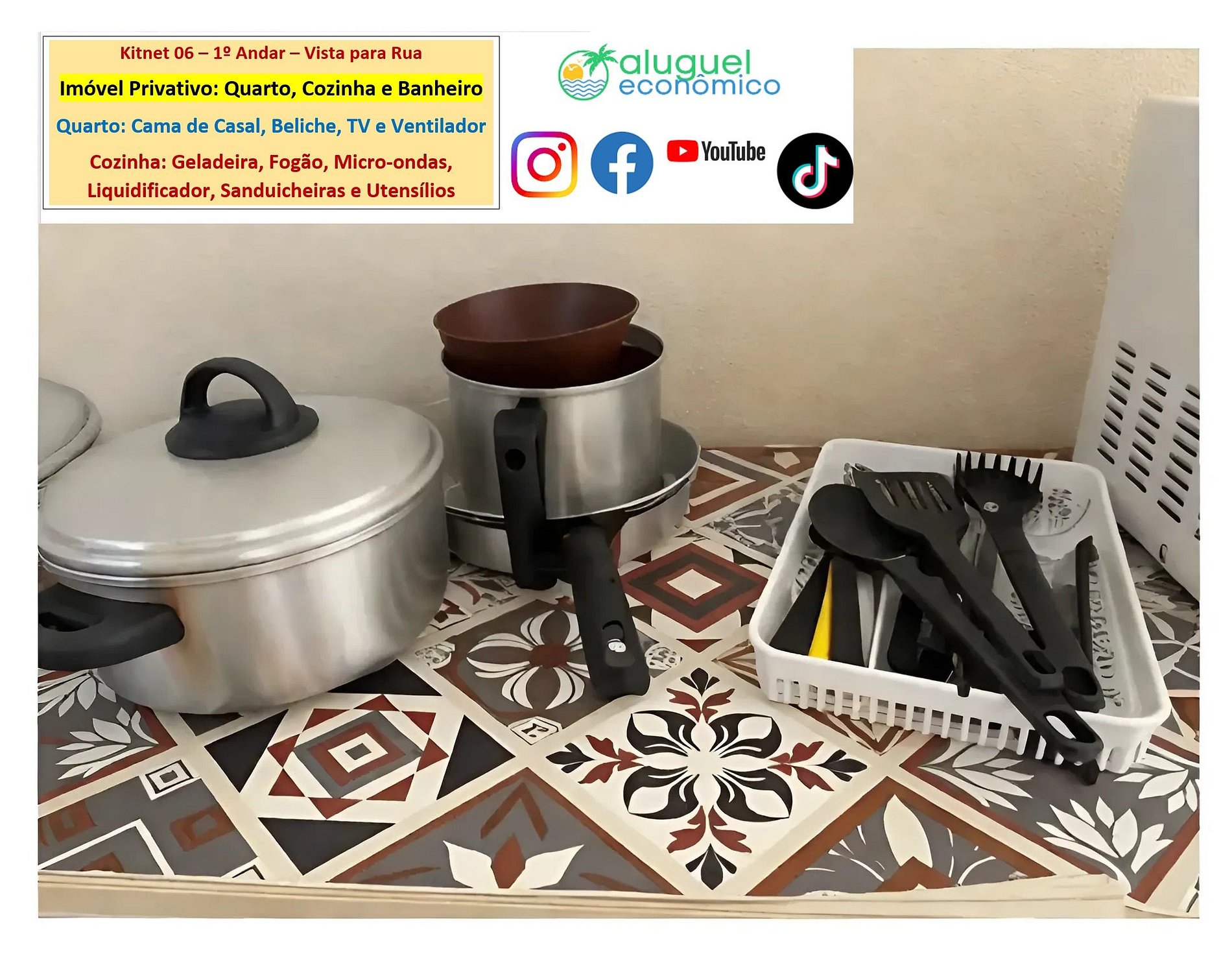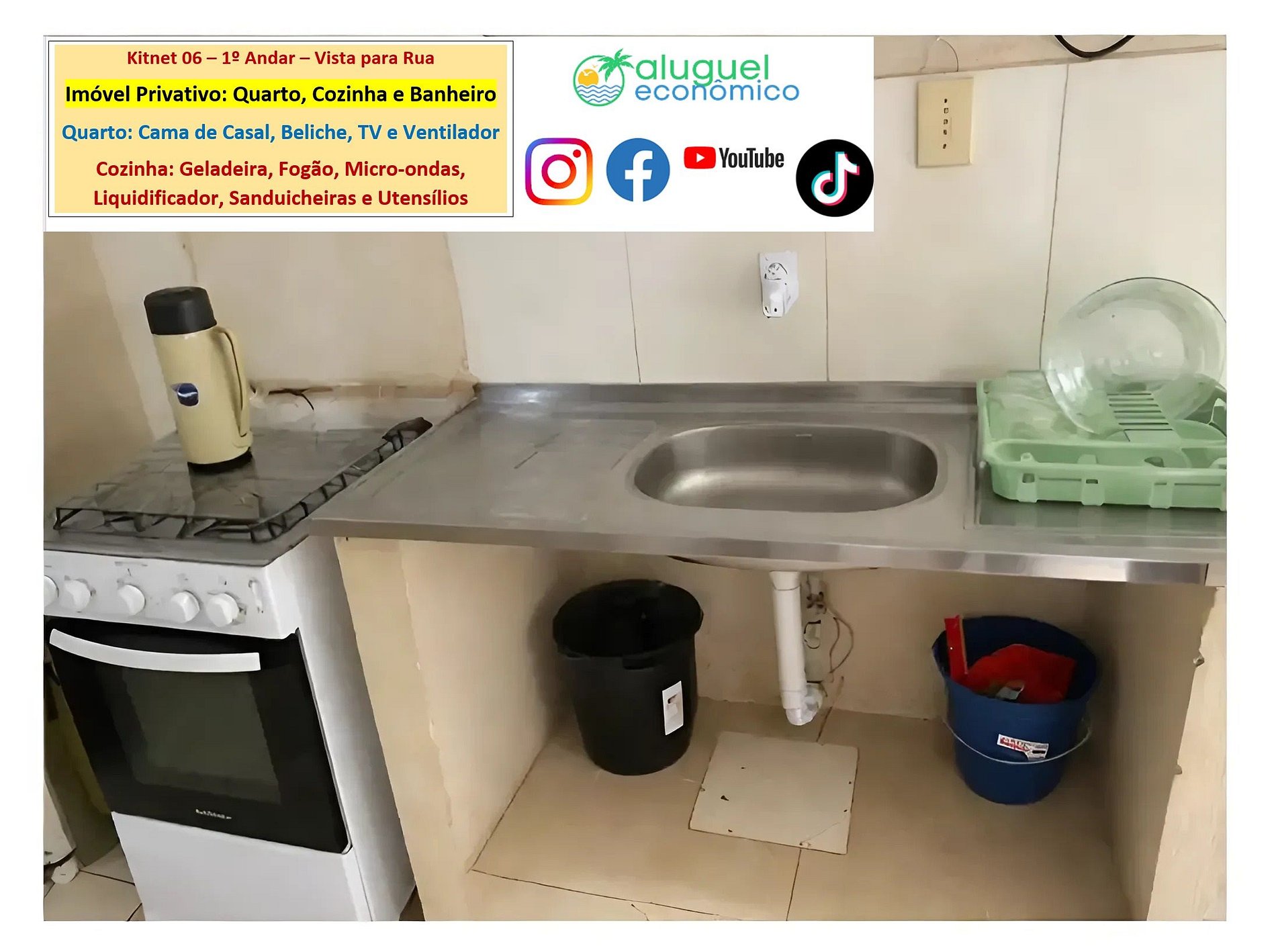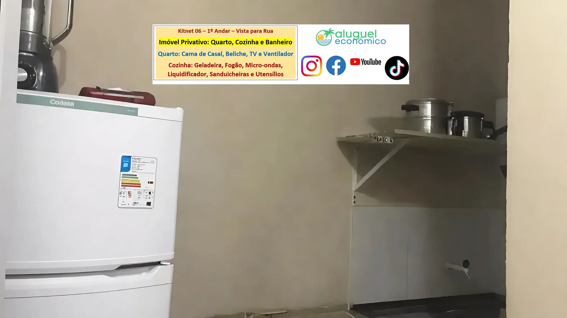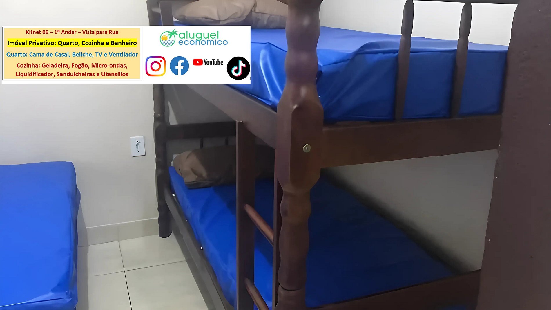 Private kitnet with bedroom, kitchen and bathroom. In the bedroom there is a double bed, bunk bed, TV and fan. Kitchen with refrigerator, stove, microwave, sandwich maker, blender, kitchen utensils. Bathroom with shower and electric shower. There is Wi-Fi. The building is behind the police station, making it a safe place to leave your vehicle on the street for free. The property is on the first floor, having to climb stairs. Window overlooking the street. Layette not included.