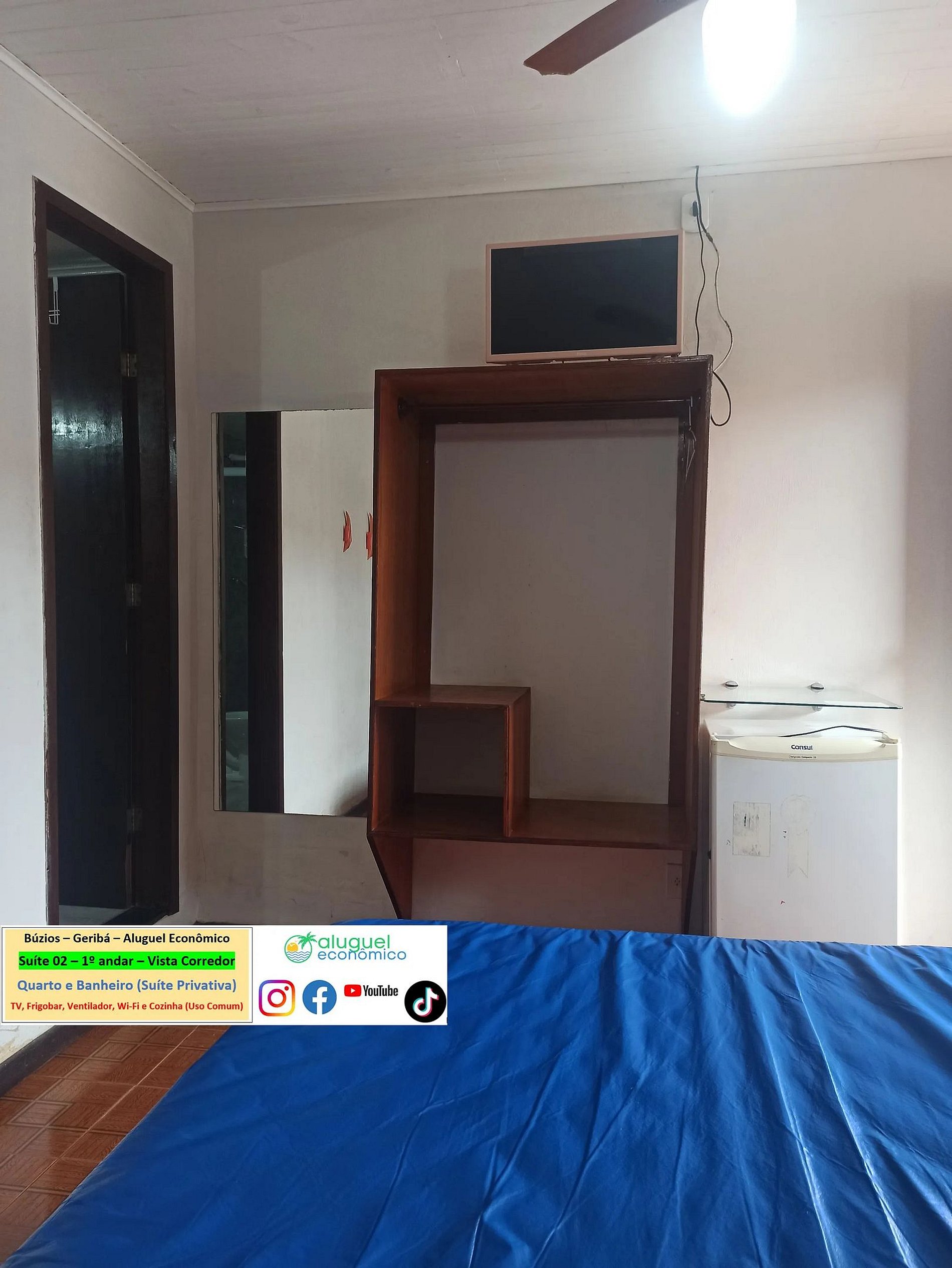 Private property (bedroom and bathroom) on the 1st floor with stairs required. It is 600 meters from Geribá Beach. Window overlooking the hallway. In the bedroom, there is a double bed, 2 single sofa beds, closet, fan, TV, minibar. In the bathroom, there is a box with an electric shower. There is a kitchen, for common use, with stove, microwave oven, blender, sandwich maker, Airfryer, coffee maker and kitchen utensils. Free Wi-Fi. Parking paid separately. Personal identification is required.
