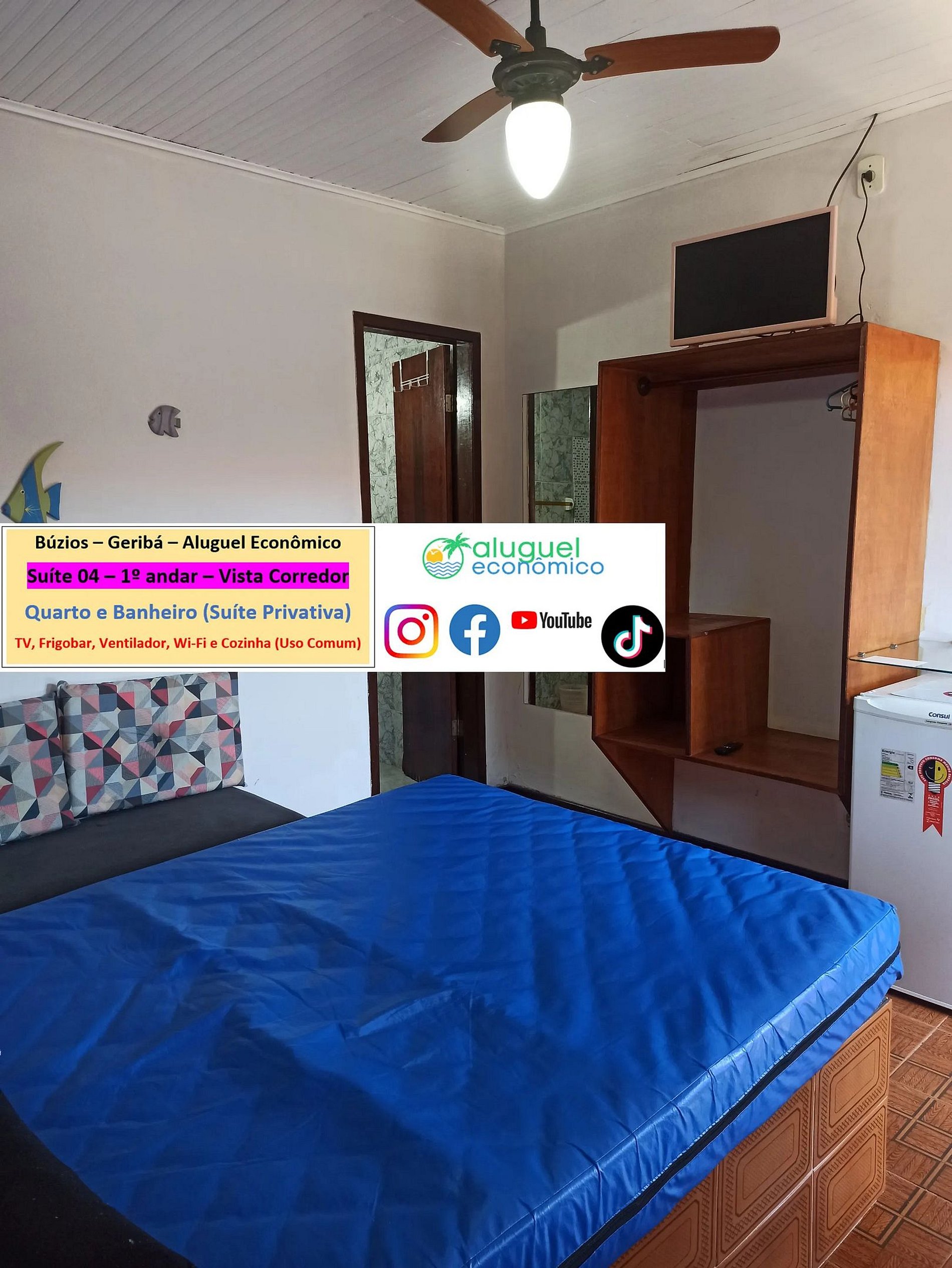 Private property (bedroom and bathroom) on the 1st floor with stairs required. It is 600 meters from Geribá Beach. Window overlooking the hallway. In the bedroom, there is a double bed, 2 single sofa beds, closet, fan, TV, minibar. In the bathroom, there is a box with an electric shower. There is a kitchen, for common use, with stove, microwave oven, blender, sandwich maker, Airfryer, coffee maker and kitchen utensils. Free Wi-Fi. Parking paid separately. Personal identification is required.