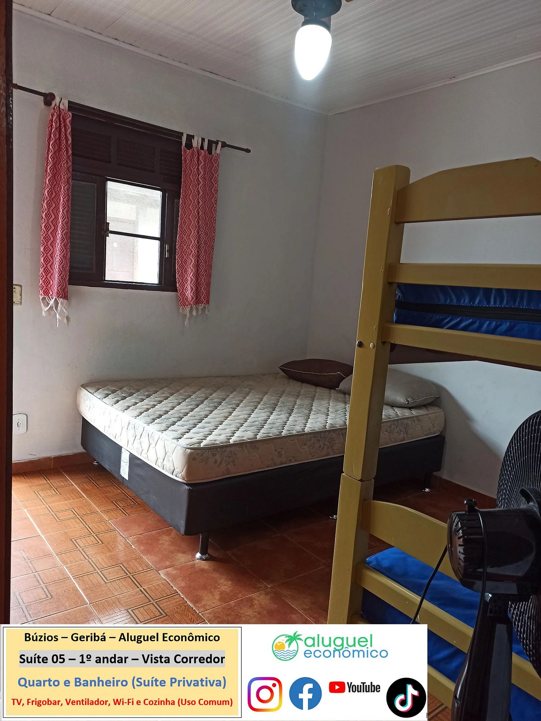 Private property (bedroom and bathroom) on the 1st floor with stairs required. It is 600 meters from Geribá Beach. Window overlooking the hallway. In the bedroom, there is a double bed, bunk bed, closet, fan, TV, minibar. In the bathroom, there is a box with an electric shower. There is a kitchen, for common use, with stove, microwave oven, blender, sandwich maker, Airfryer, coffee maker and kitchen utensils. Free Wi-Fi. Parking paid separately. Personal identification is required from guests.