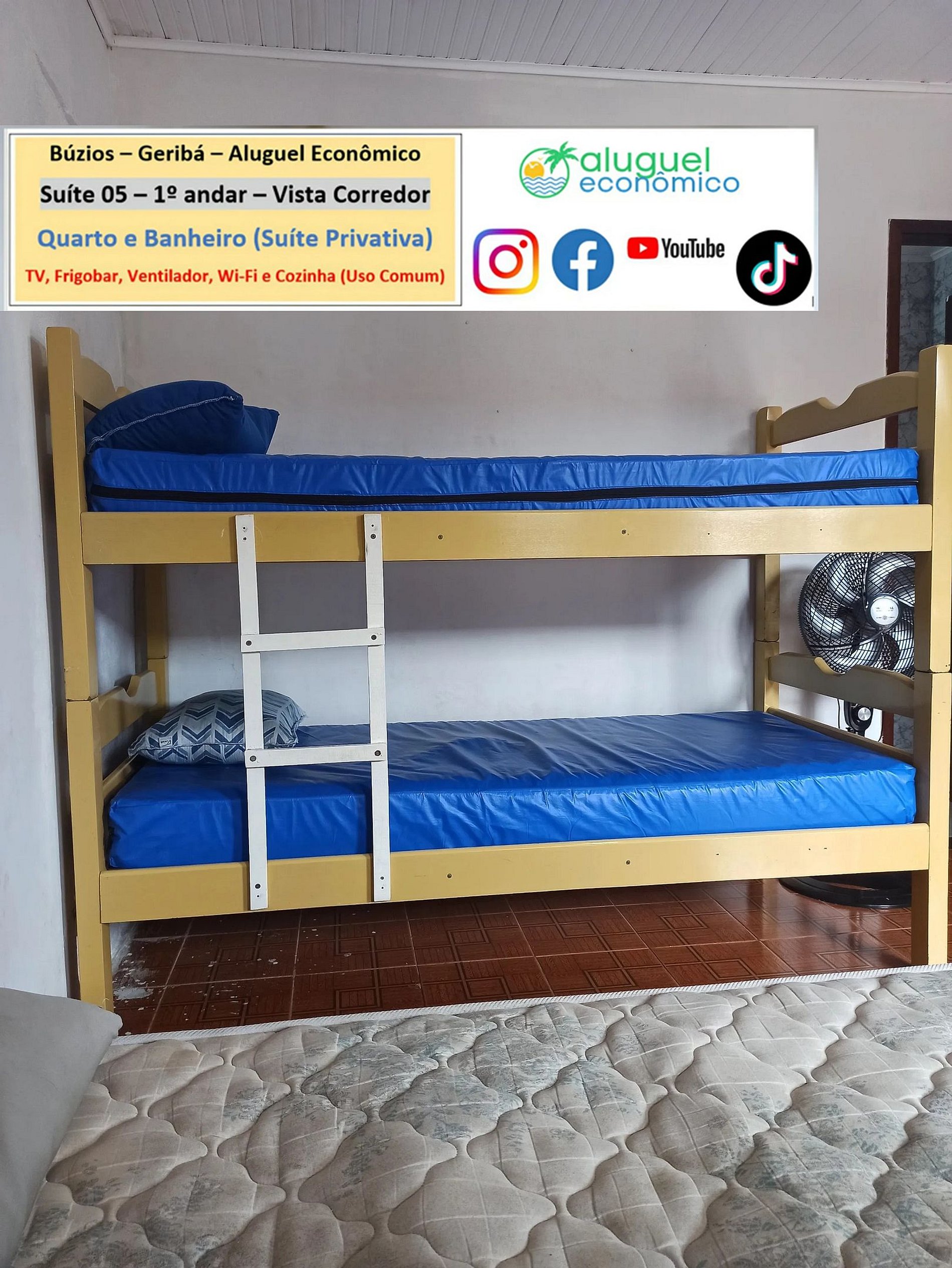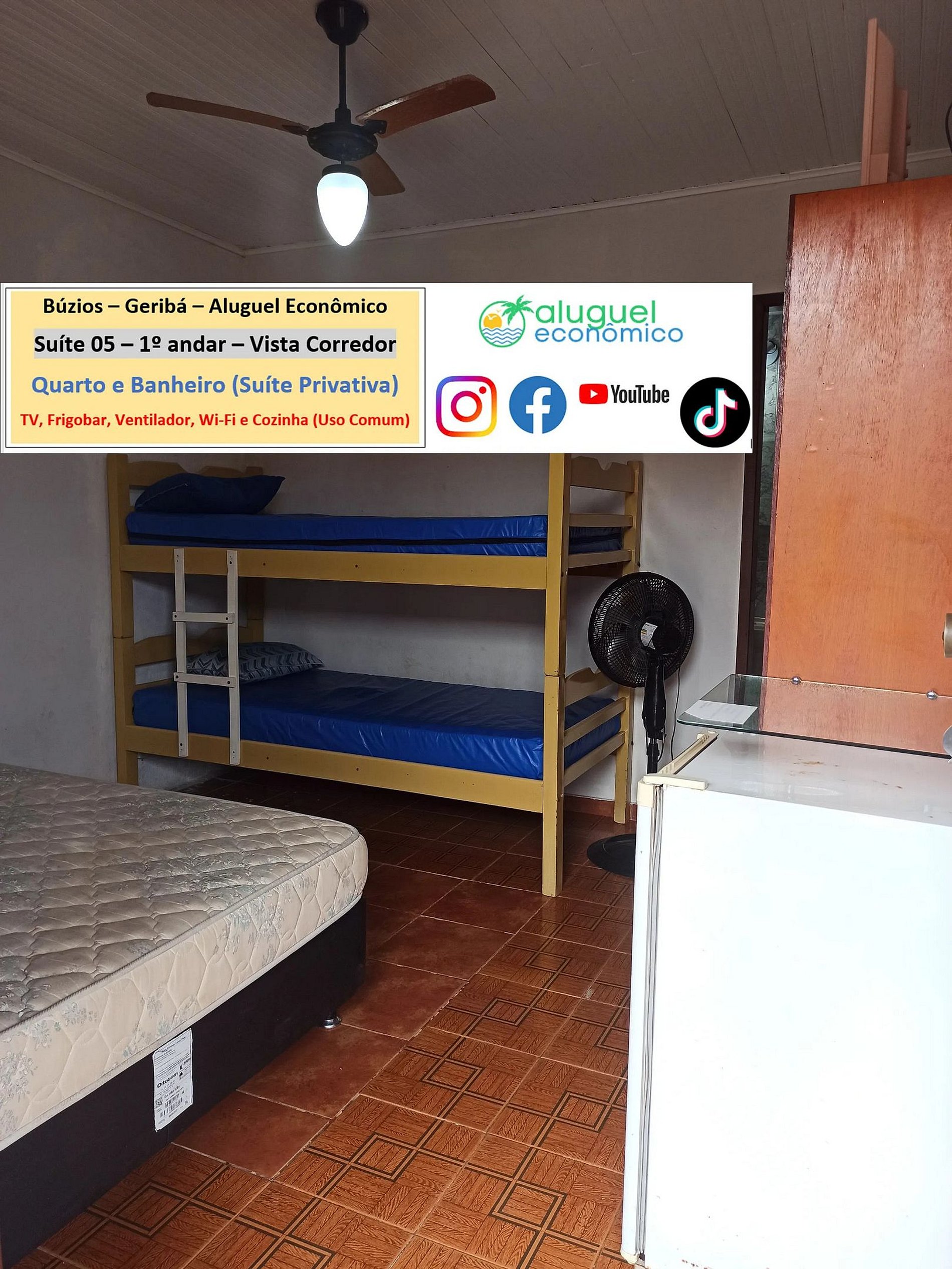 Private property (bedroom and bathroom) on the 1st floor with stairs required. It is 600 meters from Geribá Beach. Window overlooking the hallway. In the bedroom, there is a double bed, bunk bed, closet, fan, TV, minibar. In the bathroom, there is a box with an electric shower. There is a kitchen, for common use, with stove, microwave oven, blender, sandwich maker, Airfryer, coffee maker and kitchen utensils. Free Wi-Fi. Parking paid separately. Personal identification is required from guests.