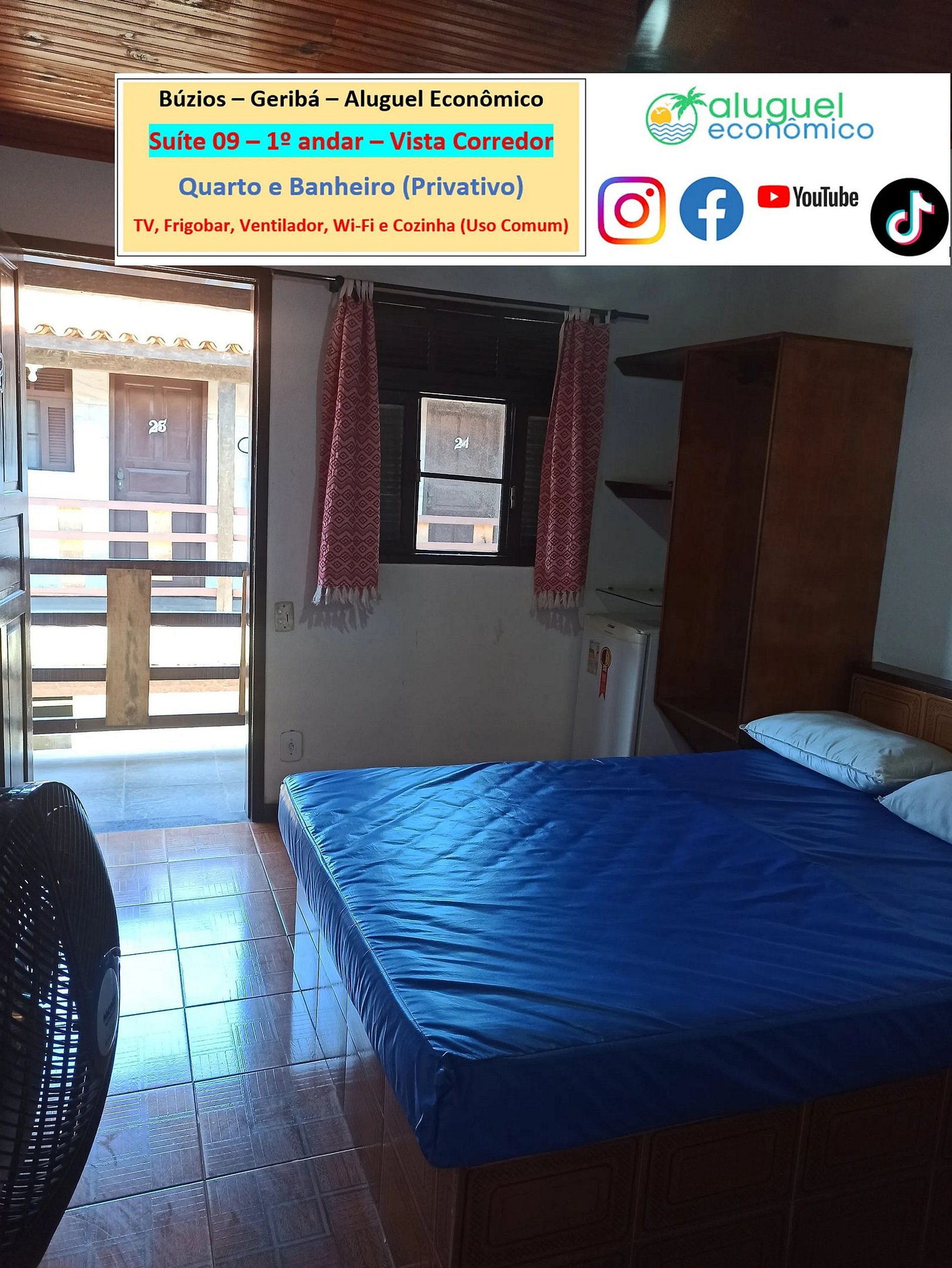Private property (bedroom and bathroom) on the 1st floor with stairs required. It is 600 meters from Geribá Beach. Window overlooking the hallway. In the bedroom, there is a double bed, 2 single sofa beds, closet, fan, TV, minibar. In the bathroom, there is a box with an electric shower. There is a kitchen, for common use, with stove, microwave oven, blender, sandwich maker, Airfryer, coffee maker and kitchen utensils. Free Wi-Fi. Parking paid separately. Personal identification is required.