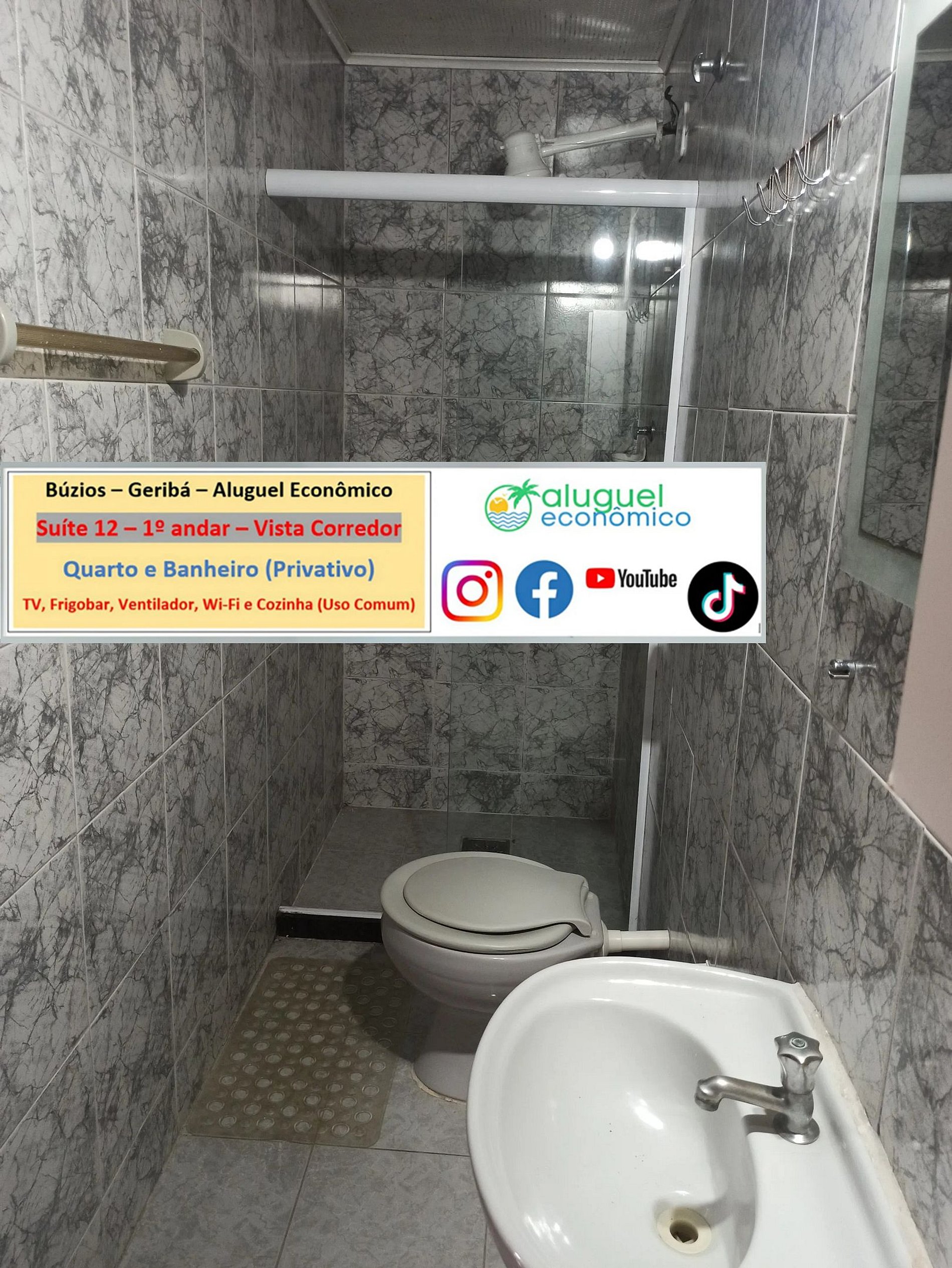 Private property (bedroom and bathroom) on the 1st floor with stairs required. It is 600 meters from Geribá Beach. Window overlooking the hallway. In the bedroom, there are two single beds and two single sofa beds, closet, fan, TV, minibar. In the bathroom, there is a box with an electric shower. There is a kitchen, for common use, with stove, microwave oven, blender, sandwich maker, Airfryer, coffee maker and kitchen utensils. Free Wi-Fi. Paid parking. Guest identification is required.