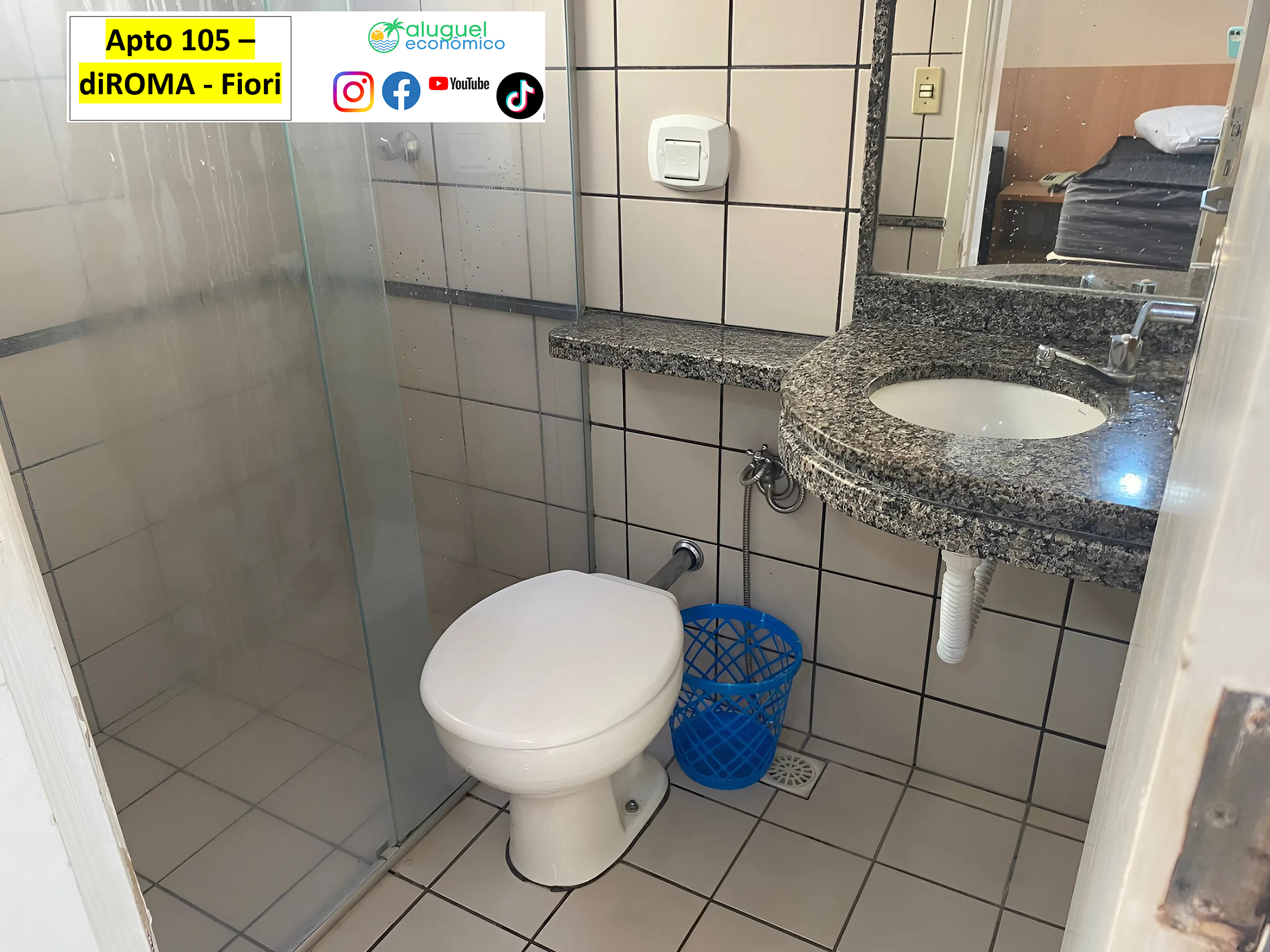 O apartamento 105 fica no térreo, é de 1 quarto , com cama de casal, ar condicionado, ventilador de teto, armário, criados-mudo e TV, banheiro com box blindex, sala com um sofá. cama com uma bicama, bancada com duas banquetas, ventilador, televisão de 20’ que pode ser assistida no quarto ou na sala, cozinha com geladeira, fogão, micro-ondas e armários com utensílios de cozinha, na área de serviço há tanque e pequeno varal.