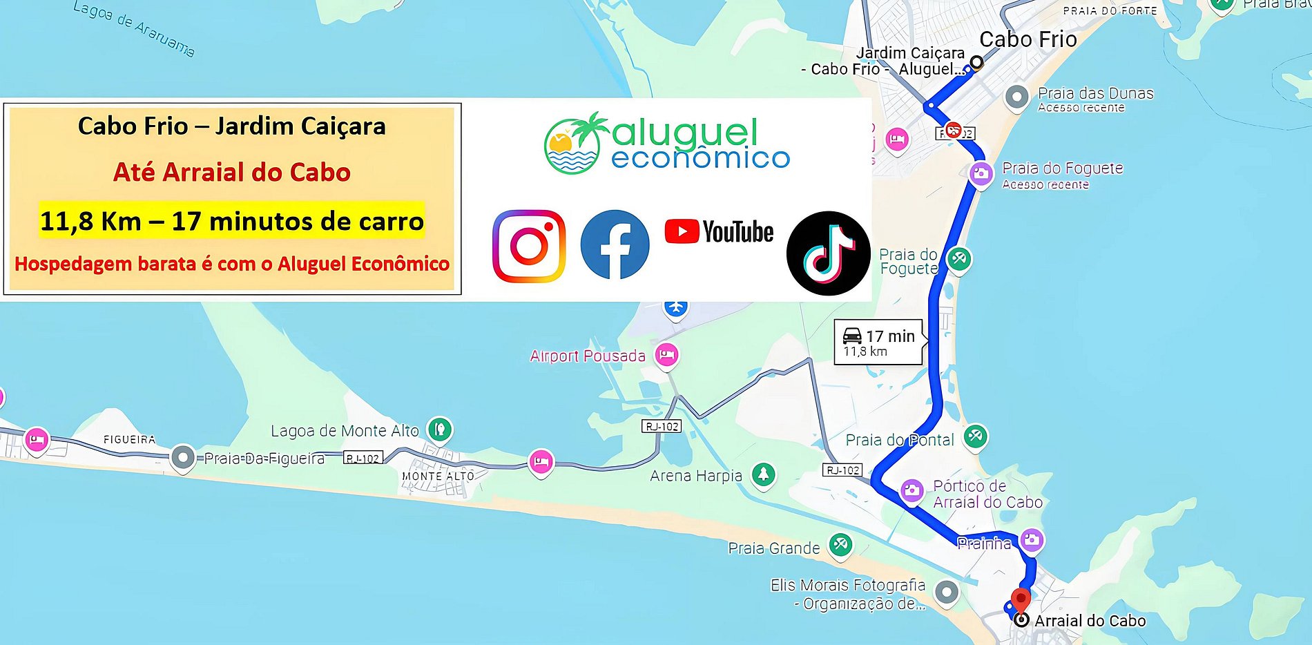 The location is excellent, as it is close to the Center of Cabo Frio, where there is a vast commerce with markets, restaurants, bakeries, pharmacies and shops. It is on a quiet street and excellent for rest. It is close to the city's main attractions. Here are the distances: Cabo Frio Bus Station: 1.2 KM (3 minutes by car) Praia das Dunas: 800 meters (11 minutes walk) Praia do Forte: 1 km (13 minutes walk) Praia do Foguete: 4 km (7 minutes by car) Peró Beach: 8 km (16 minutes by car) Praia das Conchas: 9 km (21 minutes walk) Arraial do Cabo: 12 km (15 minutes by car) Armação de Búzios: 25 km (42 minutes by car)