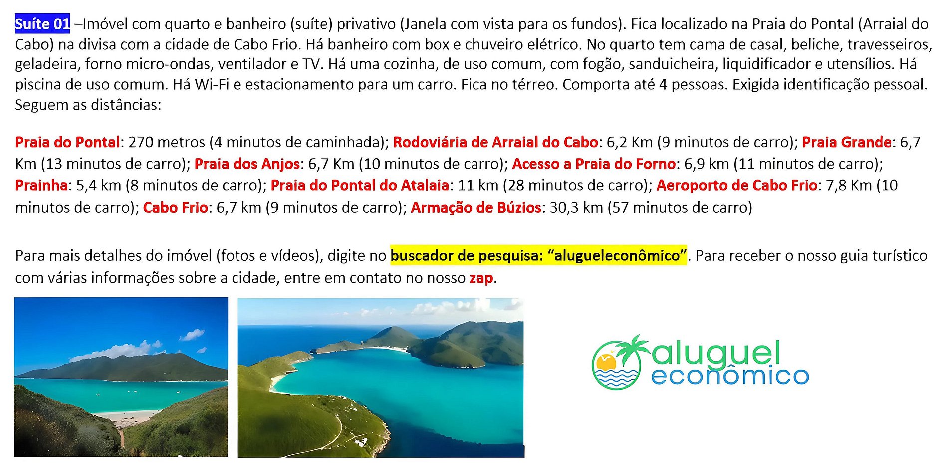 Accommodation Address: RJ-140 - Praia do Pontal, Arraial do Cabo - RJ (Subuai Village Arraial do Cabo) For more information about this property, please access the following link: https://www.alugueleconomico.com.br/pt/ Follow the contact details for more information about hosting: Margarete: 21 96754-7506 (Key delivery) Mara: 21 98107-1377 Carlos Eduardo: 21 98099-1377 Our email is as follows: atendimento@alugueleconomico.com.br Follow us on our social networks: Facebook page: https://www.facebook.com/alugueleconomicooficial Our Facebook group (Aluguel Economico): https://www.facebook.com/groups/184418835538966 Our Instagram page: https://www.instagram.com/alugueleconomico_pessoa/ Personal profile on Facebook: https://www.facebook.com/carloseduardobarros.leite.77 TikTok page: https://www.tiktok.com/@alugueleconomico_oficial