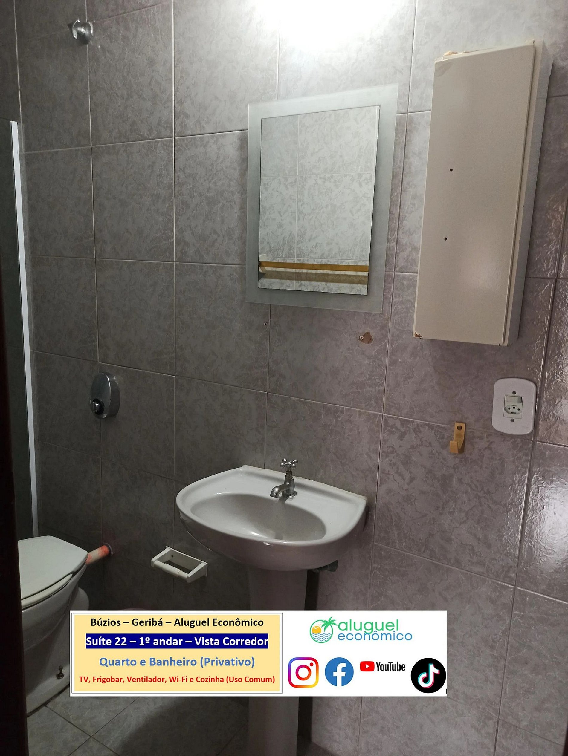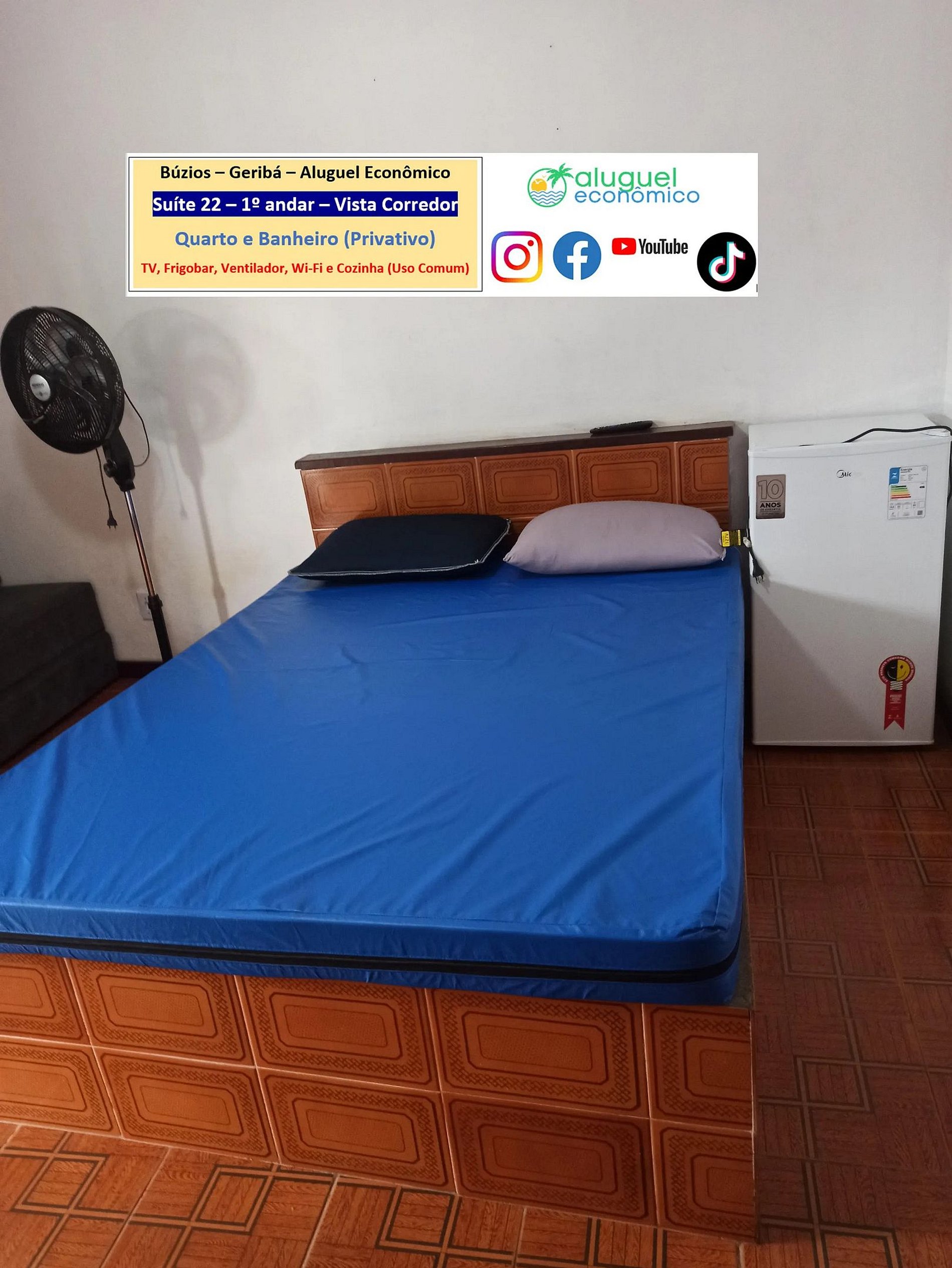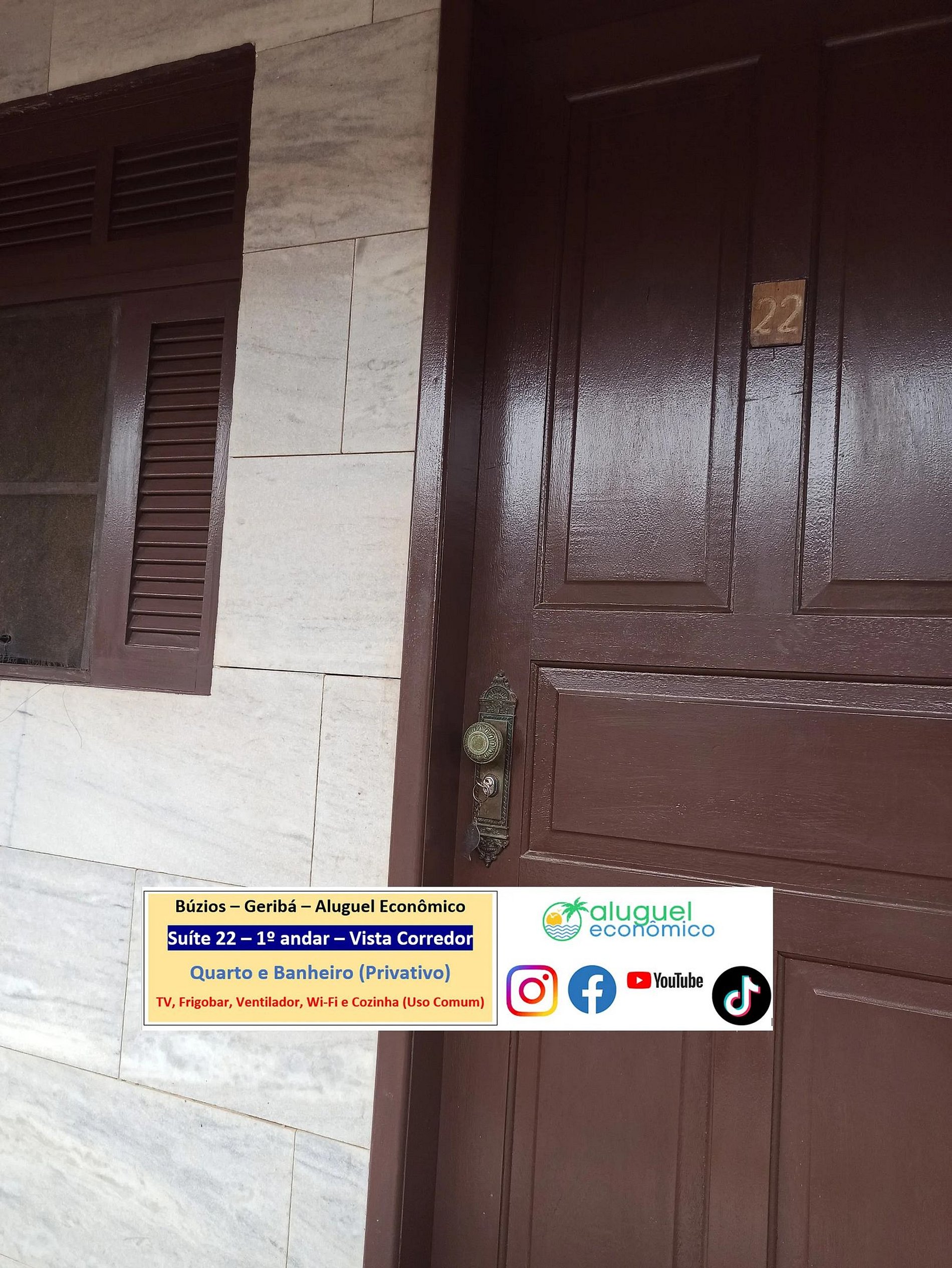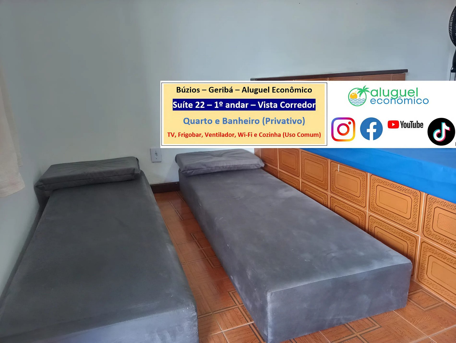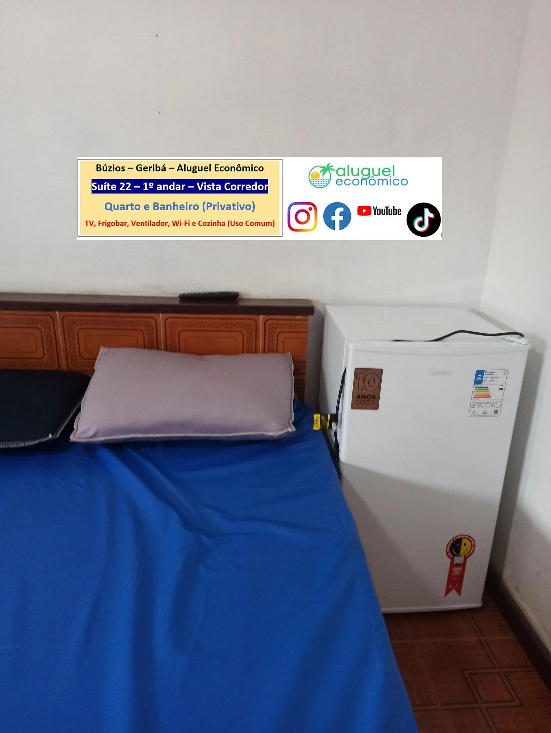 Private property (bedroom and bathroom) on the 1st floor with stairs required. It is 600 meters from Geribá Beach. Window overlooking the hallway. In the bedroom, there is a double bed, 2 single sofa beds, closet, fan, TV, minibar. In the bathroom, there is a box with an electric shower. There is a kitchen, for common use, with stove, microwave oven, blender, sandwich maker, Airfryer, coffee maker and kitchen utensils. Free Wi-Fi. Parking paid separately. Personal identification is required.