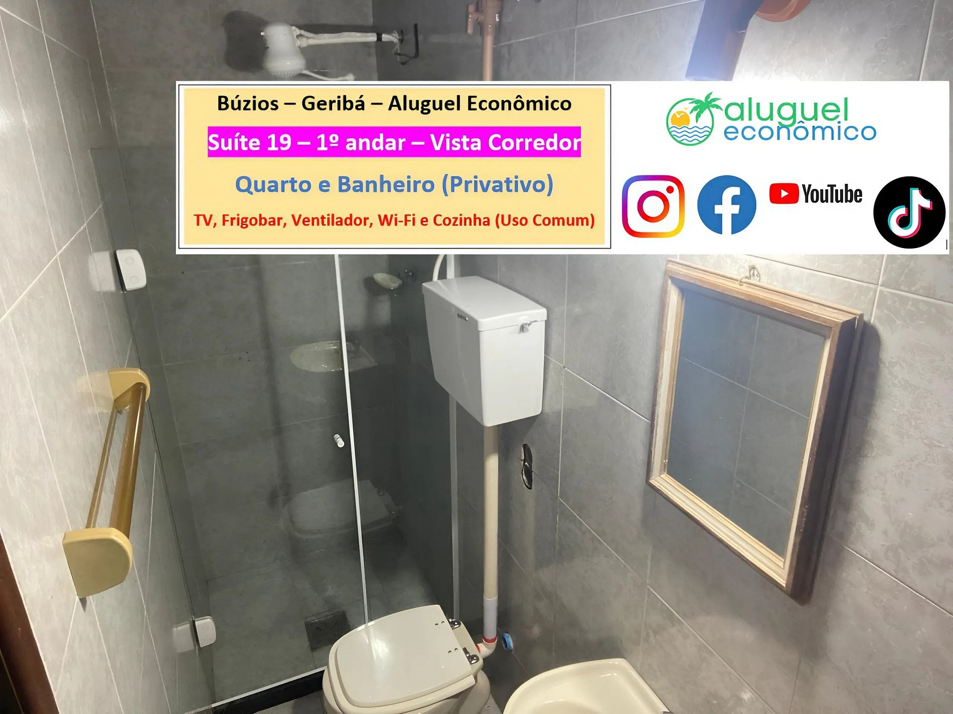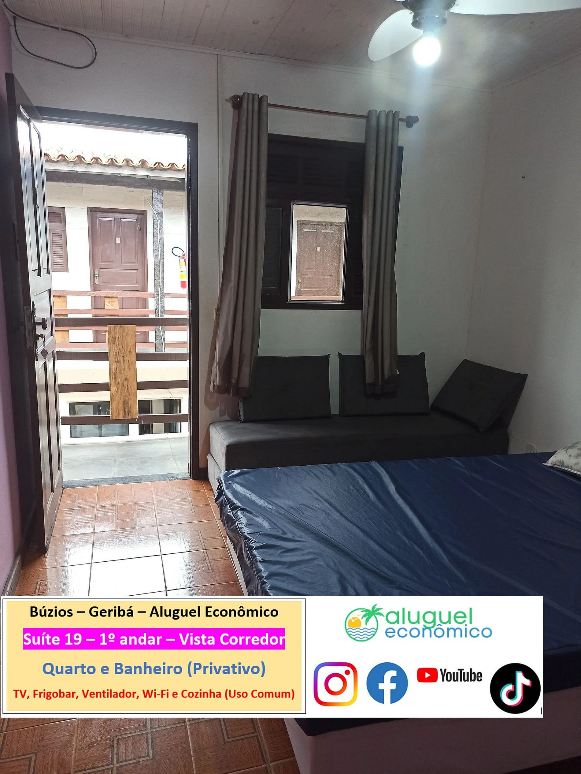 Private property (bedroom and bathroom) on the 1st floor with stairs required. It is 600 meters from Geribá Beach. Window overlooking the hallway. In the bedroom, there is a double bed, 2 single sofa beds, closet, fan, TV, minibar. In the bathroom, there is a box with an electric shower. There is a kitchen, for common use, with stove, microwave oven, blender, sandwich maker, Airfryer, coffee maker and kitchen utensils. Free Wi-Fi. Parking paid separately. Personal identification is required.