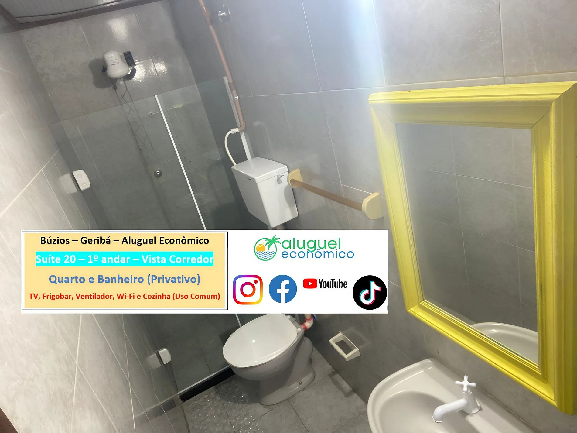 Private property (bedroom and bathroom) on the 1st floor with stairs required. It is 600 meters from Geribá Beach. Window overlooking the hallway. In the bedroom, there is a double bed, 2 single sofa beds, closet, fan, TV, minibar. In the bathroom, there is a box with an electric shower. There is a kitchen, for common use, with stove, microwave oven, blender, sandwich maker, Airfryer, coffee maker and kitchen utensils. Free Wi-Fi. Parking paid separately. Personal identification is required.