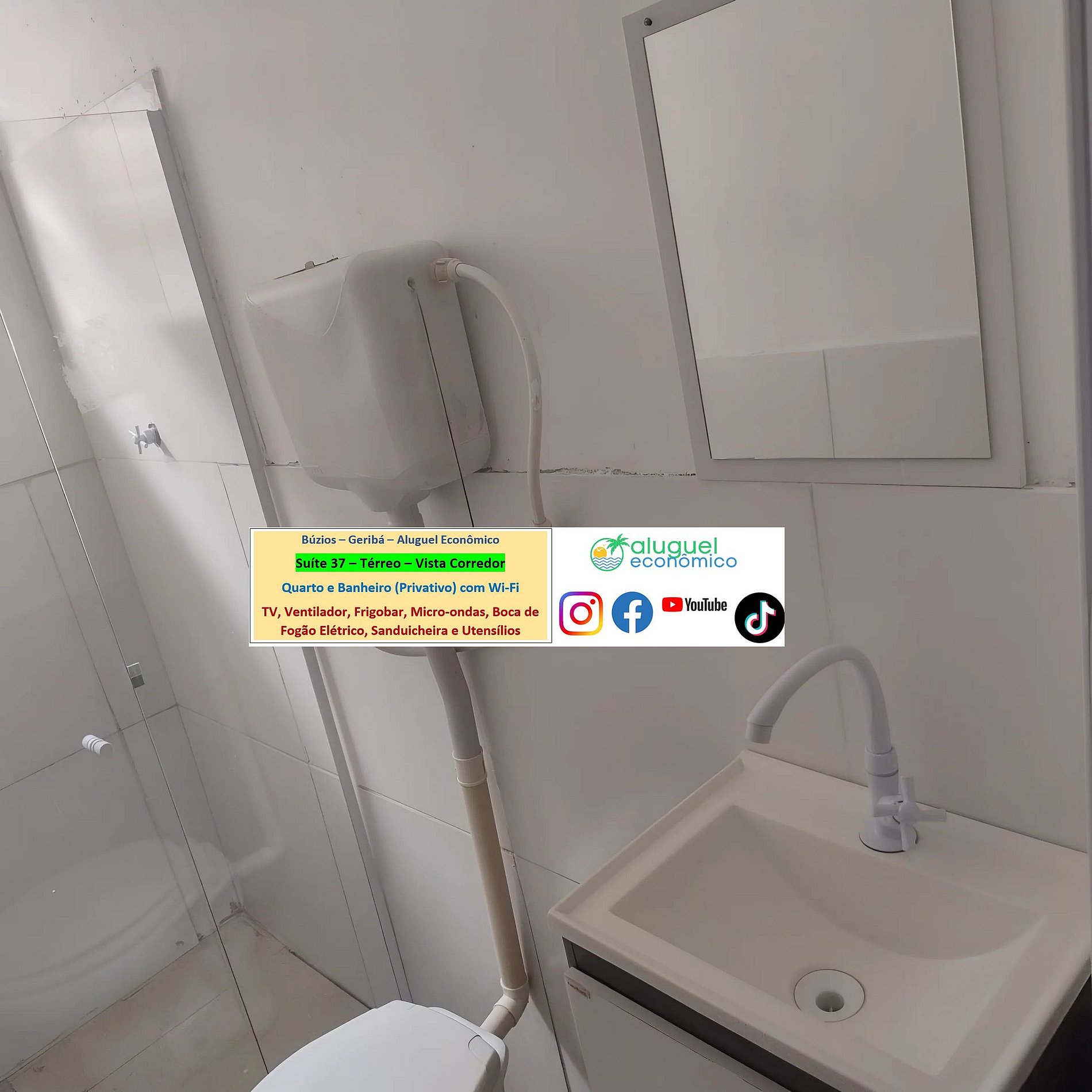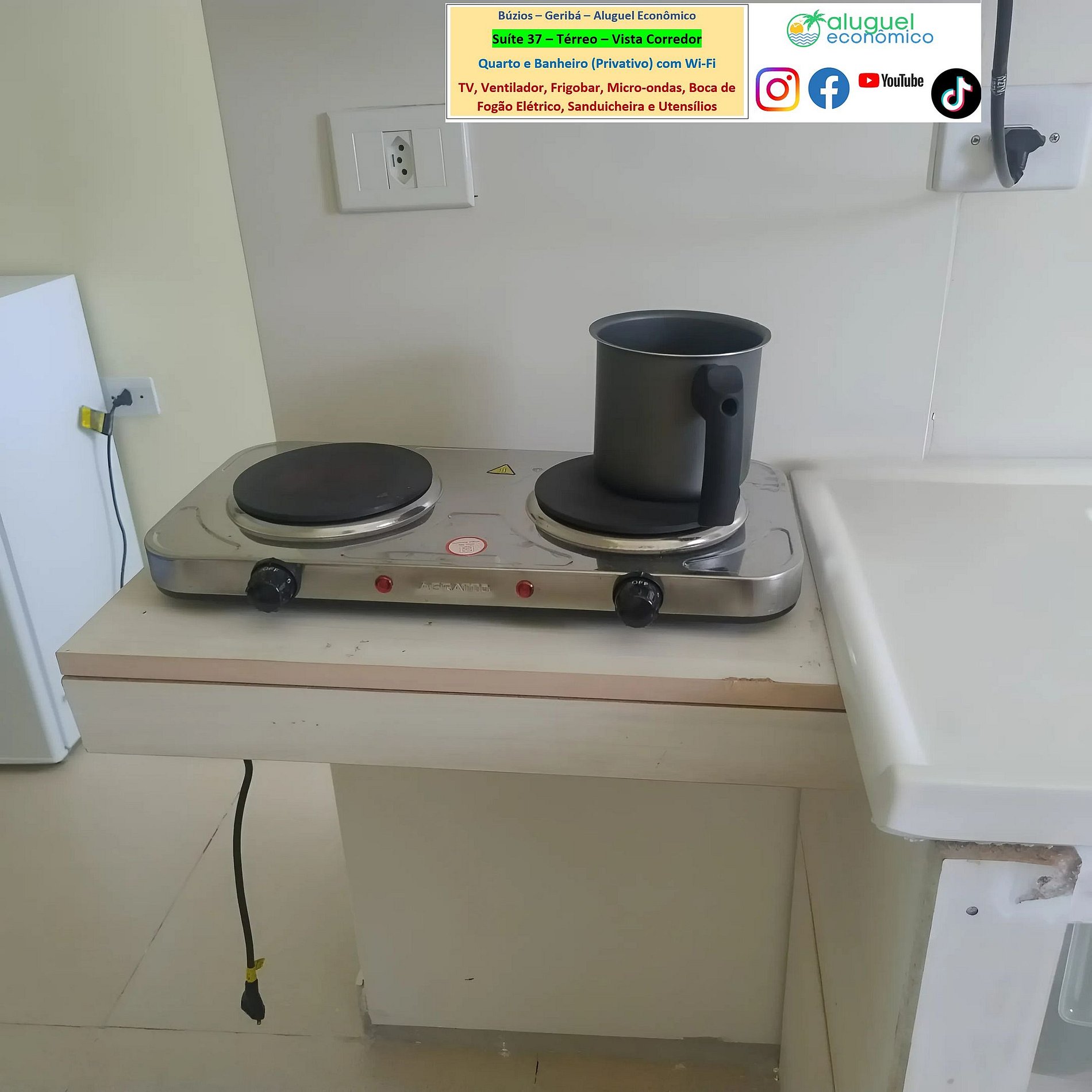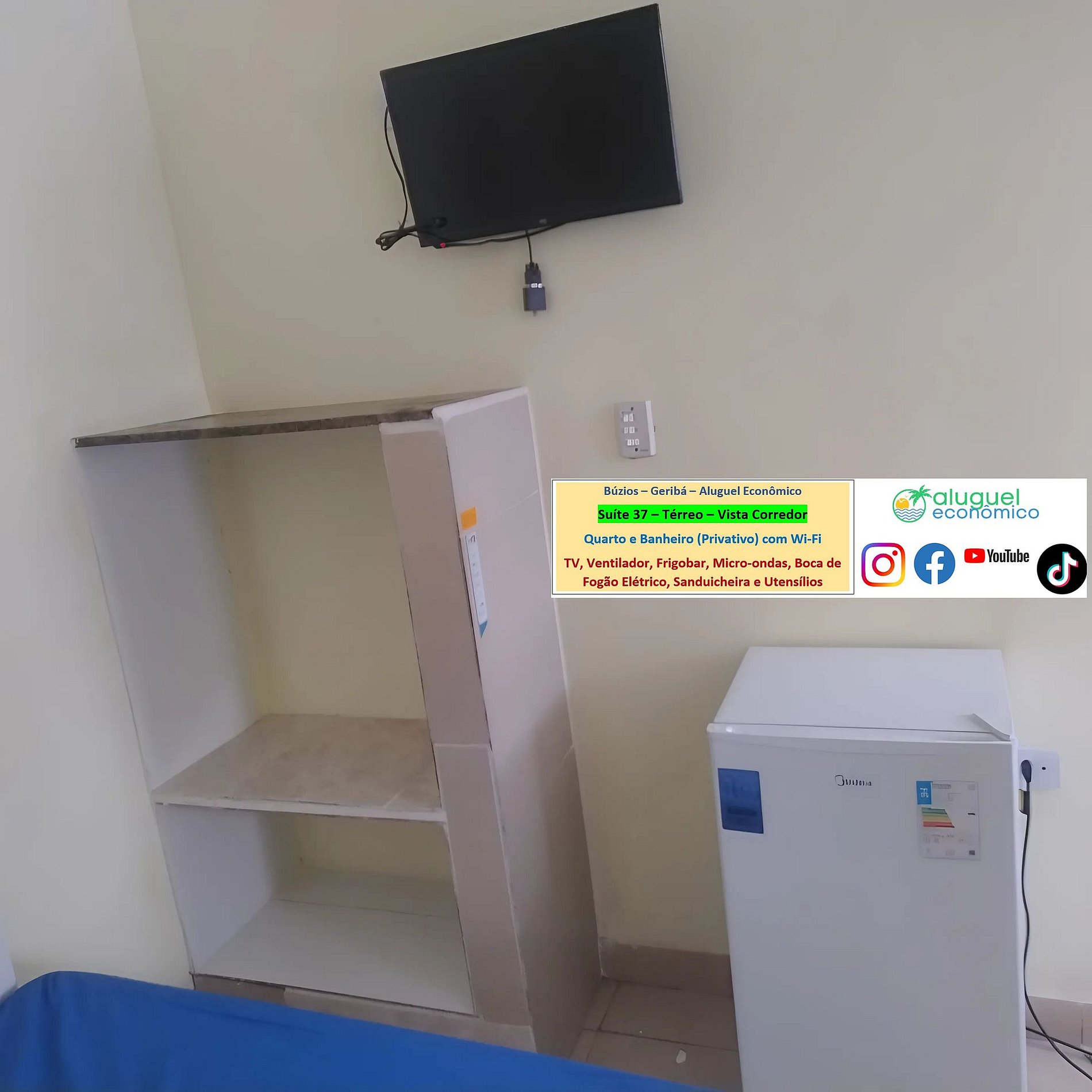 Private property (bedroom and bathroom) on the ground floor. It is 600 meters from Geribá Beach. Window with internal view (parking). In the bedroom, there is a double bed and two single sofa beds, fan, TV, minibar. In the bathroom, there is a box with an electric shower. There is a kitchen, for common use, with stove, microwave oven, blender, sandwich maker, Airfryer, coffee maker and kitchen utensils. Free Wi-Fi. Parking paid separately. Personal identification is required for guests.