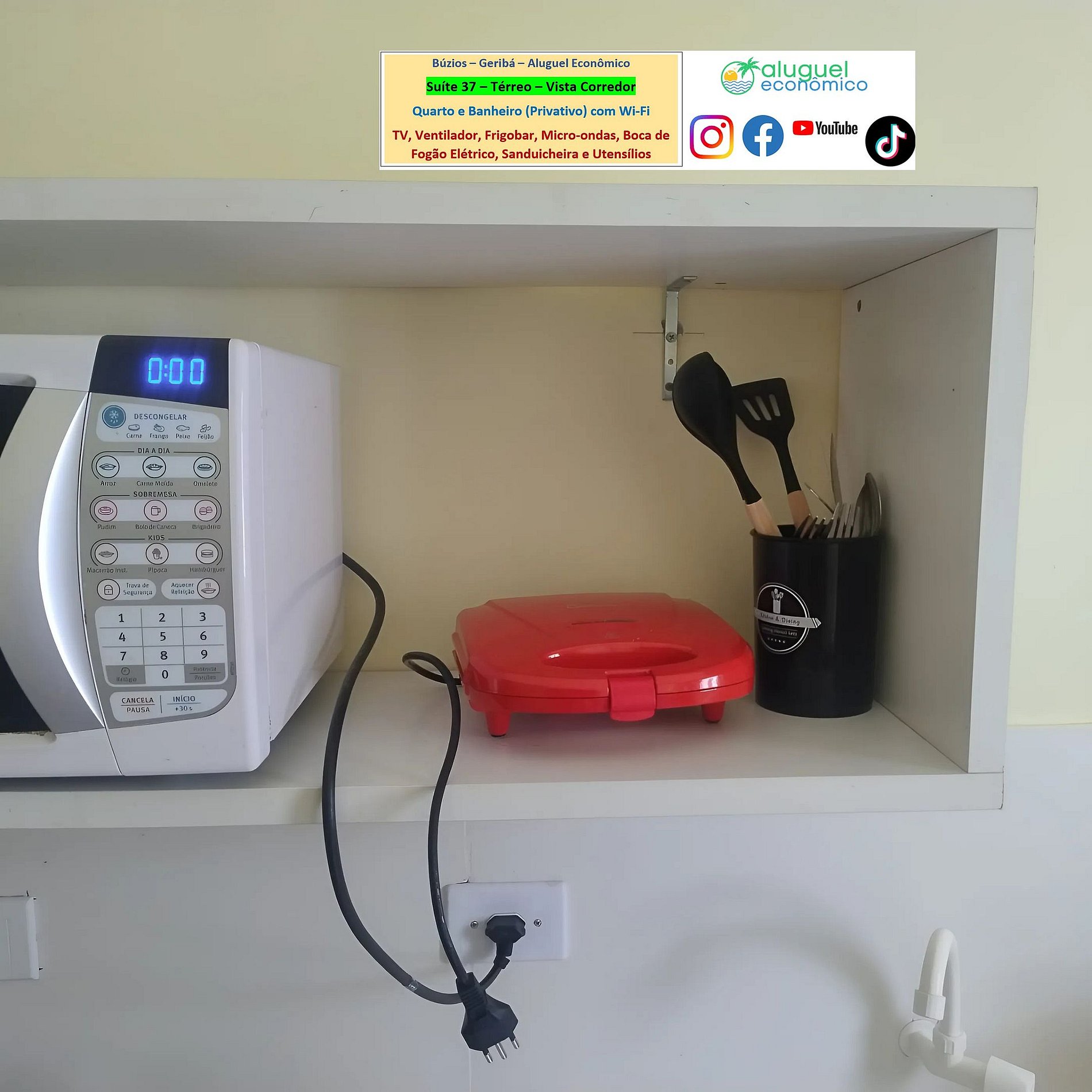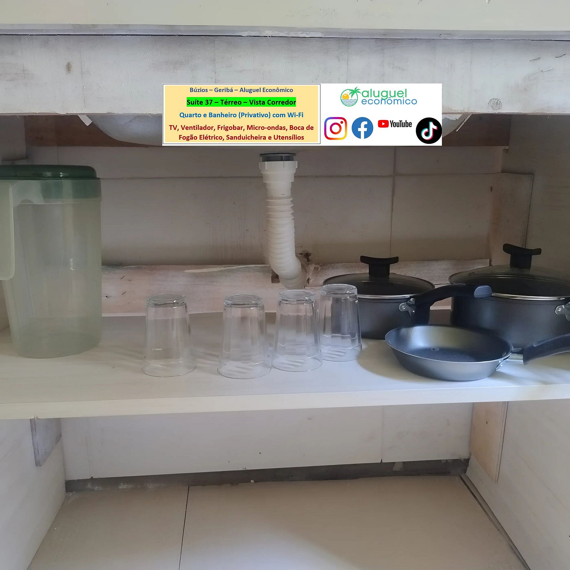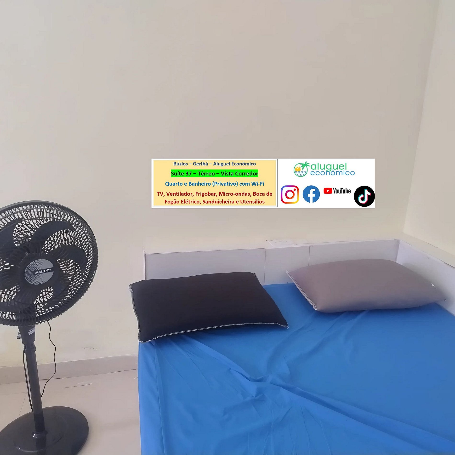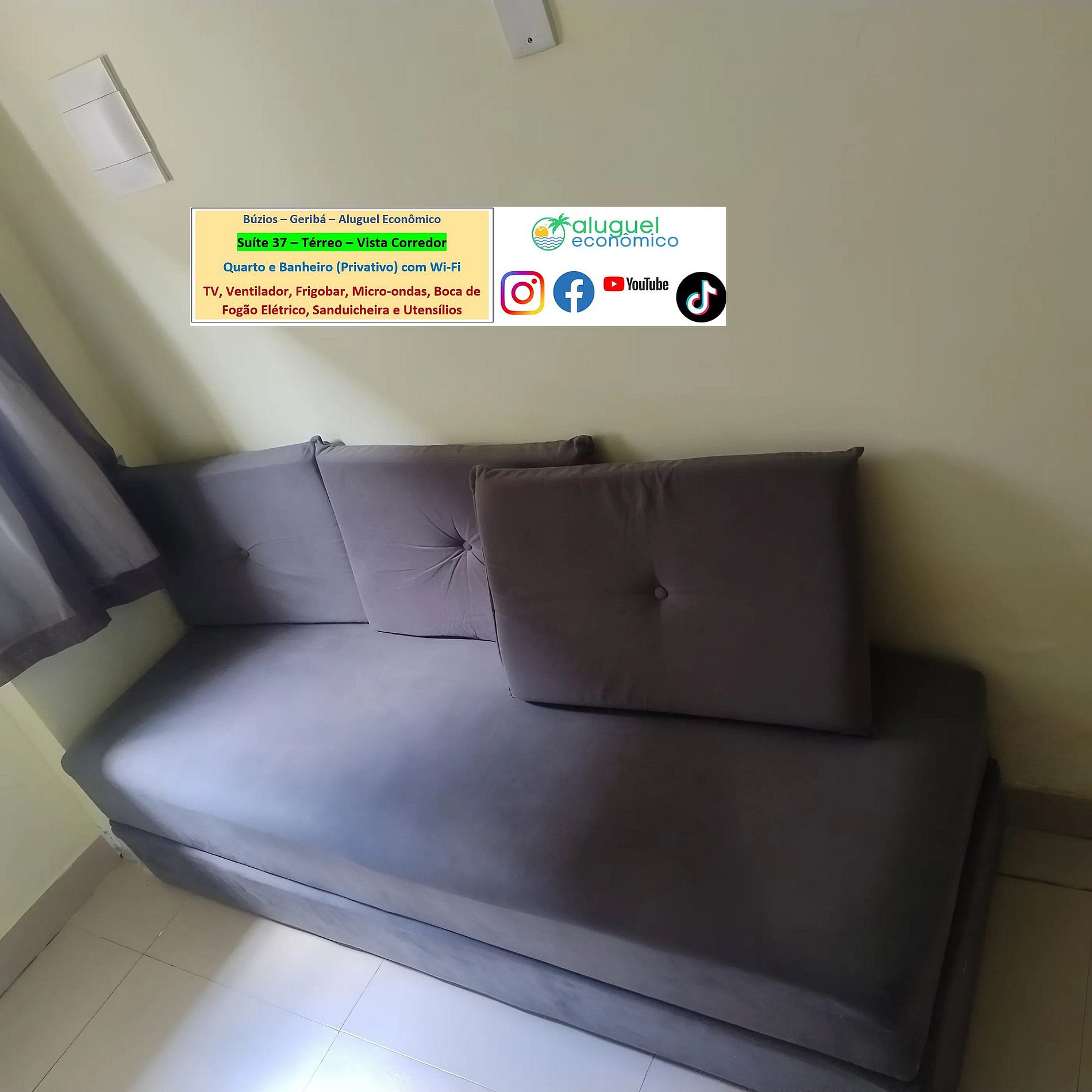 Private property (bedroom and bathroom) on the ground floor. It is 600 meters from Geribá Beach. Window with internal view (parking). In the bedroom, there is a double bed and two single sofa beds, fan, TV, minibar. In the bathroom, there is a box with an electric shower. There is a kitchen, for common use, with stove, microwave oven, blender, sandwich maker, Airfryer, coffee maker and kitchen utensils. Free Wi-Fi. Parking paid separately. Personal identification is required for guests.