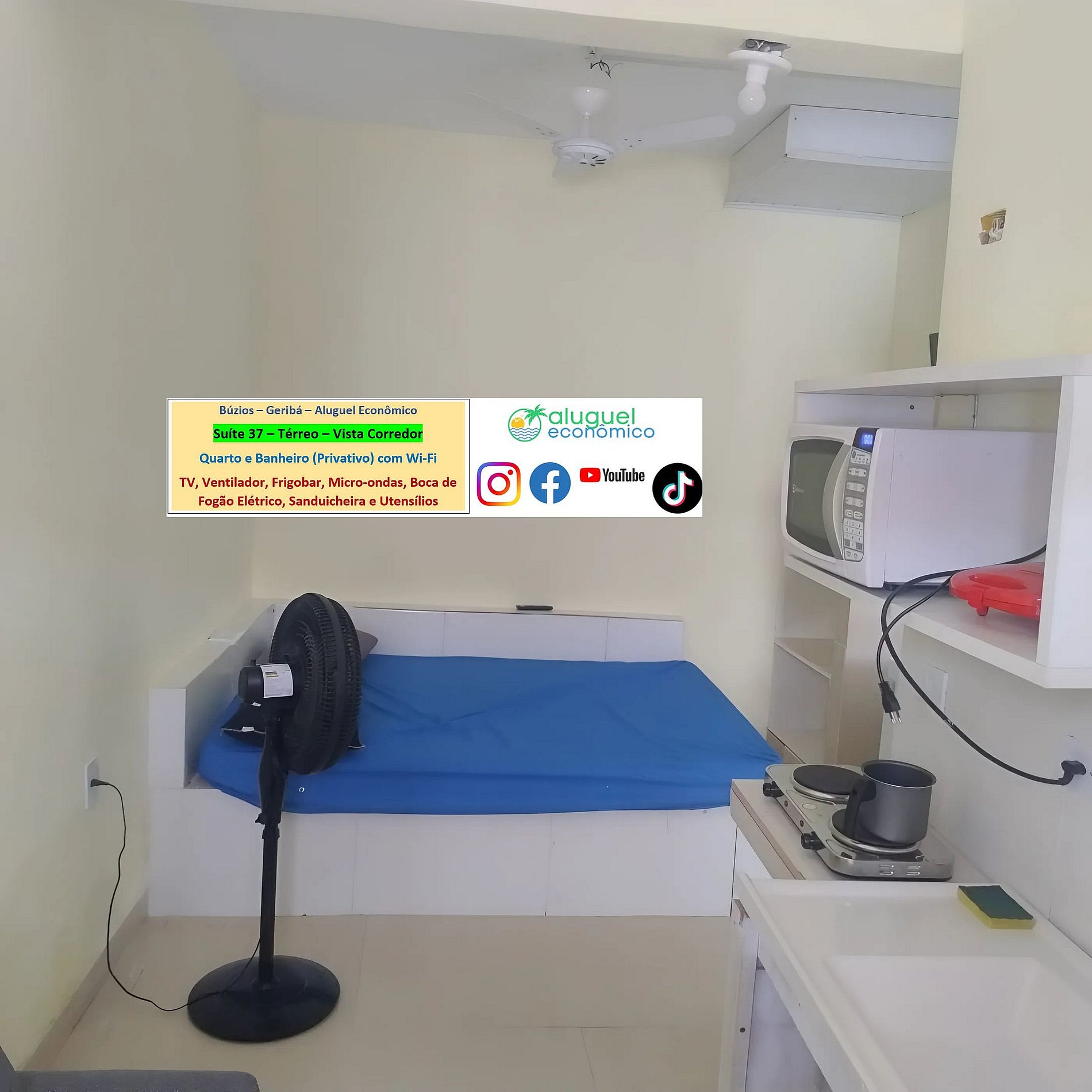 Private property (bedroom and bathroom) on the ground floor. It is 600 meters from Geribá Beach. Window with internal view (parking). In the bedroom, there is a double bed and two single sofa beds, fan, TV, minibar. In the bathroom, there is a box with an electric shower. There is a kitchen, for common use, with stove, microwave oven, blender, sandwich maker, Airfryer, coffee maker and kitchen utensils. Free Wi-Fi. Parking paid separately. Personal identification is required for guests.