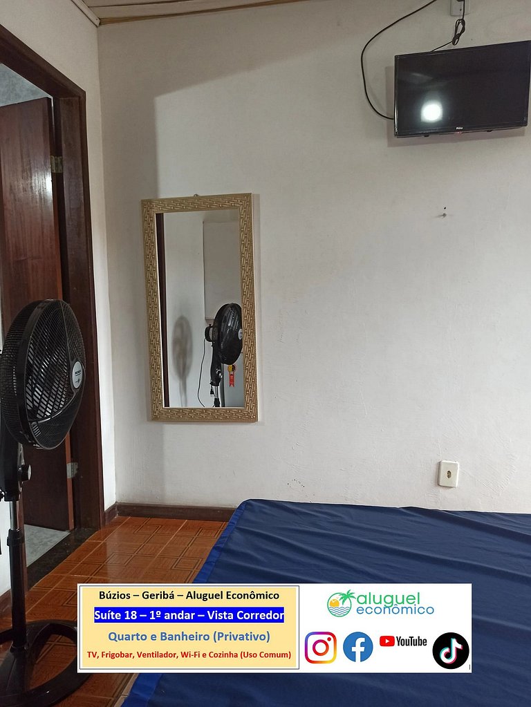 Private property (bedroom and bathroom) on the 1st floor with stairs required. It is 600 meters from Geribá Beach. Window overlooking the hallway. In the bedroom, there is a double bed, 2 single sofa beds, closet, fan, TV, minibar. In the bathroom, there is a box with an electric shower. There is a kitchen, for common use, with stove, microwave oven, blender, sandwich maker, Airfryer, coffee maker and kitchen utensils. Free Wi-Fi. Parking paid separately. Personal identification is required.