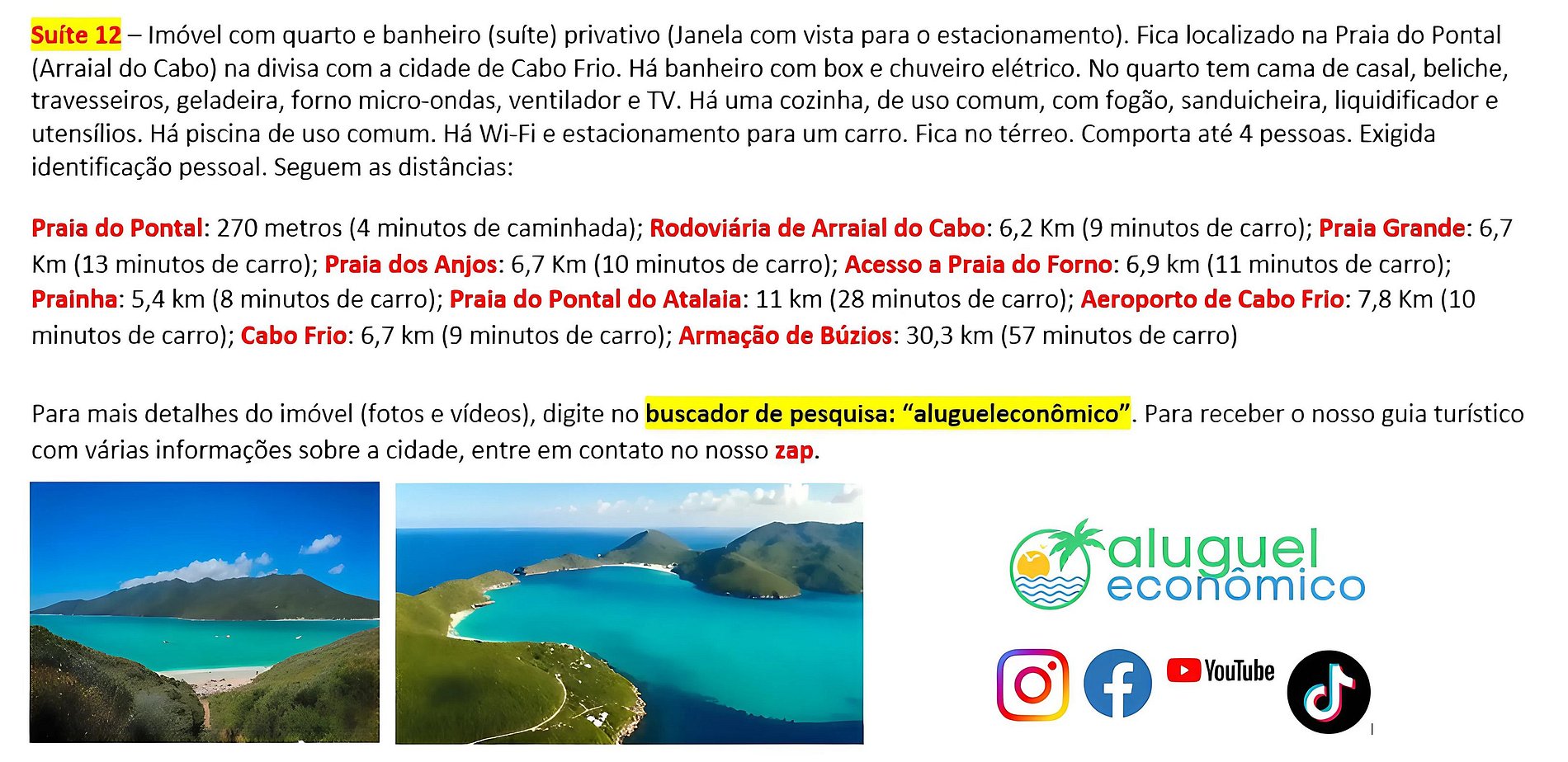 Accommodation Address: RJ-140 - Praia do Pontal, Arraial do Cabo - RJ (Subuai Village Arraial do Cabo) For more information about this property, please access the following link: https://www.alugueleconomico.com.br/pt/ Follow the contact details for more information about hosting: Margarete: 21 96754-7506 (Key delivery) Mara: 21 98107-1377 Carlos Eduardo: 21 98099-1377 Our email is as follows: atendimento@alugueleconomico.com.br Follow us on our social networks: Facebook page: https://www.facebook.com/alugueleconomicooficial Our Facebook group (Aluguel Economico): https://www.facebook.com/groups/184418835538966 Our Instagram page: https://www.instagram.com/alugueleconomico_pessoa/ Personal profile on Facebook: https://www.facebook.com/carloseduardobarros.leite.77 TikTok page: https://www.tiktok.com/@alugueleconomico_oficial