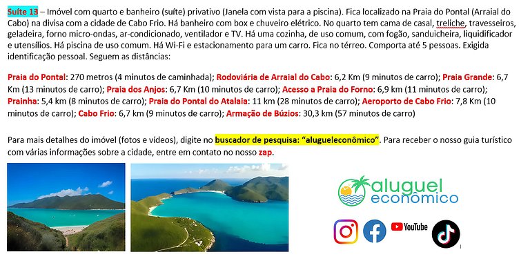 Accommodation Address: RJ-140 - Praia do Pontal, Arraial do Cabo - RJ (Subuai Village Arraial do Cabo) For more information about this property, please access the following link: https://www.alugueleconomico.com.br/pt/ Follow the contact details for more information about hosting: Margarete: 21 96754-7506 (Key delivery) Mara: 21 98107-1377 Carlos Eduardo: 21 98099-1377 Our email is as follows: atendimento@alugueleconomico.com.br Follow us on our social networks: Facebook page: https://www.facebook.com/alugueleconomicooficial Our Facebook group (Aluguel Economico): https://www.facebook.com/groups/184418835538966 Our Instagram page: https://www.instagram.com/alugueleconomico_pessoa/ Personal profile on Facebook: https://www.facebook.com/carloseduardobarros.leite.77 TikTok page: https://www.tiktok.com/@alugueleconomico_oficial