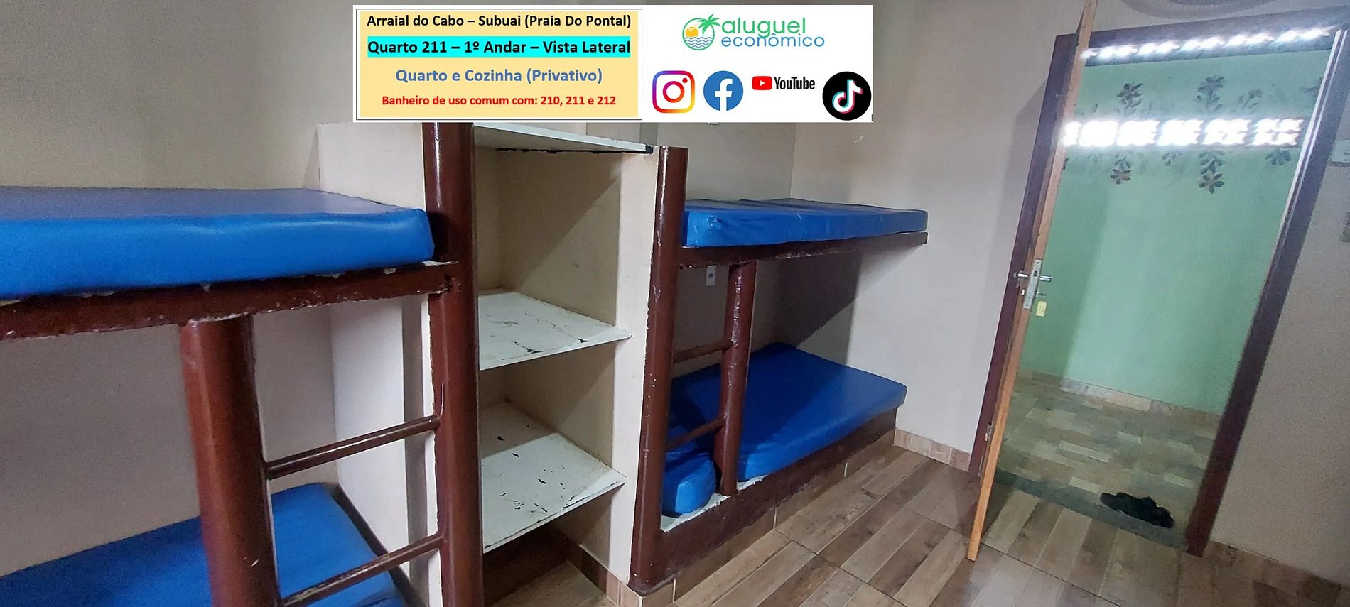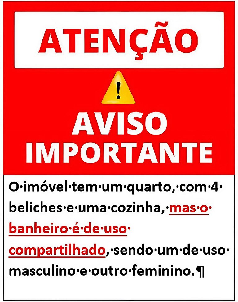 Property with private bedroom and kitchen (window in kitchen), however, the bathroom is in common use with rooms 210, 211 and 212. There is a men's and women's bathroom. It is located on Praia do Pontal (first beach in Arraial do Cabo). The room has 4 bunk beds, fan and TV. The kitchen has a refrigerator, stove, microwave, sandwich maker, blender and utensils. There is a communal swimming pool. There is WiFi and parking for one car. It is on the first floor, so you have to climb stairs.