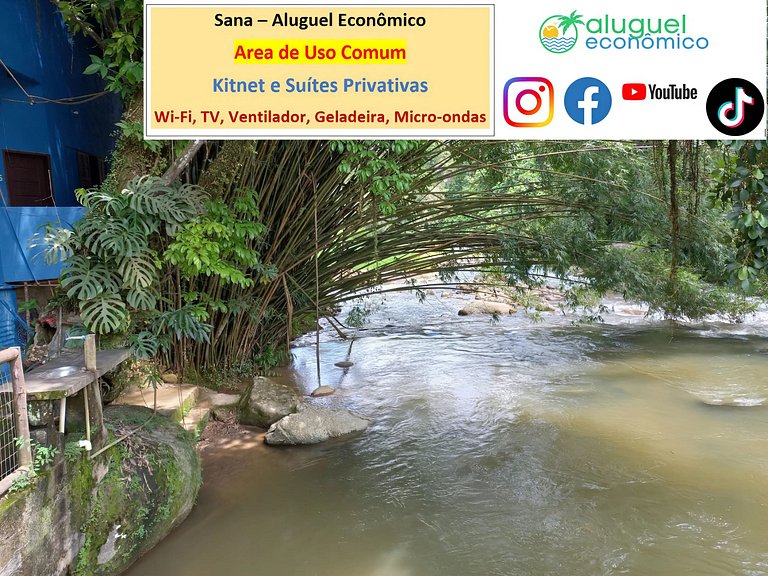 Propiedad privada (dormitorio y baño), a orillas del río Macaé. Lugar para el descanso y la tranquilidad. Está a 3,5 del centro de Sana. Región con varias cascadas. La habitación cuenta con cama matrimonial, litera, ventilador, TV, refrigerador y microondas. En el baño hay un box y una ducha eléctrica. La cocina común tiene estufa y utensilios de cocina. Wi-Fi disponible. Aparcamiento pagado por separado. No proporcionamos ropa de cama, toallas ni productos de higiene personal.