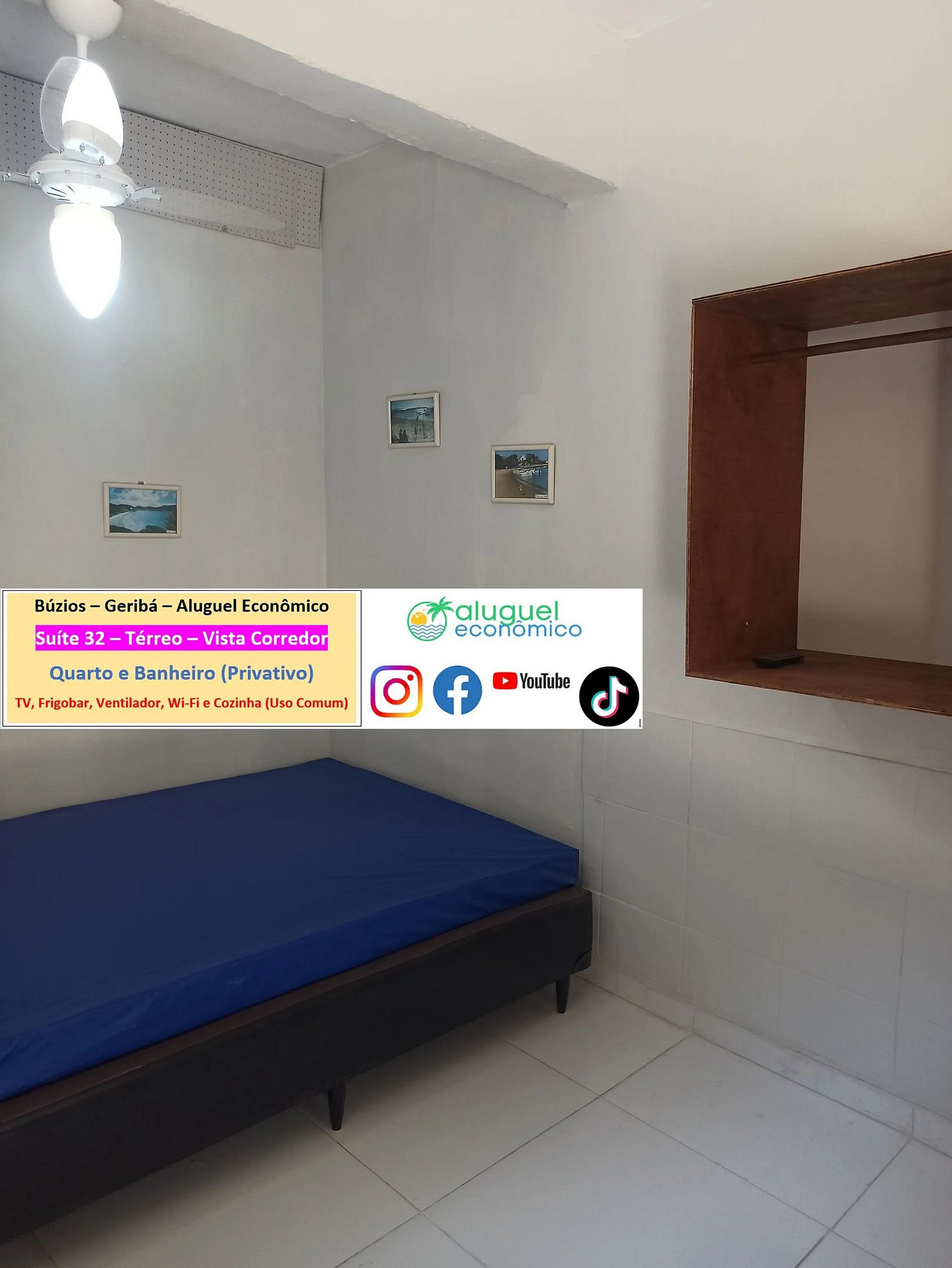Propiedad privada (dormitorio y baño) en planta baja. Se encuentra a 600 metros de la playa de Geribá. Ventana con vista interna (estacionamiento). En el dormitorio hay una cama doble y dos sofás cama individuales, ventilador, TV, minibar. En el baño hay una cabina con ducha eléctrica. Hay una cocina, de uso común, con vitrocerámica, horno microondas, batidora, sandwichera, Airfryer, cafetera y utensilios de cocina. Wifi gratuito. Aparcamiento pagado por separado. Se requiere identificación