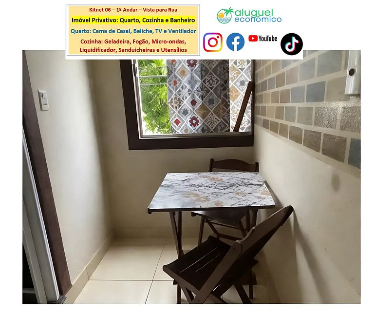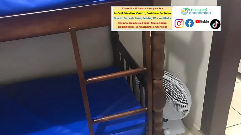 Kitnet privado con dormitorio, cocina y baño. En el dormitorio hay una cama doble, una litera, un televisor y un ventilador. Cocina con refrigerador, estufa, microondas, sandwichera, licuadora, utensilios de cocina. Baño con ducha y ducha eléctrica. Hay Wi-Fi. El edificio está detrás de la comisaría, por lo que es un lugar seguro para dejar tu vehículo en la calle. La vivienda se encuentra en una primera planta, debiendo subir escaleras. Ventana que da a la calle. Canastilla no incluida.