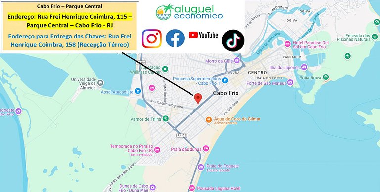 La dirección del alojamiento es: Rua Frei Henriquei Coimbra, 115 - Parque Central - Cabo Frio - RJ. Las llaves se entregan en la siguiente dirección: Rua Frei Henrique Coimbra, 158 - Jardim Caiçara - Cabo Frio. En este lugar hay una recepción en la planta baja.