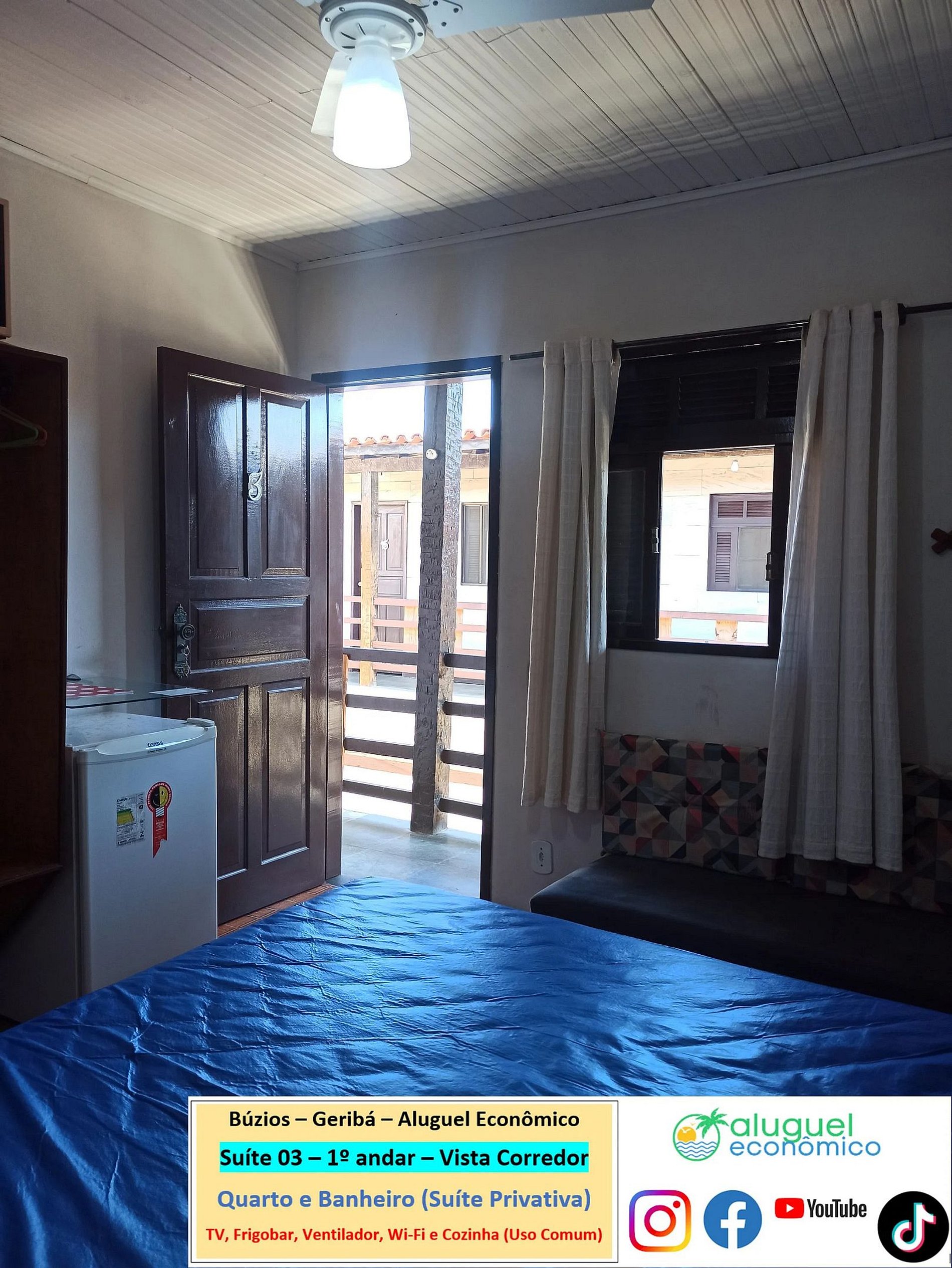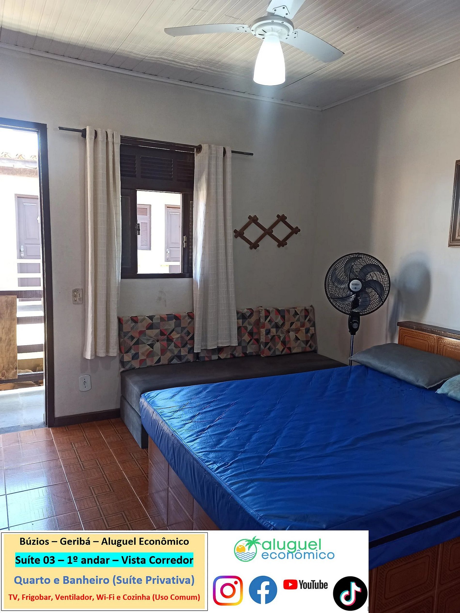 Propiedad privada (dormitorio y baño) en el 1er piso con escaleras necesarias. Se encuentra a 600 metros de la playa de Geribá. Ventana que da al pasillo. En el dormitorio hay una cama doble, 2 sofás cama individuales, armario, ventilador, TV, minibar. En el baño hay una cabina con ducha eléctrica. Hay una cocina, de uso común, con vitrocerámica, horno microondas, batidora, sandwichera, Airfryer, cafetera y utensilios de cocina. Wifi gratuito. Aparcamiento pagado por separado.
