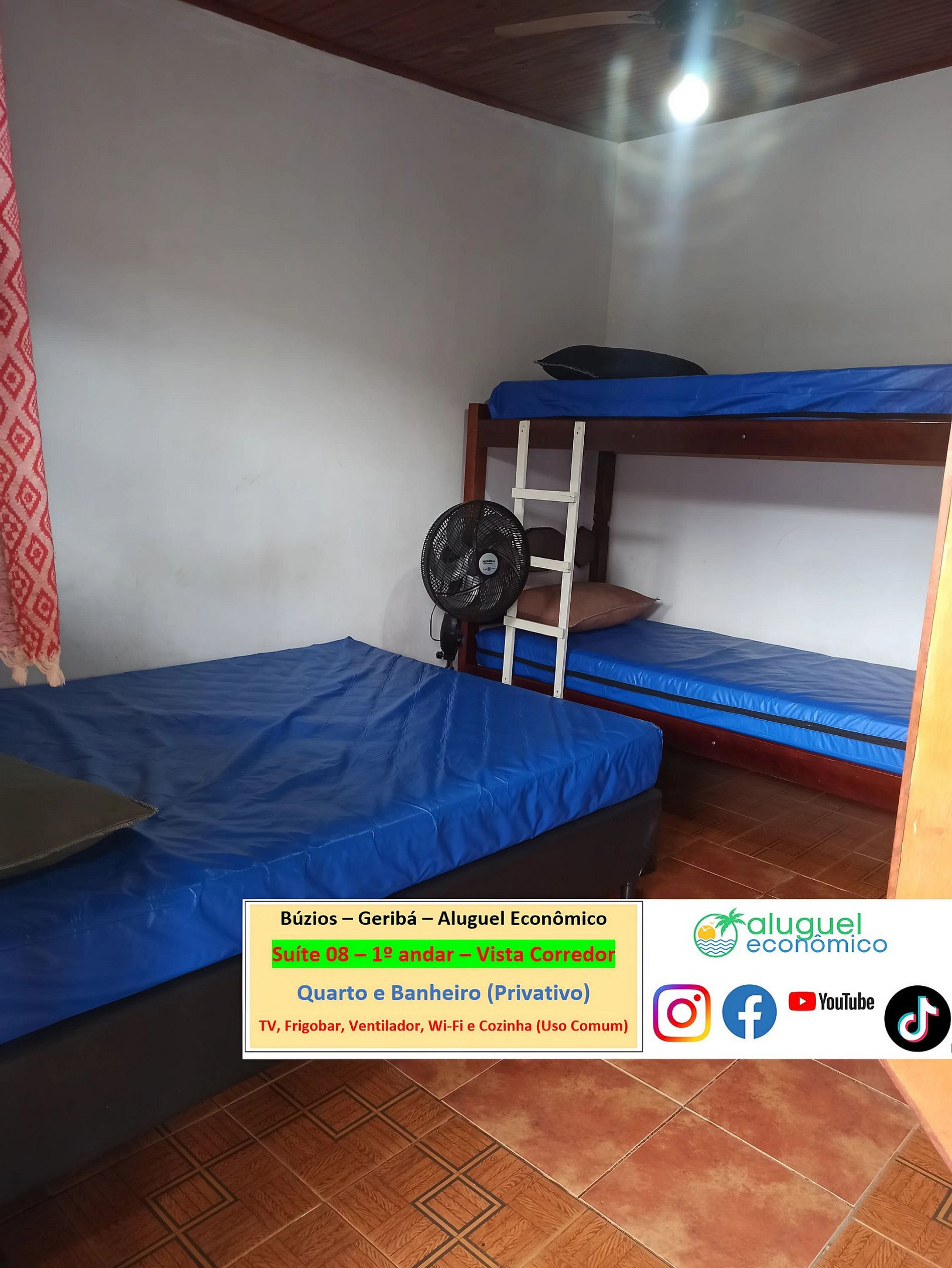 Propiedad privada (dormitorio y baño) en el 1er piso con escaleras necesarias. Se encuentra a 600 metros de la playa de Geribá. Ventana que da al pasillo. En el dormitorio hay una cama doble, una litera, un armario, un ventilador, un televisor y un minibar. En el baño hay una cabina con ducha eléctrica. Hay una cocina, de uso común, con vitrocerámica, horno microondas, batidora, sandwichera, Airfryer, cafetera y utensilios de cocina. Wifi gratuito. Aparcamiento pagado por separado.
