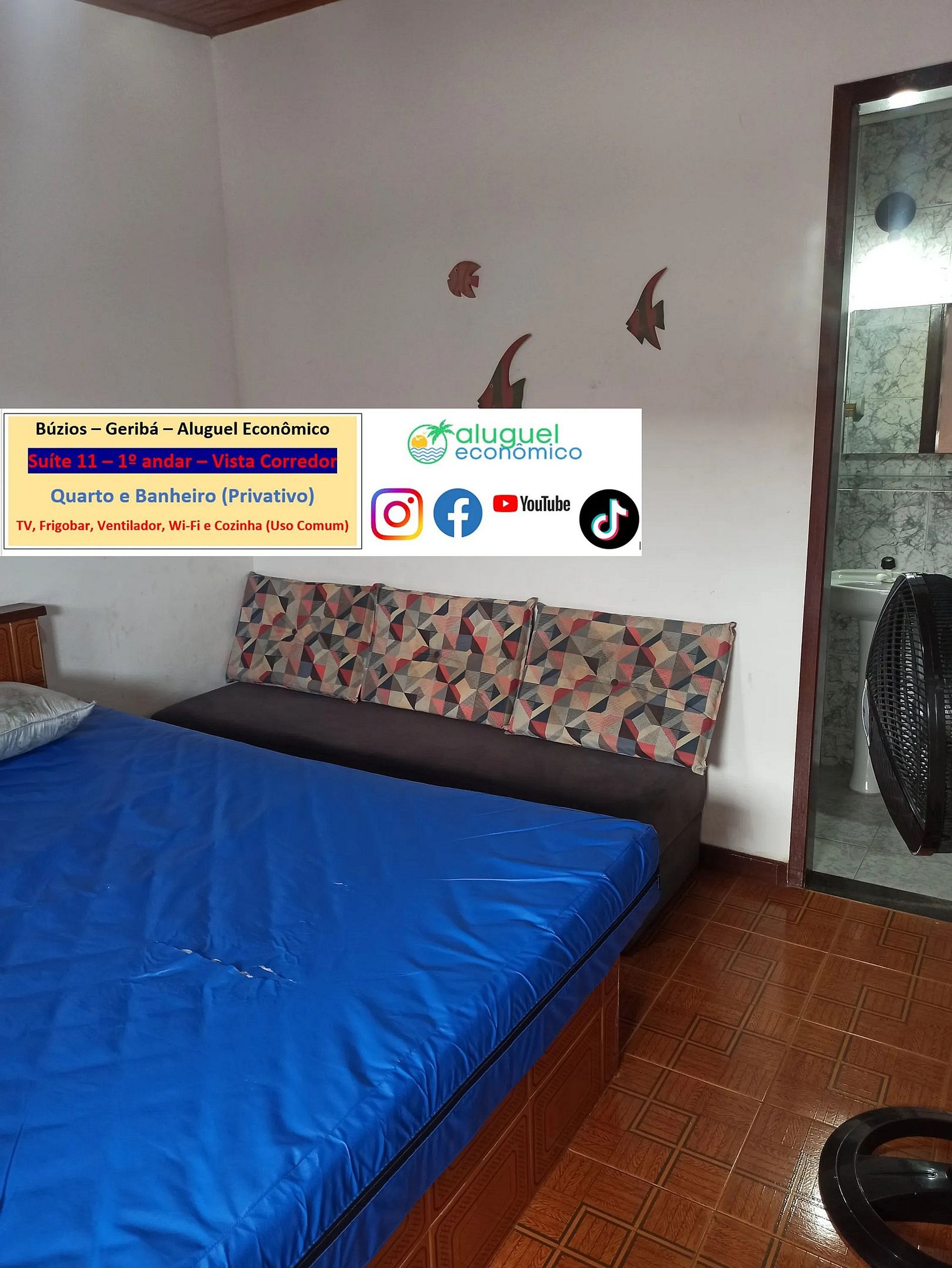 Propiedad privada (dormitorio y baño) en el 1er piso con escaleras necesarias. Se encuentra a 600 metros de la playa de Geribá. Ventana que da al pasillo. En el dormitorio hay una cama doble, 2 sofás cama individuales, armario, ventilador, TV, minibar. En el baño hay una cabina con ducha eléctrica. Hay una cocina, de uso común, con vitrocerámica, horno microondas, batidora, sandwichera, Airfryer, cafetera y utensilios de cocina. Wifi gratuito. Aparcamiento pagado por separado.