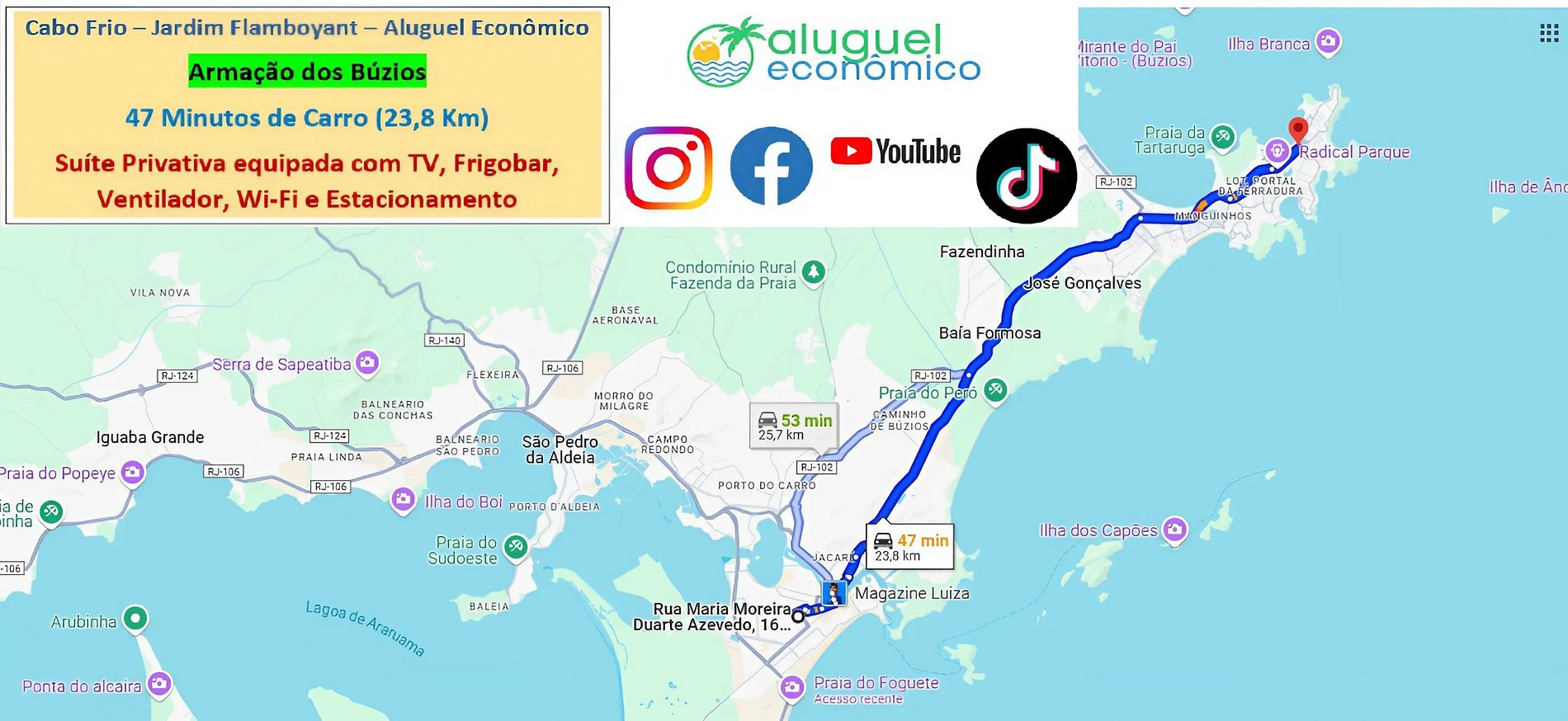 Ubicación: R. Maria Moreira Duarte Azevedo, 16 - Jardim Flamboyant – Cabo Frio – RJ (Está cerca de la estación de autobuses de Cabo Frio)