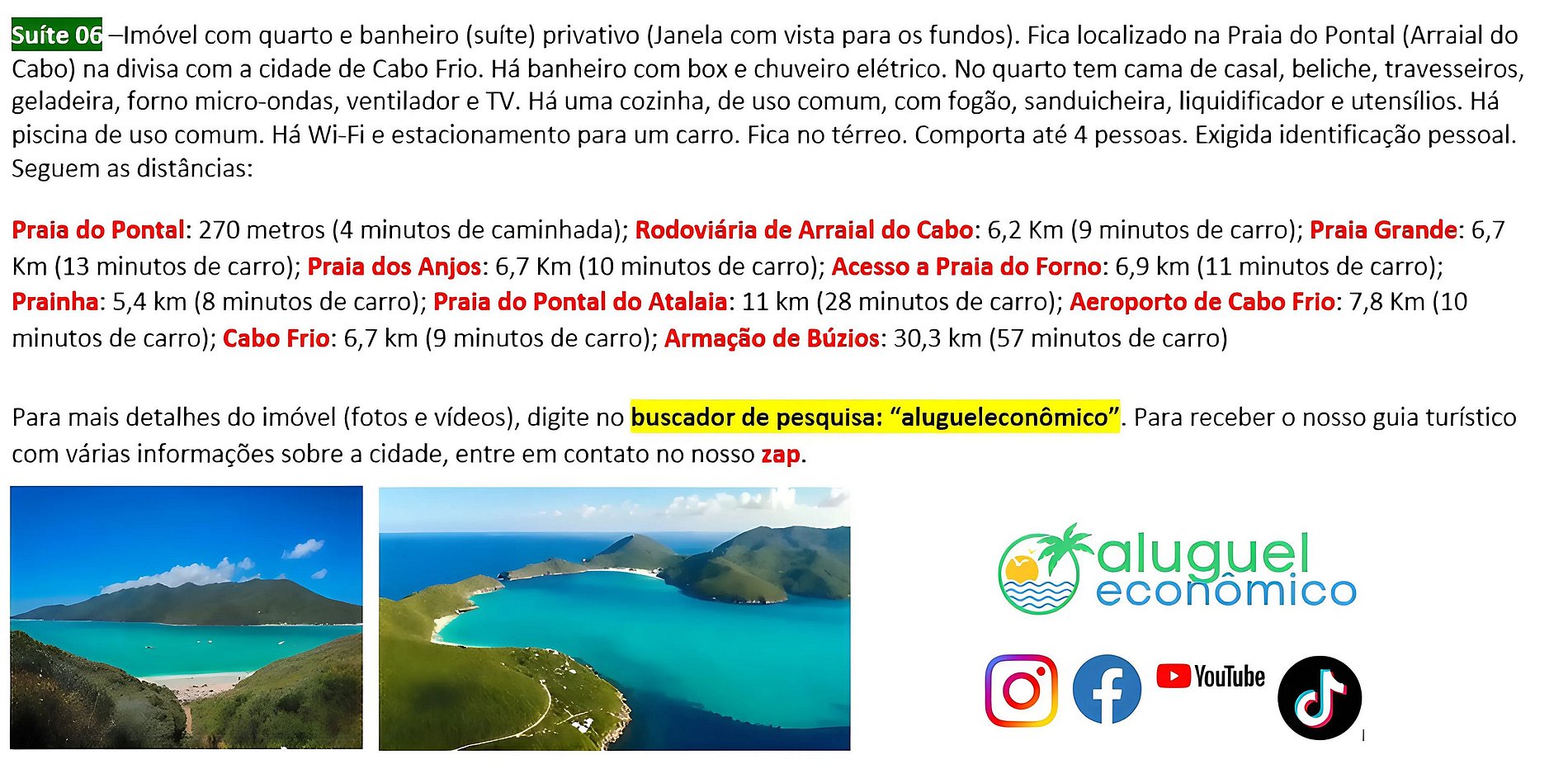 Dirección del alojamiento: RJ-140 - Praia do Pontal, Arraial do Cabo - RJ (Subuai Village Arraial do Cabo) Para obtener más información sobre esta propiedad, acceda al siguiente enlace: https://www.alugueleconomico.com.br/pt/ Siga los datos de contacto para obtener más información sobre hosting: Margarete: 21 96754-7506 (Entrega de llaves) María: 21 98107-1377 Carlos Eduardo: 21 98099-1377 Nuestro correo electrónico es el siguiente: atendimento@alugueleconomico.com.br Síguenos en nuestras redes sociales: Página de Facebook: https://www.facebook.com/alugueleconomicooficial Nuestro grupo de Facebook (Aluguel Económico): https://www.facebook.com/groups/184418835538966 Nuestra página de Instagram: https://www.instagram.com/alugueleconomico_pessoa/ Perfil personal en Facebook: https://www.facebook.com/carloseduardobarros.leite.77 Página de TikTok: https://www.tiktok.com/@alugueleconomico_oficial