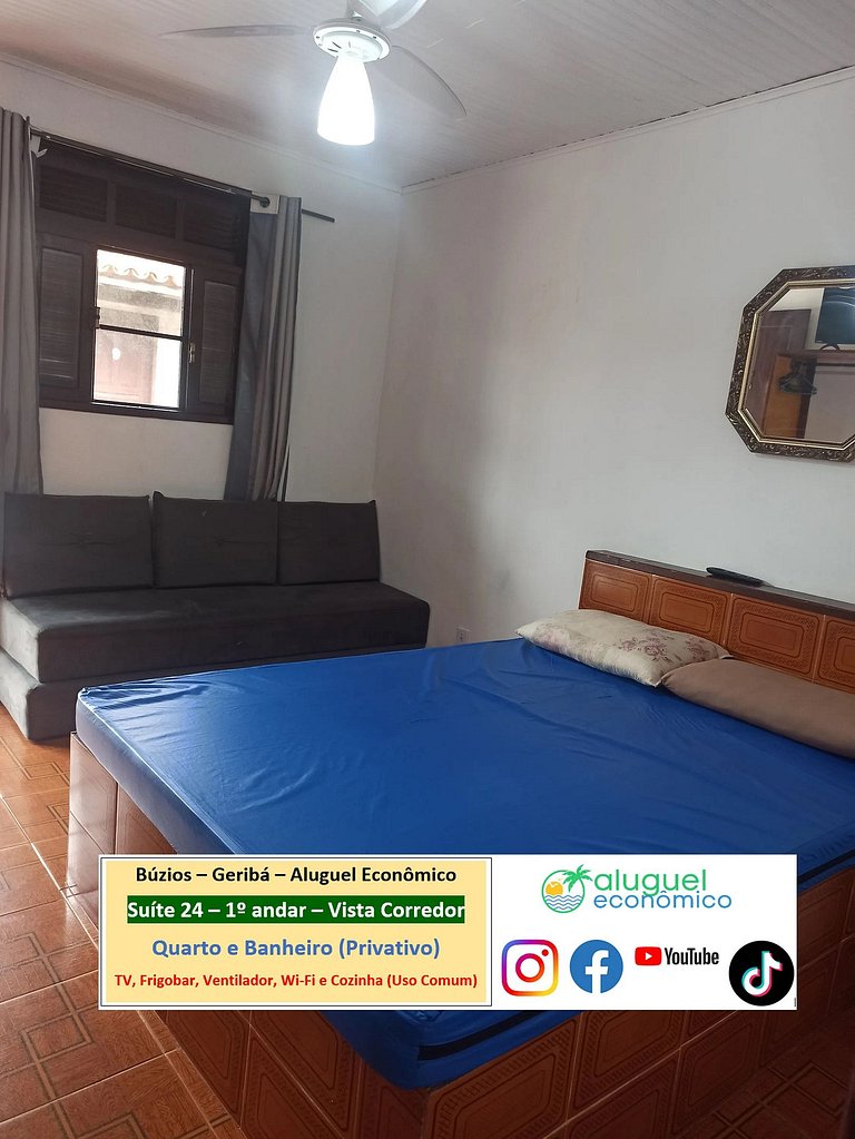 Propiedad privada (dormitorio y baño) en el 1er piso con escaleras necesarias. Se encuentra a 600 metros de la playa de Geribá. Ventana que da al pasillo. En el dormitorio hay una cama doble, 2 sofás cama individuales, armario, ventilador, TV, minibar. En el baño hay una cabina con ducha eléctrica. Hay una cocina, de uso común, con vitrocerámica, horno microondas, batidora, sandwichera, Airfryer, cafetera y utensilios de cocina. Wifi gratuito. Aparcamiento pagado por separado.