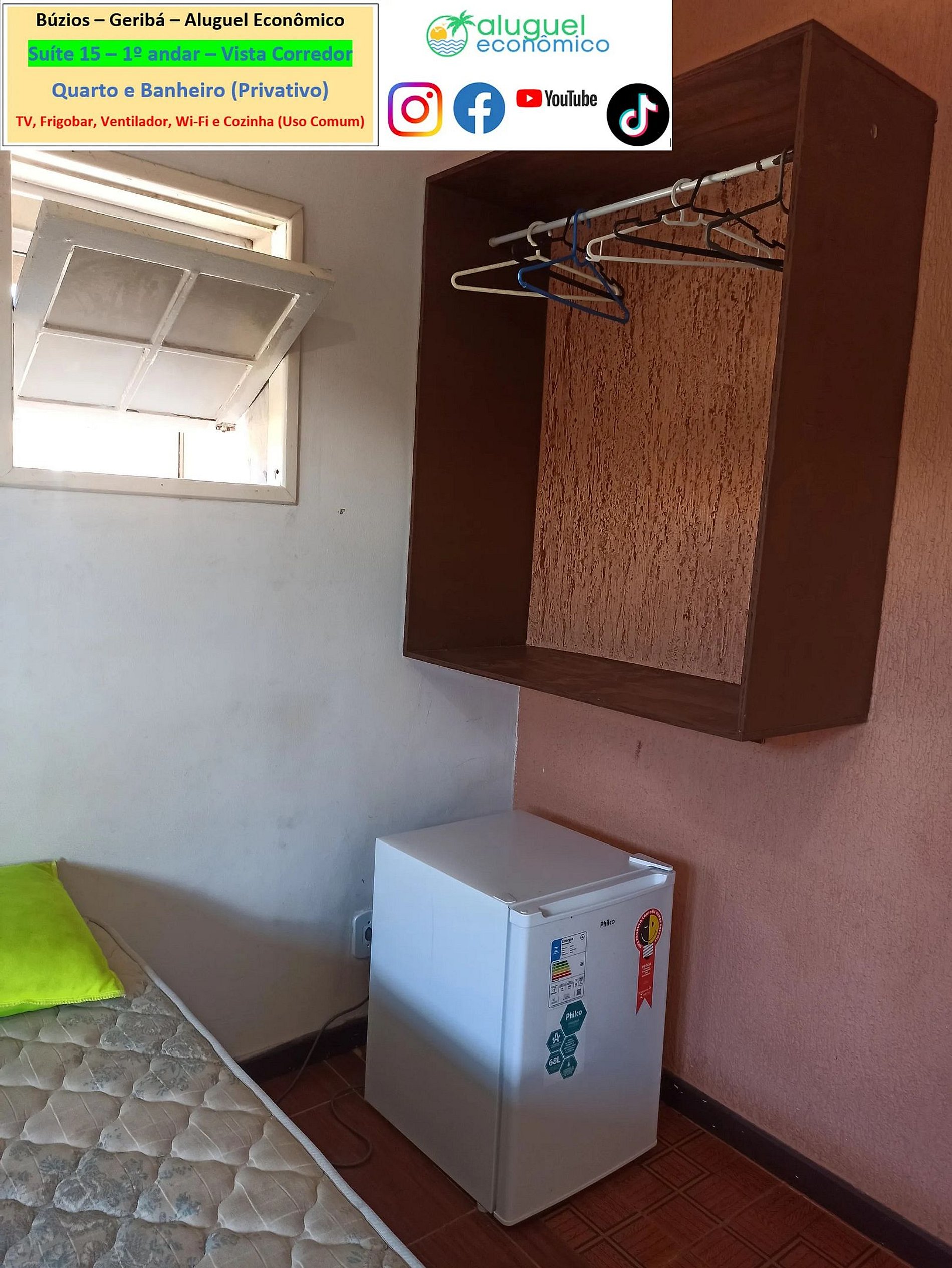Propiedad privada (dormitorio y baño) en el 1er piso con escaleras necesarias. Se encuentra a 600 metros de la playa de Geribá. Ventana que da al pasillo. En el dormitorio hay una cama doble, 2 sofás cama individuales, armario, ventilador, TV, minibar. En el baño hay una cabina con ducha eléctrica. Hay una cocina, de uso común, con vitrocerámica, horno microondas, batidora, sandwichera, Airfryer, cafetera y utensilios de cocina. Wifi gratuito. Aparcamiento pagado por separado.