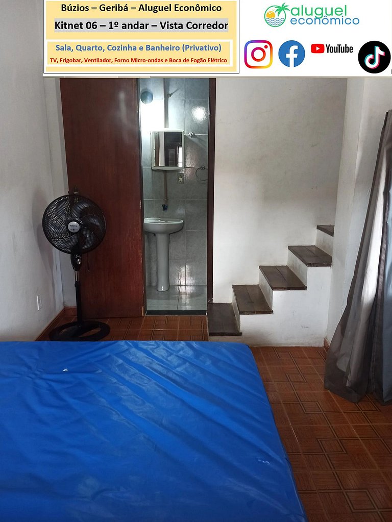 Propiedad privada (salón, dormitorio, cocina y baño) en el 1er piso con escaleras necesarias. Se encuentra a 600 metros de la playa de Geribá. Ventana que da al pasillo. En el dormitorio hay una cama doble y ventilador, en el salón hay 2 sofás cama individuales, una cama individual, ventilador y TV. La cocina cuenta con minibar, vitrocerámica y utensilios de cocina. En el baño hay una cabina con ducha eléctrica. . Wifi gratuito. Aparcamiento pagado por separado. Se requiere identificación.