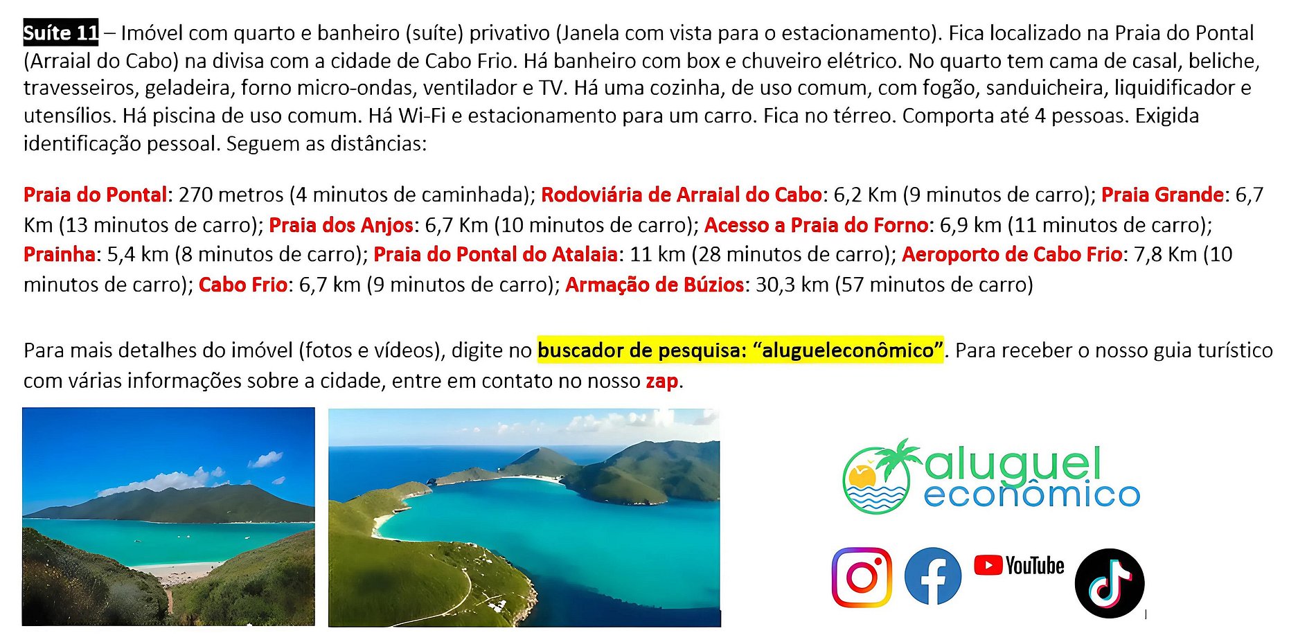 Dirección del alojamiento: RJ-140 - Praia do Pontal, Arraial do Cabo - RJ (Subuai Village Arraial do Cabo) Para obtener más información sobre esta propiedad, acceda al siguiente enlace: https://www.alugueleconomico.com.br/pt/ Siga los datos de contacto para obtener más información sobre hosting: Margarete: 21 96754-7506 (Entrega de llaves) María: 21 98107-1377 Carlos Eduardo: 21 98099-1377 Nuestro correo electrónico es el siguiente: atendimento@alugueleconomico.com.br Síguenos en nuestras redes sociales: Página de Facebook: https://www.facebook.com/alugueleconomicooficial Nuestro grupo de Facebook (Aluguel Económico): https://www.facebook.com/groups/184418835538966 Nuestra página de Instagram: https://www.instagram.com/alugueleconomico_pessoa/ Perfil personal en Facebook: https://www.facebook.com/carloseduardobarros.leite.77 Página de TikTok: https://www.tiktok.com/@alugueleconomico_oficial