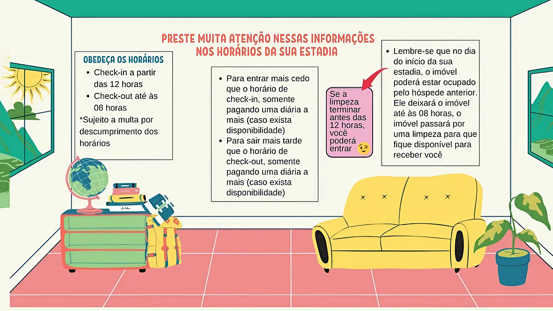 Deverá ser respeitado exatamente o Período contratado, assim como os horários de entrada e saída do apartamento;