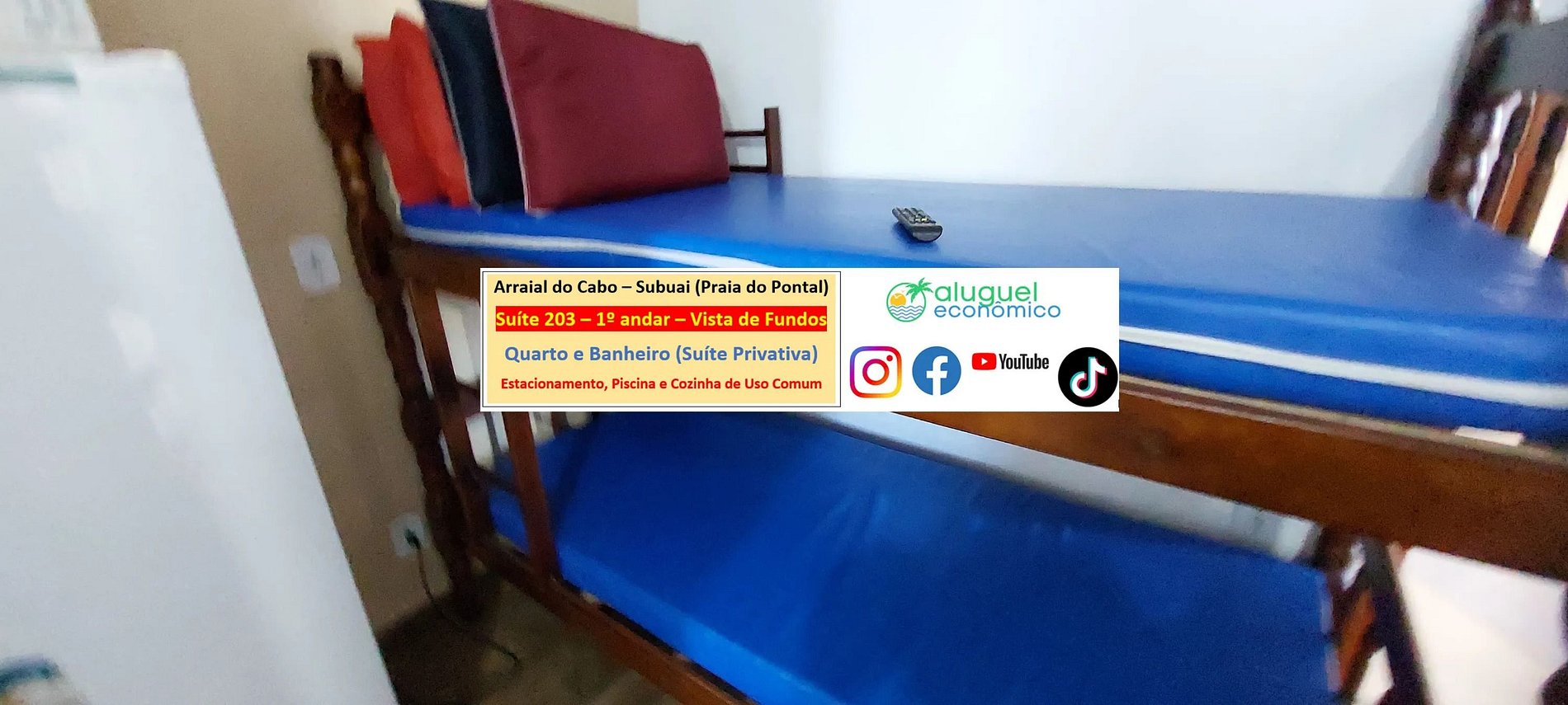 Dirección del alojamiento: RJ-140 - Praia do Pontal, Arraial do Cabo - RJ (Subuai Village Arraial do Cabo) Para obtener más información sobre esta propiedad, acceda al siguiente enlace: https://www.alugueleconomico.com.br/pt/ Siga los datos de contacto para obtener más información sobre hosting: Margarete: 21 96754-7506 (Entrega de llaves) María: 21 98107-1377 Carlos Eduardo: 21 98099-1377 Nuestro correo electrónico es el siguiente: atendimento@alugueleconomico.com.br Síguenos en nuestras redes sociales: Página de Facebook: https://www.facebook.com/alugueleconomicooficial Nuestro grupo de Facebook (Aluguel Económico): https://www.facebook.com/groups/184418835538966 Nuestra página de Instagram: https://www.instagram.com/alugueleconomico_pessoa/ Perfil personal en Facebook: https://www.facebook.com/carloseduardobarros.leite.77 Página de TikTok: https://www.tiktok.com/@alugueleconomico_oficial