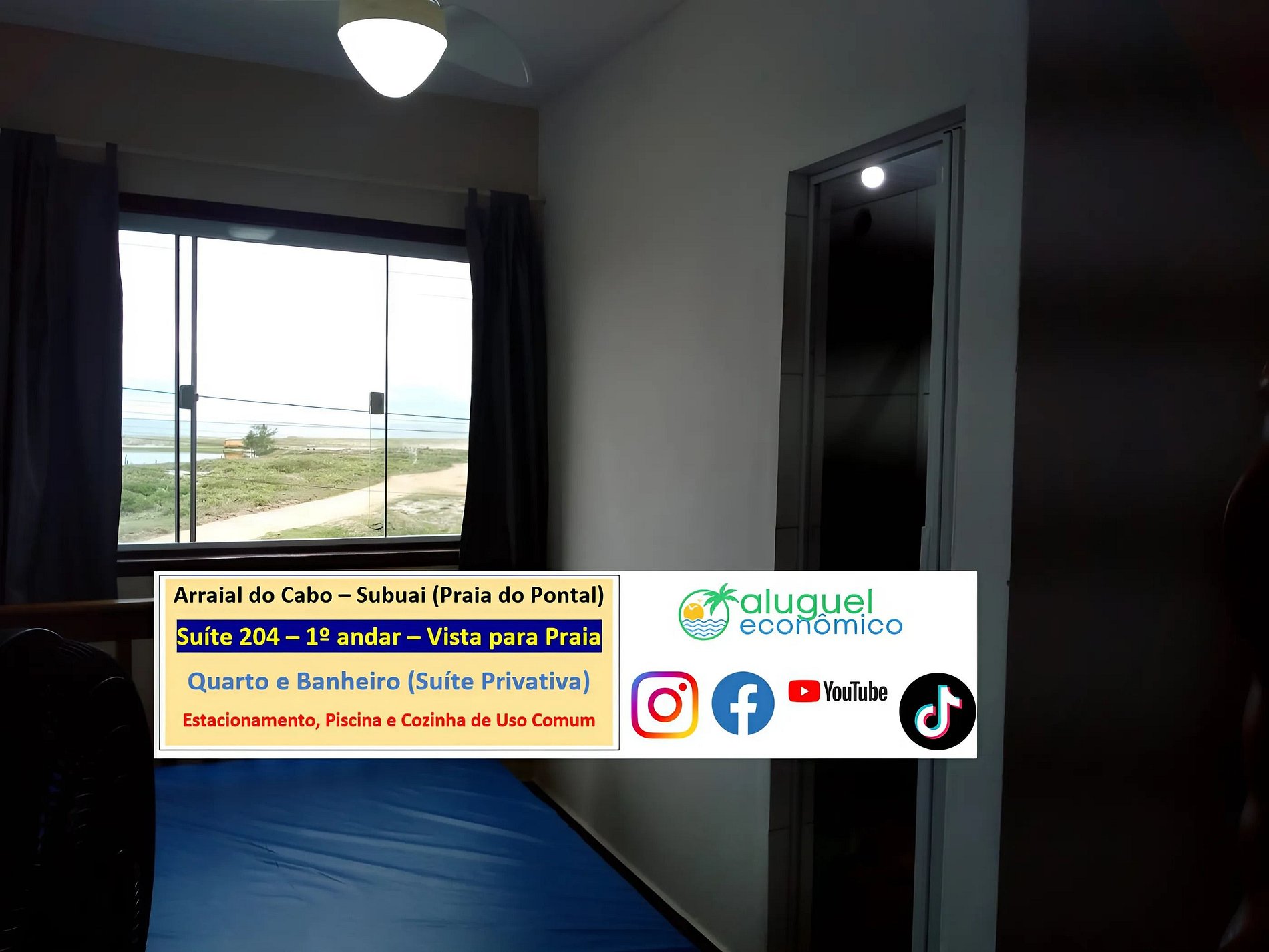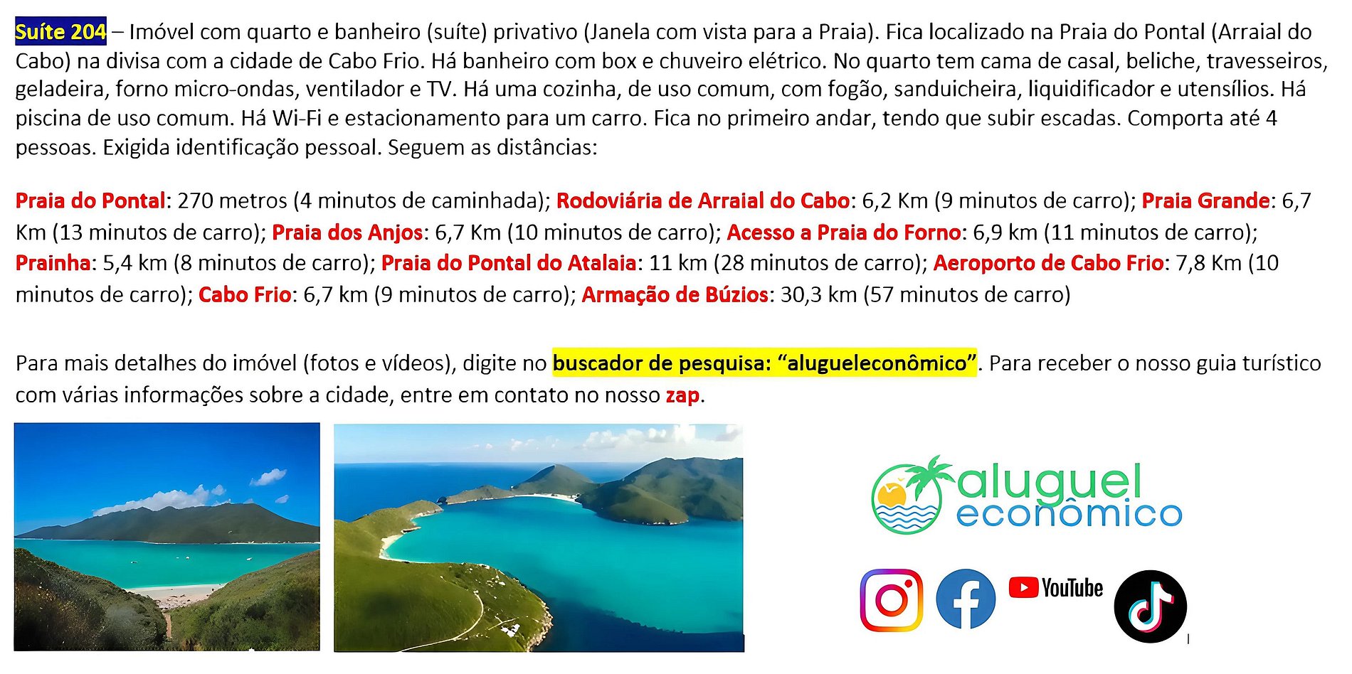 Dirección del alojamiento: RJ-140 - Praia do Pontal, Arraial do Cabo - RJ (Subuai Village Arraial do Cabo) Para obtener más información sobre esta propiedad, acceda al siguiente enlace: https://www.alugueleconomico.com.br/pt/ Siga los datos de contacto para obtener más información sobre hosting: Margarete: 21 96754-7506 (Entrega de llaves) María: 21 98107-1377 Carlos Eduardo: 21 98099-1377 Nuestro correo electrónico es el siguiente: atendimento@alugueleconomico.com.br Síguenos en nuestras redes sociales: Página de Facebook: https://www.facebook.com/alugueleconomicooficial Nuestro grupo de Facebook (Aluguel Económico): https://www.facebook.com/groups/184418835538966 Nuestra página de Instagram: https://www.instagram.com/alugueleconomico_pessoa/ Perfil personal en Facebook: https://www.facebook.com/carloseduardobarros.leite.77 Página de TikTok: https://www.tiktok.com/@alugueleconomico_oficial