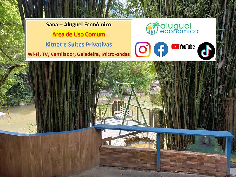 Imóvel privativo (quarto e banheiro), na beira do Rio Macaé. Local para o descanso e sossego. Fica a 3,5 do Centro do Sana. Região com várias cachoeiras. No quarto tem cama de casal, cama de solteiro, ventilador, TV, geladeira e micro-ondas. No banheiro bem box e chuveiro elétrico. Na cozinha, de uso comum, tem fogão e utensílios de cozinha. Wi-Fi disponível. Estacionamento pago a parte. É exigida identificação pessoal. Não oferecemos roupa de cama, banho e nem produtos de higiene pessoal.