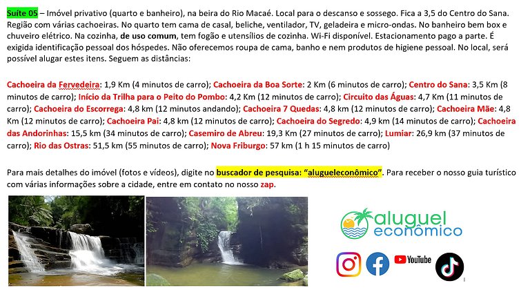Endereço da Hospedagem: Estrada do Sana, 50 - Sana - Macaé - RJ Para mais informações sobre este imóvel, acesse, por favor, o seguinte link: https://www.alugueleconomico.com.br/pt/ Segue os contatos para mais informações sobre a hospedagem: Os nossos números de WhatsApp para contato são os seguintes: Sr. Luiz: 22 99771-3863 (entrega das chaves - combinar com um dia de antecedência) Mara: 21 98107-1377; Carlos Eduardo: 21 98099-1377 O nosso e-mail é o seguinte: atendimento@alugueleconomico.com.br Nos siga nas nossas redes sociais: Youtube: https://www.youtube.com/@alugueleconomico7772 Facebook: https://www.facebook.com/alugueleconomicooficial Instagram: https://www.instagram.com/alugueleconomico_temporada/ TikTok: https://www.tiktok.com/@alugueleconomico_oficial Perfil pessoal no Facebook: https://www.facebook.com/carloseduardobarros.leite.77