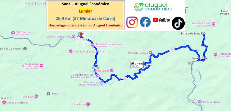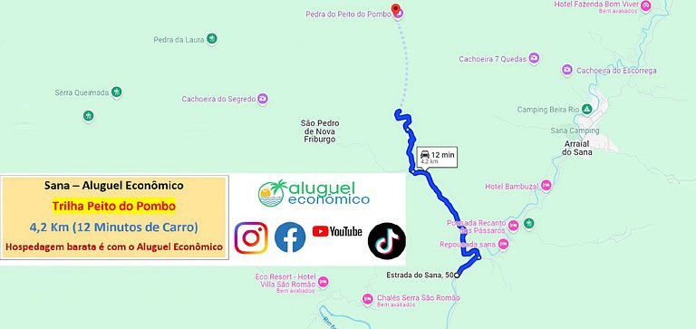 O endereço do imóvel é Estrada do Sana, 50. Fica antes de chegar ao Centro do Sana. Fica próximo ao Rancho do Boiadeiro. A distância para o Centro corresponde a 3,5 km. Segue as distâncias: Cachoeira da Fervedeira: 1,9 km (4 minutos de carro) Cachoeira da Boa Sorte: 2 km (6 minutos de carro) Centro de Sana: 3,5 km (8 minutos de carro) Início da trilha para o Peito do Pombo: 4,2 km (12 minutos de carro) O Circuito das Águas (4,7 km - 11 minutos de carro) tem como principais atrações as Cachoeiras do Escorrega, Sete Quedas, Mãe e Pai, além de outros poços para mergulho. Cachoeira do Escorrega: 4,8 km (12 minutos de carro), mais caminhada até a cachoeira; Cachoeira Sete Quedas: 4,8 km (12 minutos de carro), mais caminhada até a cachoeira; Cachoeira Mãe: 4,8 km (12 minutos de carro), mais caminhada até a cachoeira; Cachoeira Pai: 4,8 km (12 minutos de carro), mais caminhada até a cachoeira Cachoeira do Segredo: 4,9 km (14 minutos de carro) mais caminhada até a cachoeira; Cachoeira das Andorinhas: 15,5 km (34 minutos de carro) Casemiro de Abreu: 19,3 km (27 minutos de carro) Lumiar: 26,9 km (37 minutos de carro) Rio das Ostras: 51,5 km (55 minutos de carro) Nova Friburgo: 57 km (1 horas e 15 minutos de carro)