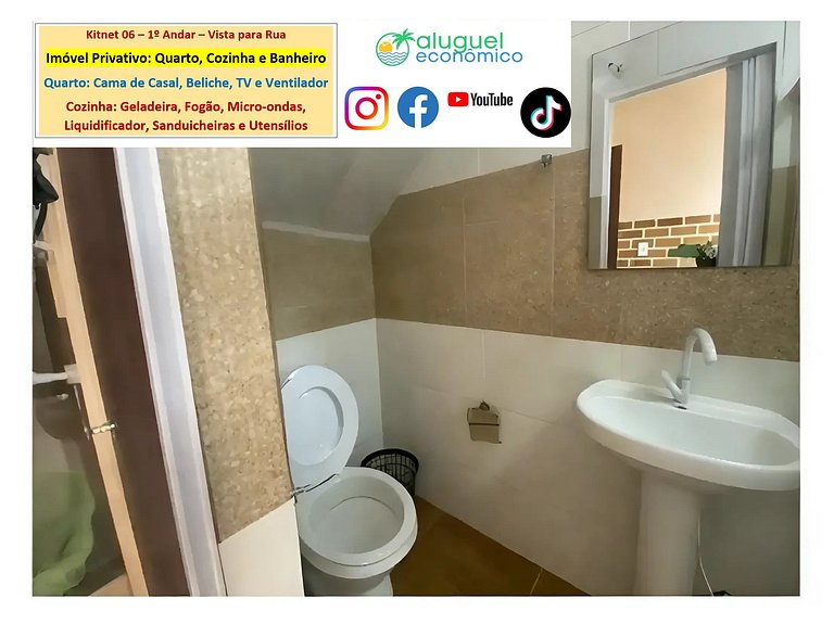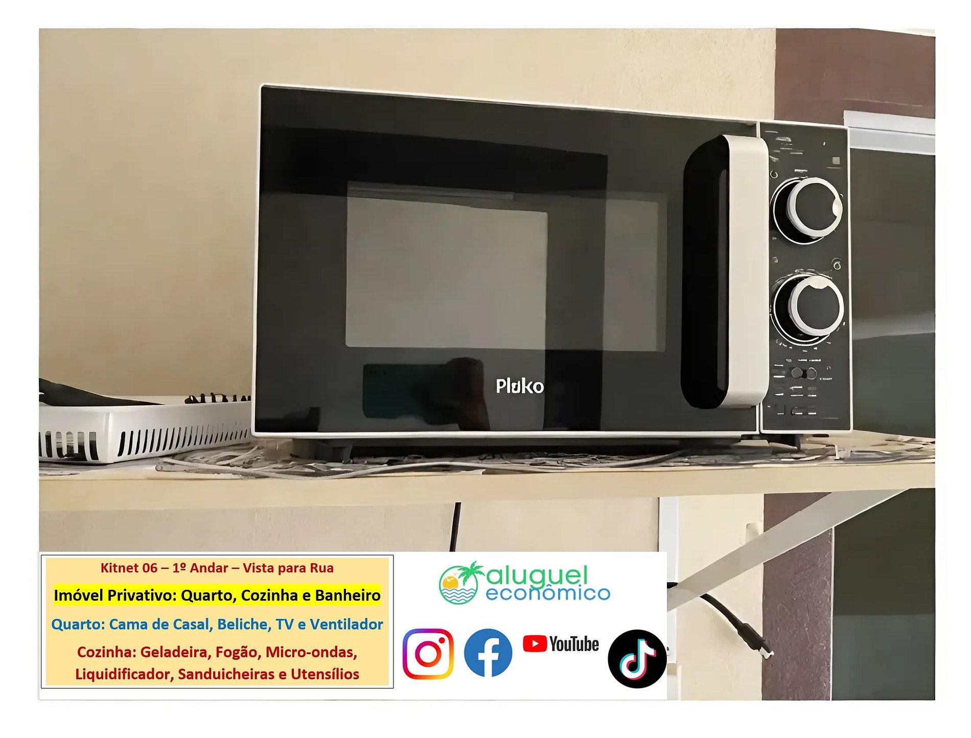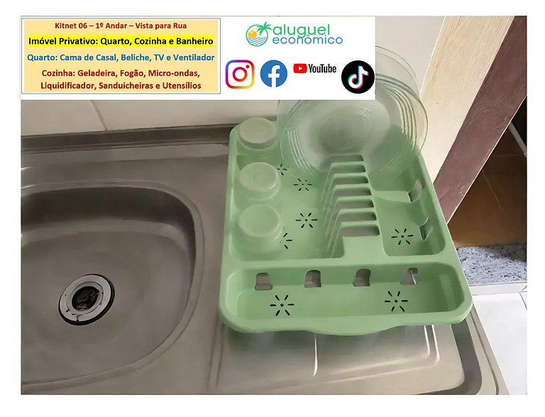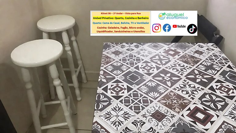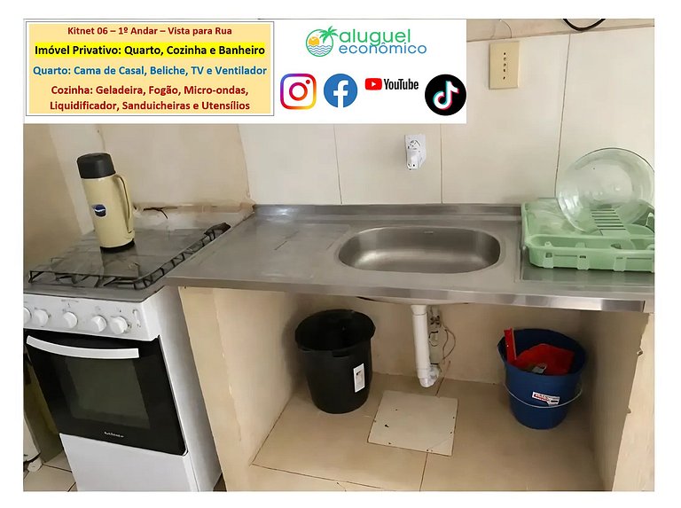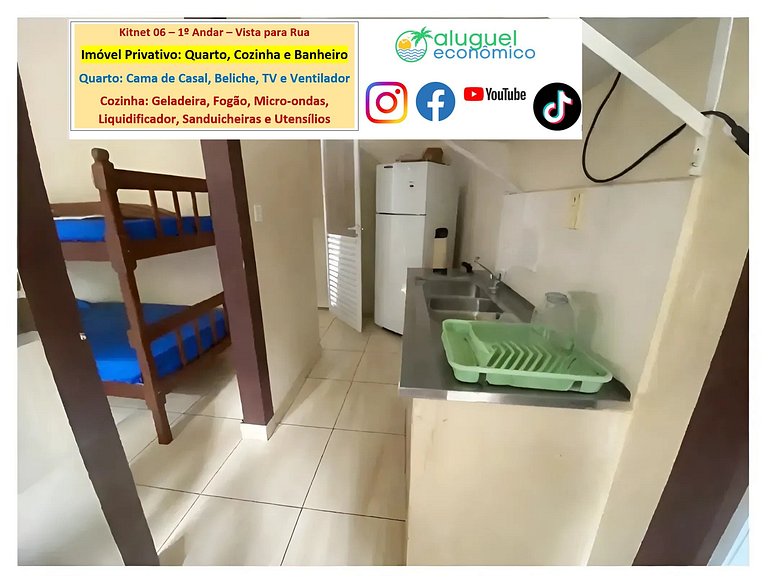 Kitnet privativa com quarto, cozinha e banheiro. No quarto há cama casal, beliche, TV e ventilador. Cozinha com geladeira, fogão, micro-ondas, sanduicheira, liquidificador, utensílios de cozinha. Banheiro com box e chuveiro elétrico. Há Wi-Fi. O prédio fica atrás da delegacia, sendo um local seguro para deixar o veículo na rua gratuitamente. O imóvel fica no primeiro andar, tendo que subir escadas. Janela com vista para a Rua. É exigida identificação pessoal dos hóspedes. Enxoval não incluso.