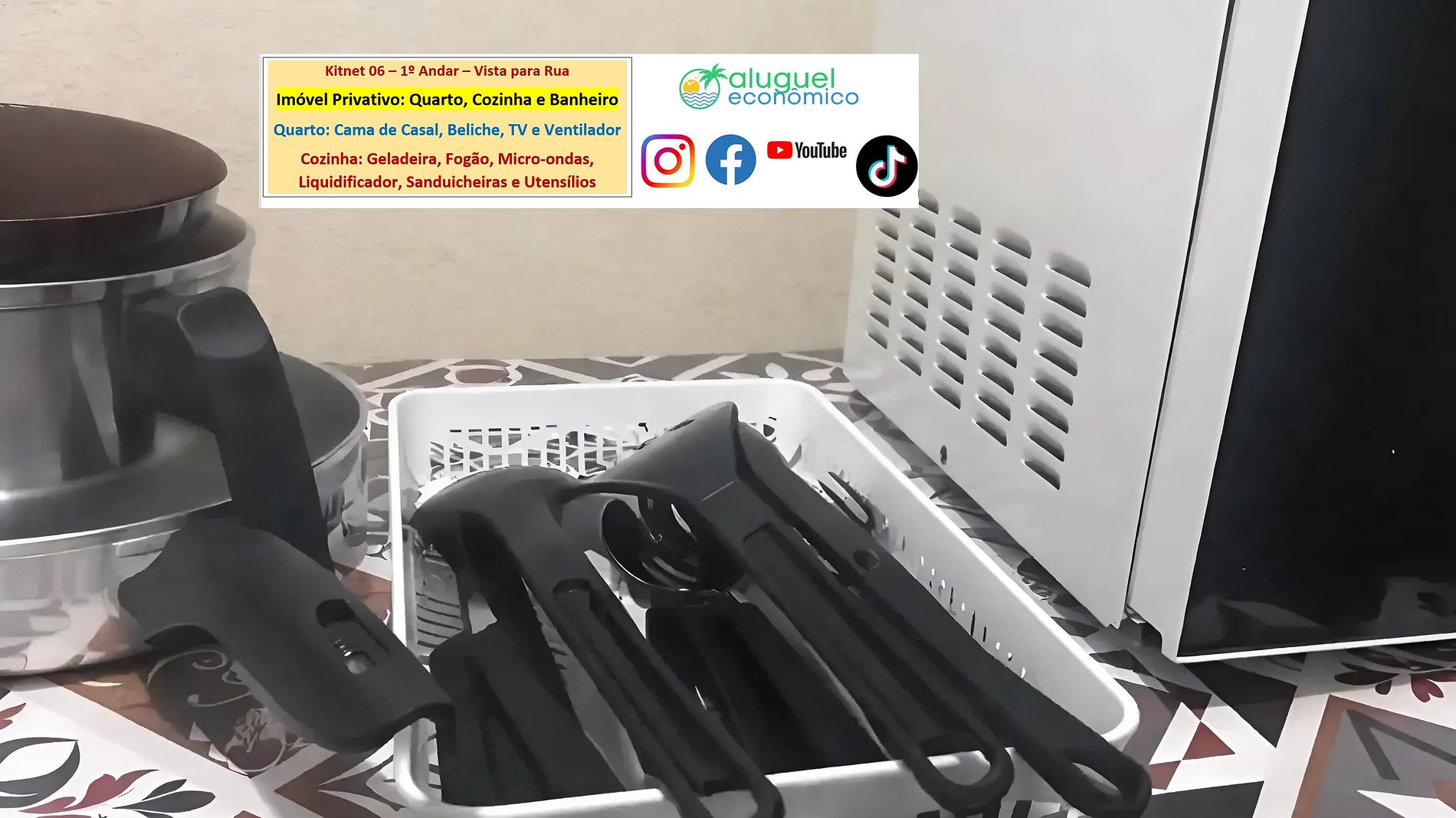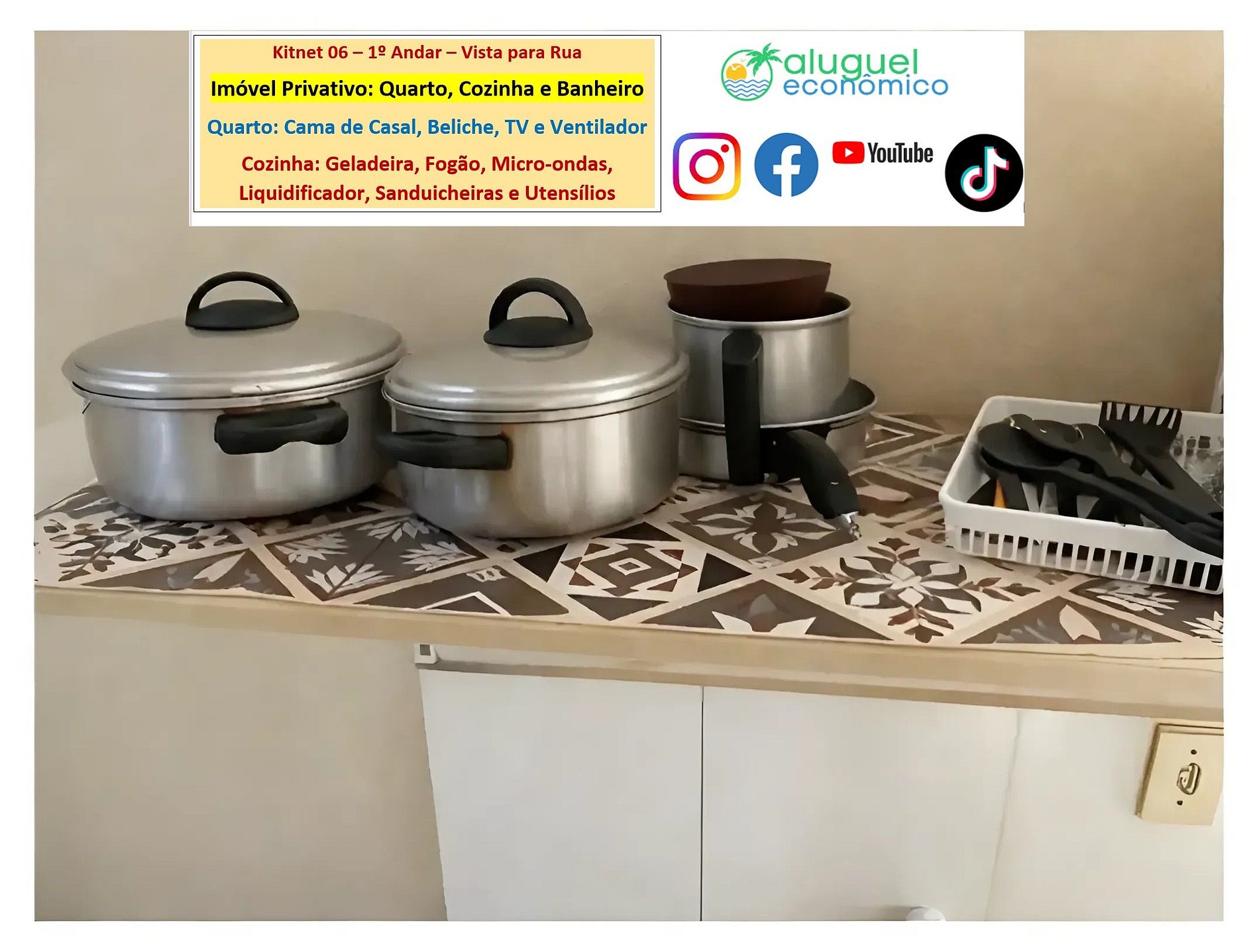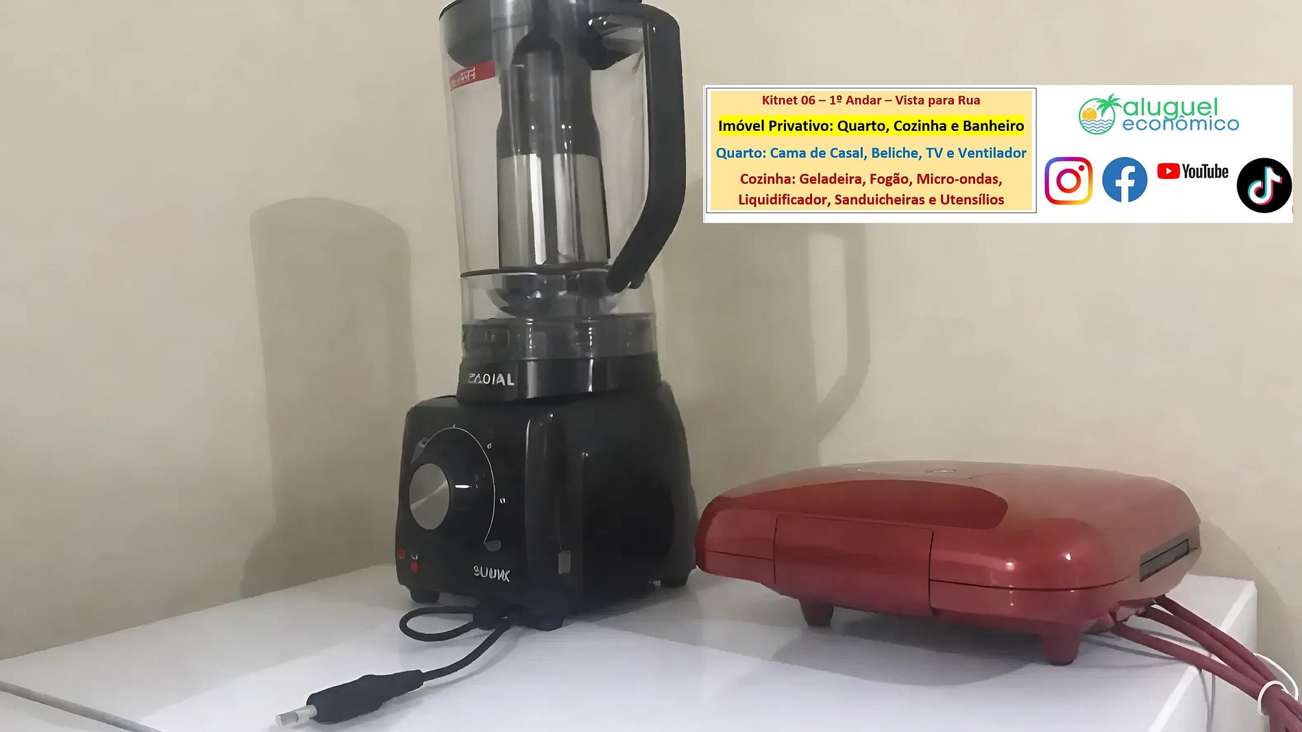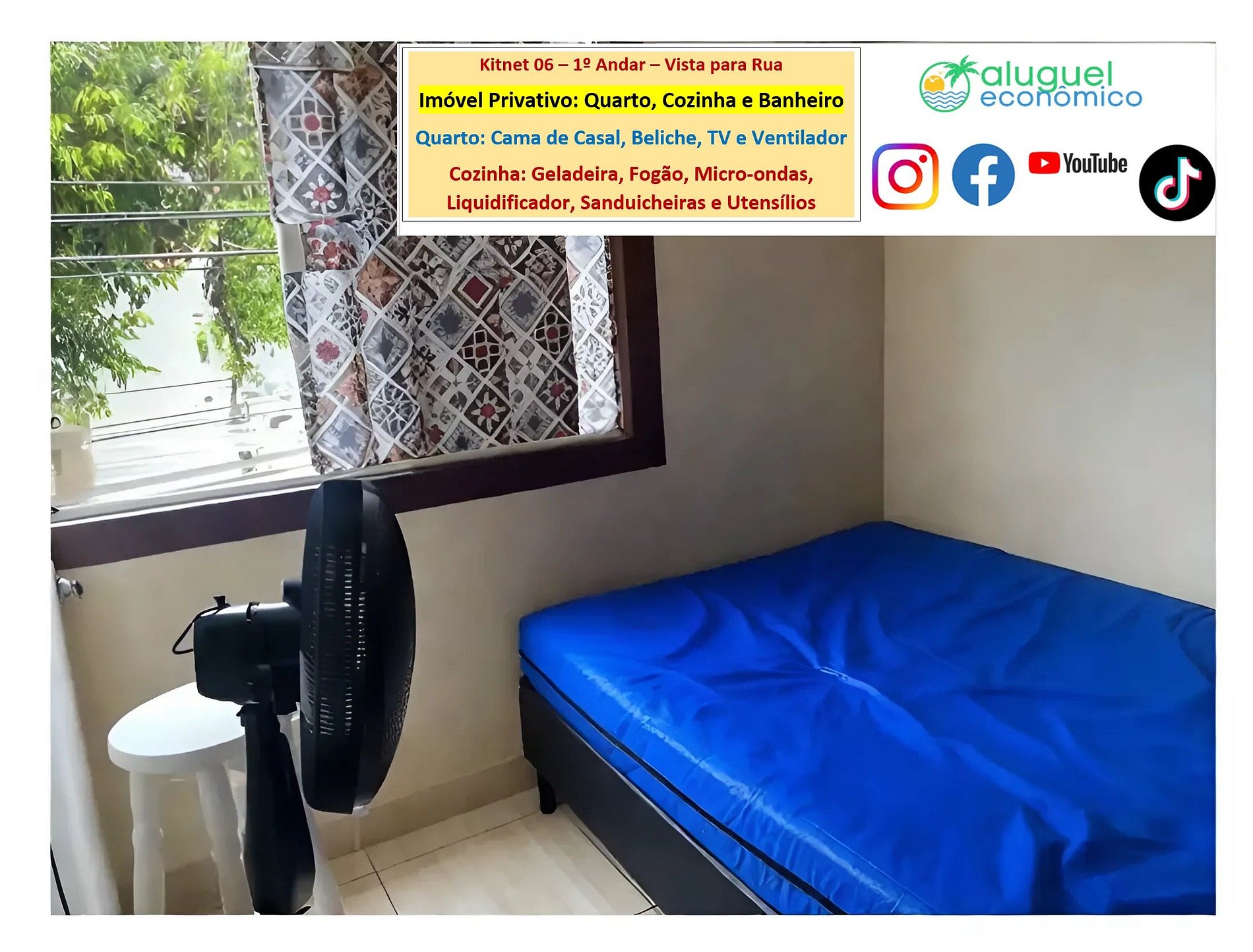 Kitnet privativa com quarto, cozinha e banheiro. No quarto há cama casal, beliche, TV e ventilador. Cozinha com geladeira, fogão, micro-ondas, sanduicheira, liquidificador, utensílios de cozinha. Banheiro com box e chuveiro elétrico. Há Wi-Fi. O prédio fica atrás da delegacia, sendo um local seguro para deixar o veículo na rua gratuitamente. O imóvel fica no primeiro andar, tendo que subir escadas. Janela com vista para a Rua. É exigida identificação pessoal dos hóspedes. Enxoval não incluso.