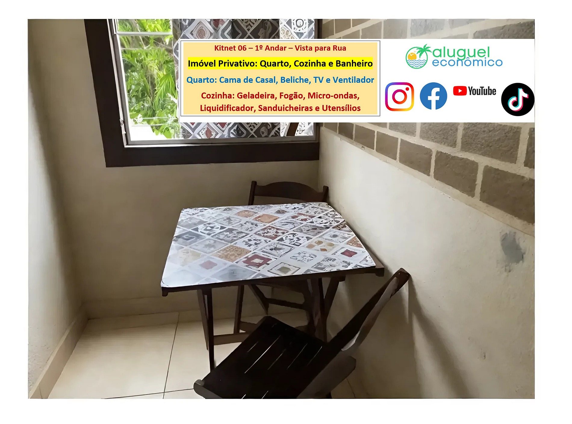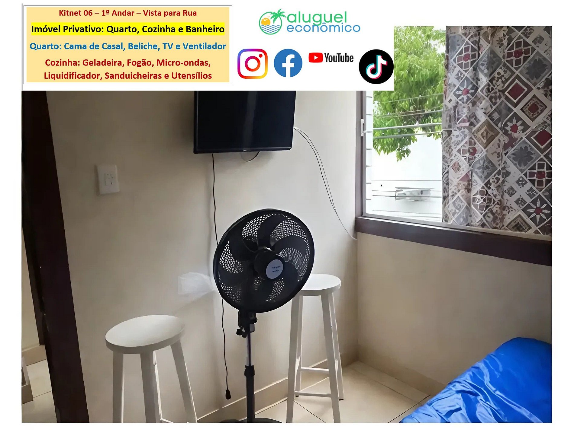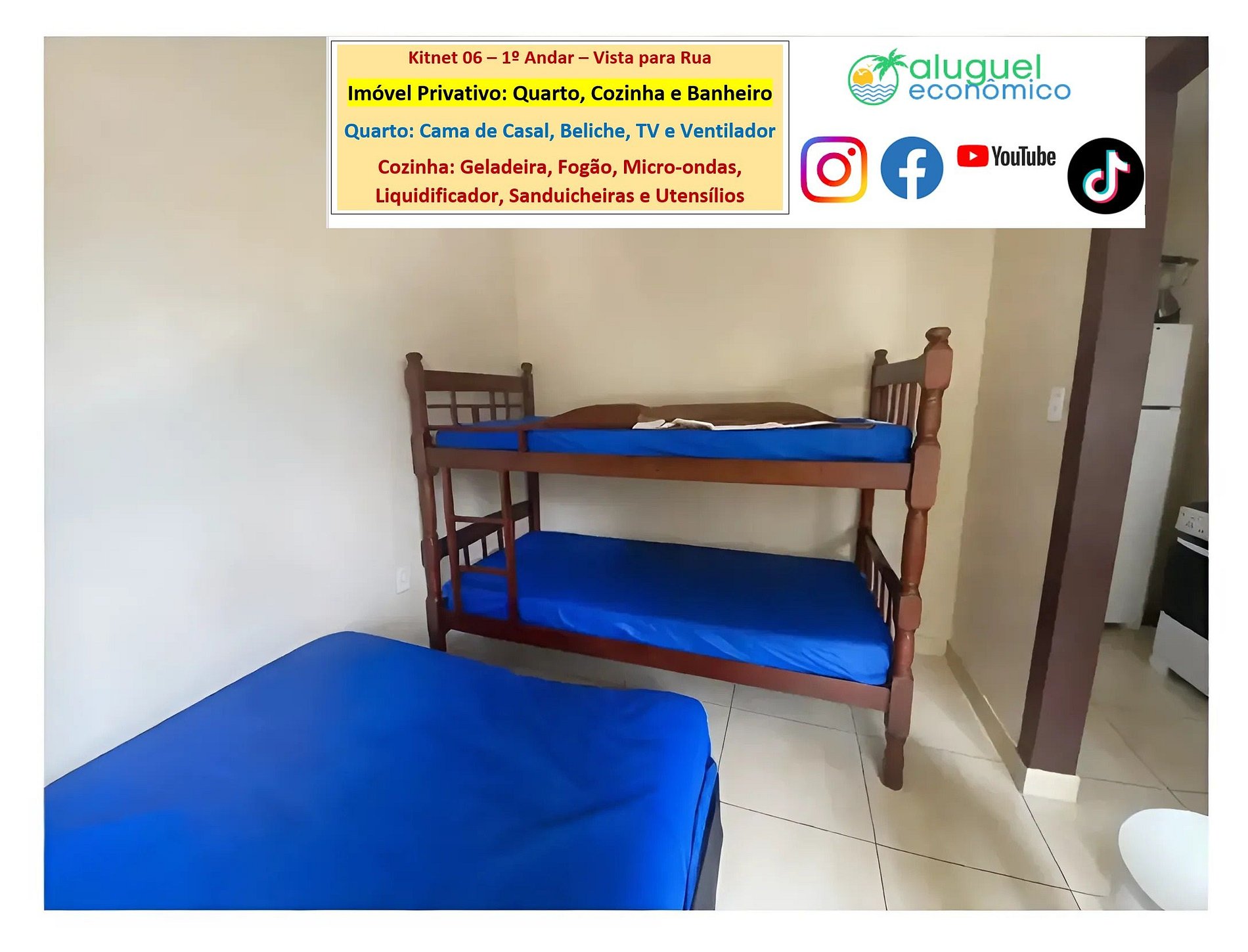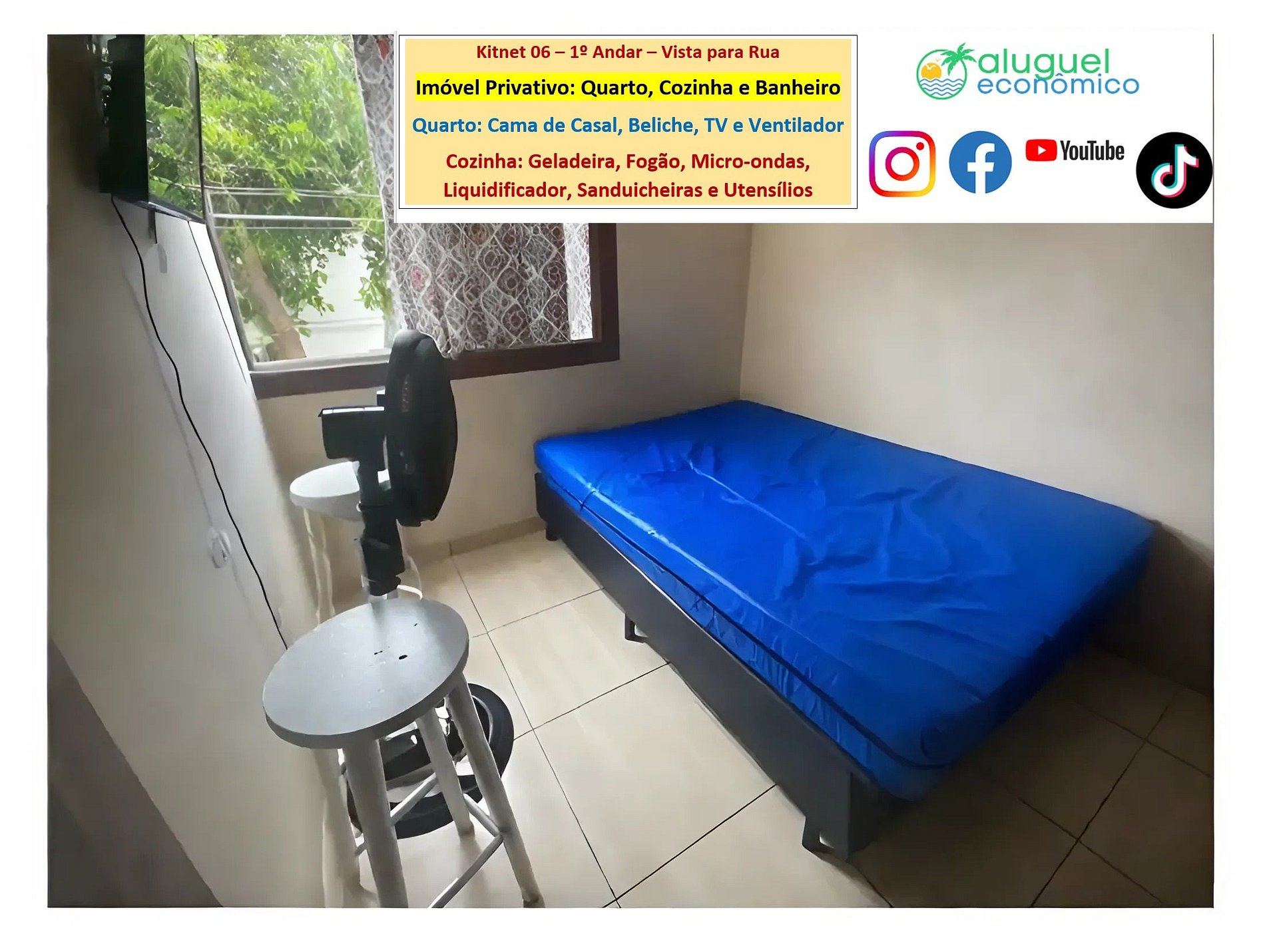 Kitnet privativa com quarto, cozinha e banheiro. No quarto há cama casal, beliche, TV e ventilador. Cozinha com geladeira, fogão, micro-ondas, sanduicheira, liquidificador, utensílios de cozinha. Banheiro com box e chuveiro elétrico. Há Wi-Fi. O prédio fica atrás da delegacia, sendo um local seguro para deixar o veículo na rua gratuitamente. O imóvel fica no primeiro andar, tendo que subir escadas. Janela com vista para a Rua. É exigida identificação pessoal dos hóspedes. Enxoval não incluso.