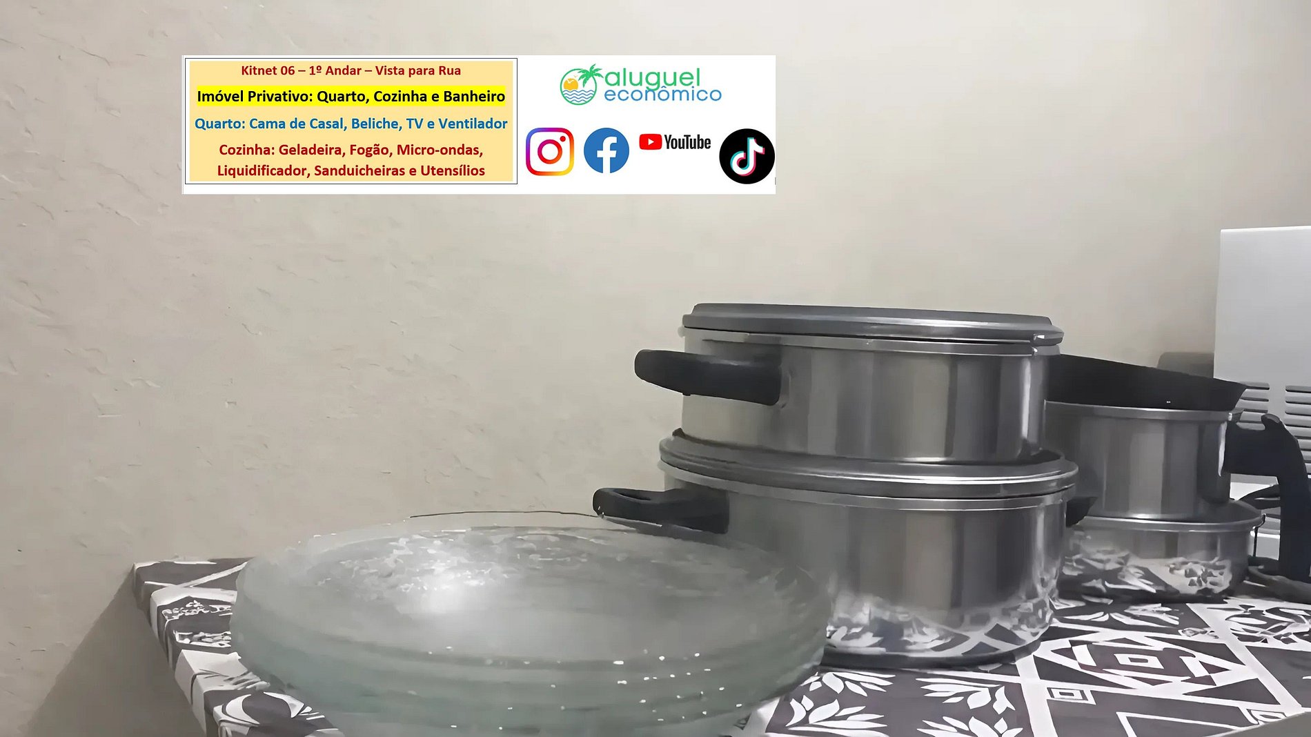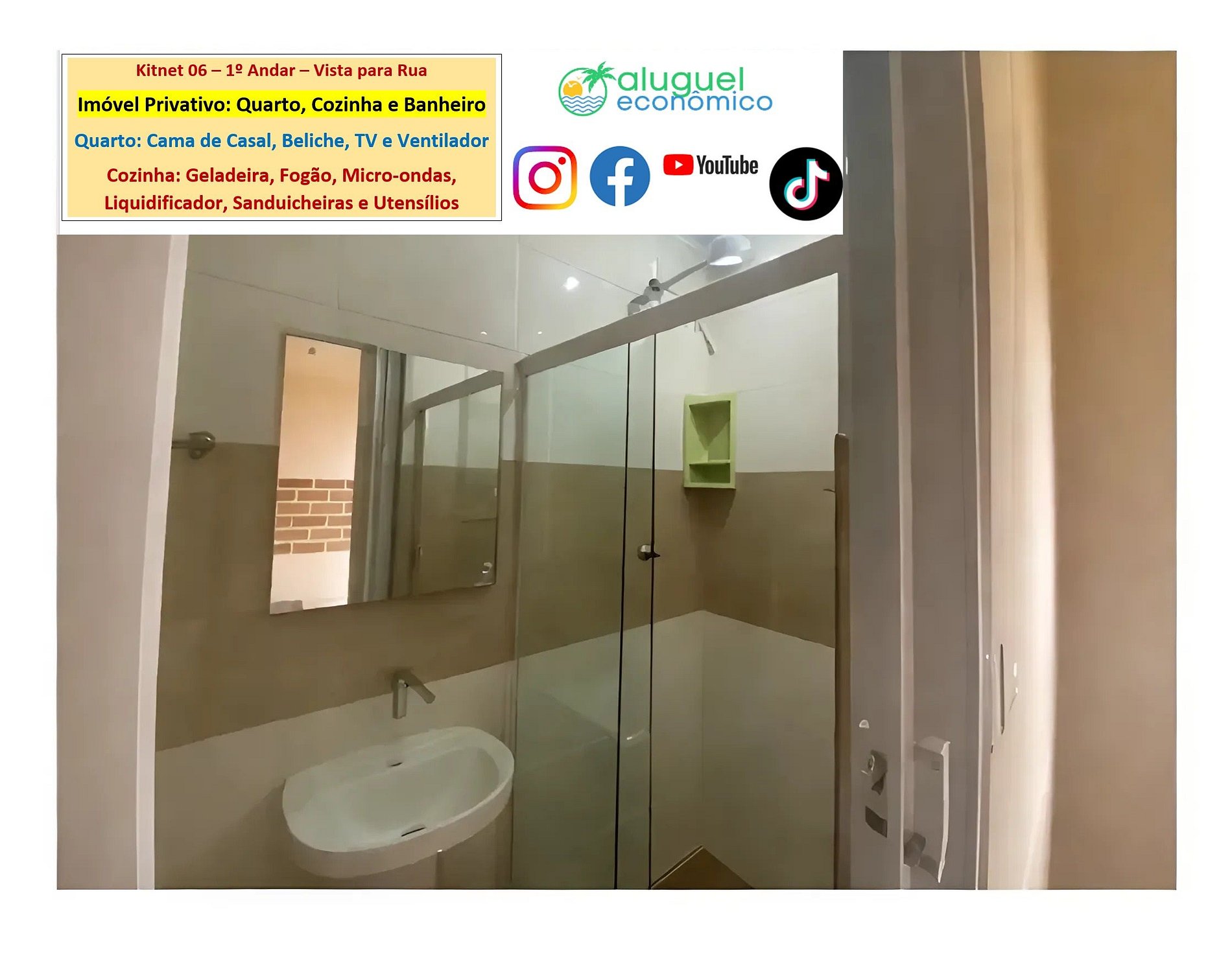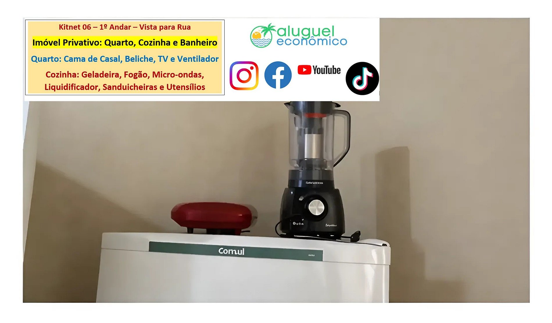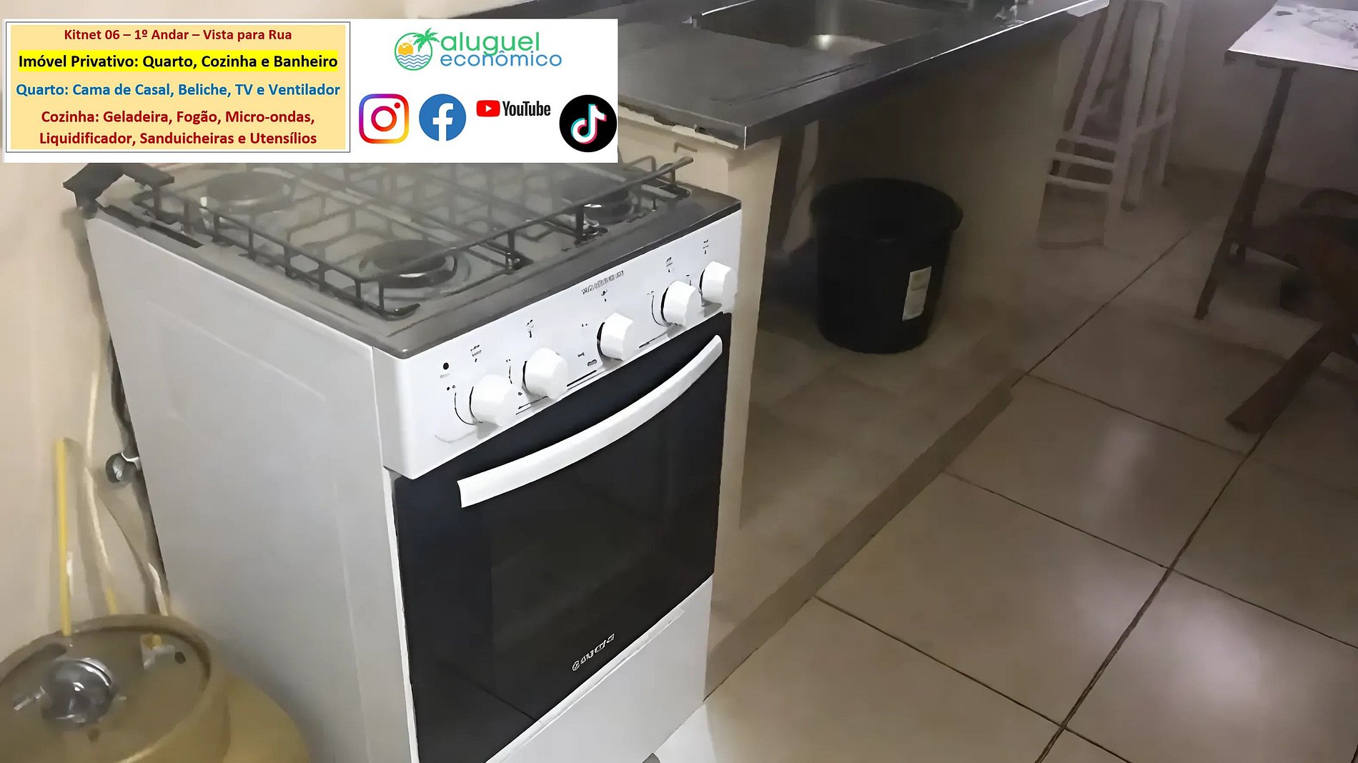 Kitnet privativa com quarto, cozinha e banheiro. No quarto há cama casal, beliche, TV e ventilador. Cozinha com geladeira, fogão, micro-ondas, sanduicheira, liquidificador, utensílios de cozinha. Banheiro com box e chuveiro elétrico. Há Wi-Fi. O prédio fica atrás da delegacia, sendo um local seguro para deixar o veículo na rua gratuitamente. O imóvel fica no primeiro andar, tendo que subir escadas. Janela com vista para a Rua. É exigida identificação pessoal dos hóspedes. Enxoval não incluso.