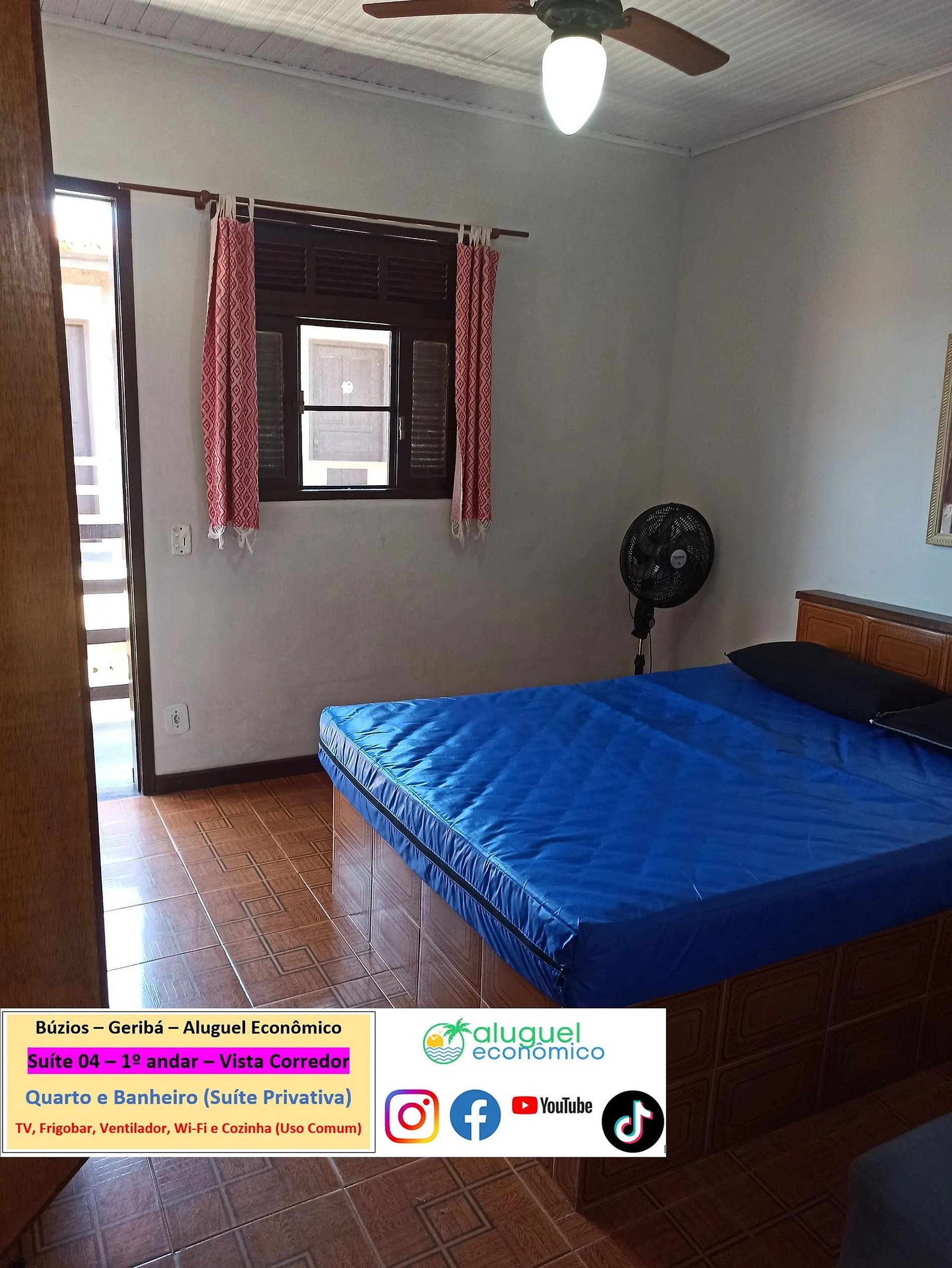 Imóvel privativo (quarto e banheiro) no 1º andar tendo que subir escada. Fica a 600 metros da Praia de Geribá. Janela com vista para o corredor. No quarto, há cama de casal, 2 sofás-camas de solteiro, armário, ventilador, TV, frigobar. No banheiro, há box com chuveiro elétrico. Há cozinha, de uso comum, com fogão, forno micro-ondas, liquidificador, sanduicheira, Airfryer, cafeteira e utensílios de cozinha. Wi-Fi gratuito. Estacionamento pago a parte. É exigida identificação pessoal dos hóspedes.