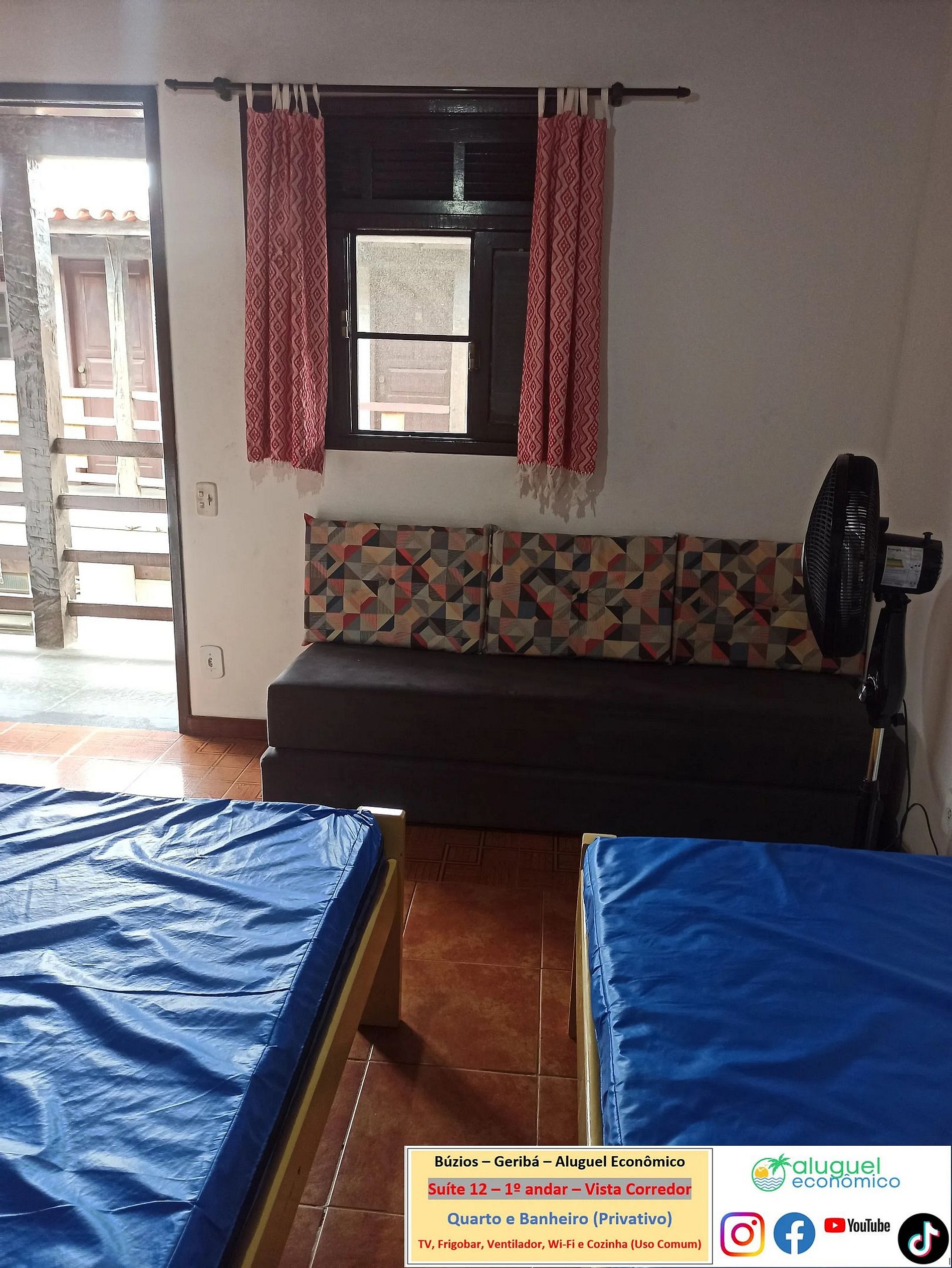 Imóvel privativo (quarto e banheiro) no 1º andar tendo que subir escada. Fica a 600 metros da Praia de Geribá. Janela com vista para o corredor. No quarto, há duas camas de solteiro e dois sofás-camas de solteiro, armário, ventilador, TV, frigobar. No banheiro, há box com chuveiro elétrico. Há cozinha, de uso comum, com fogão, forno micro-ondas, liquidificador, sanduicheira, Airfryer, cafeteira e utensílios de cozinha. Wi-Fi gratuito. Estacionaamento pago. É exigida identificação dos hóspedes.
